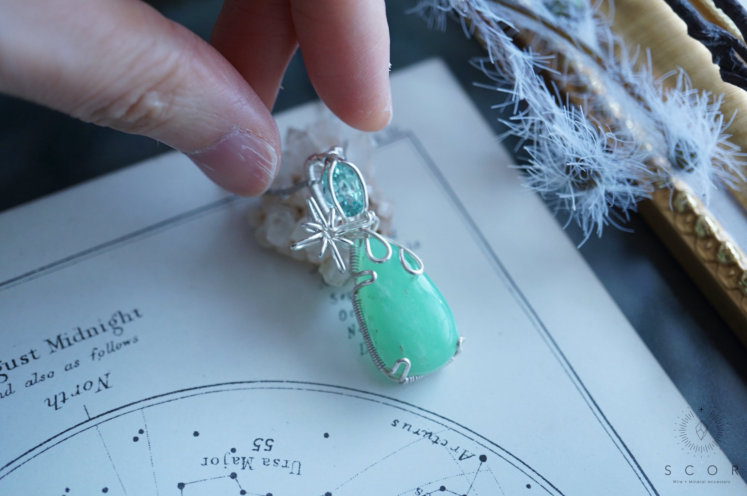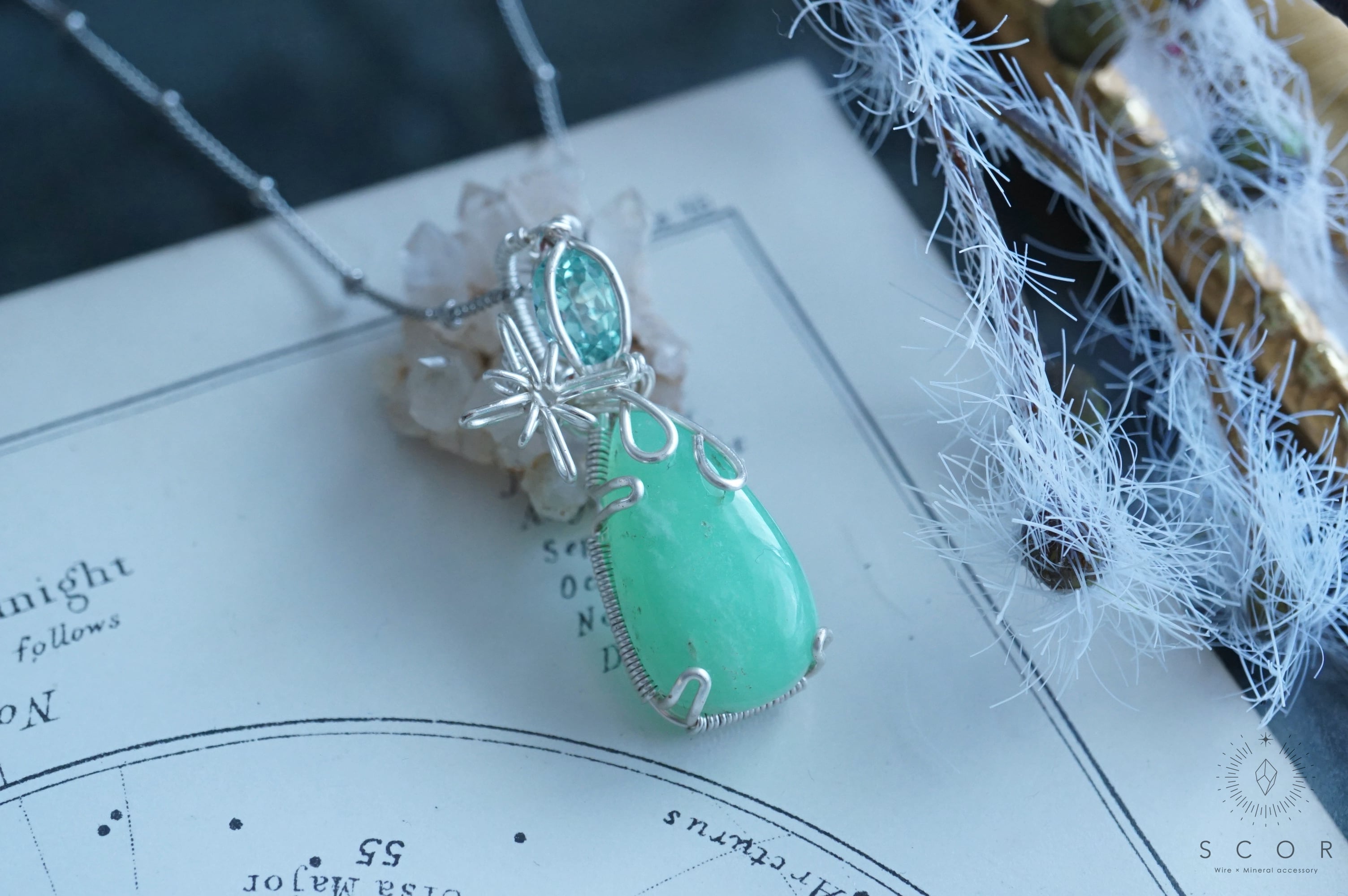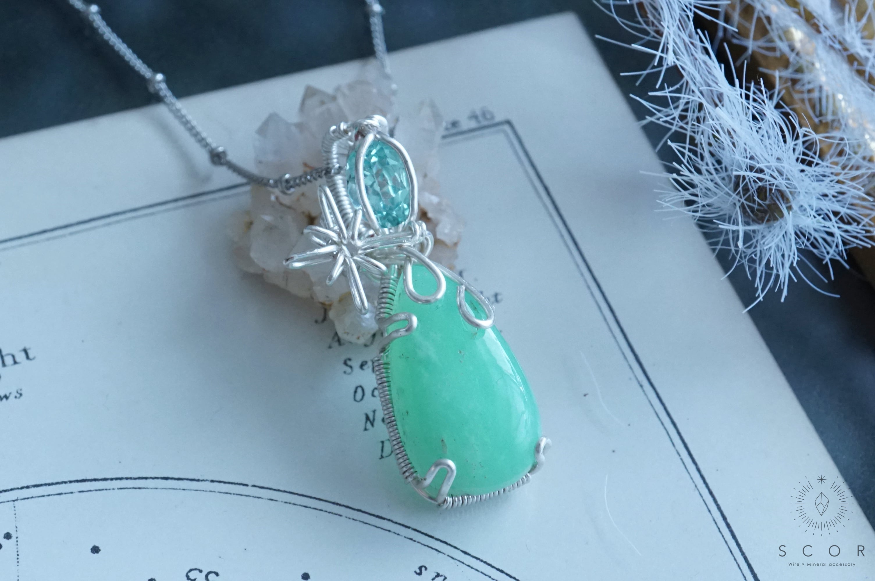 バチカンには紺碧の海を思わせるアパタイトを、二つの石の間には、流星のワイヤーモチーフを添えました。