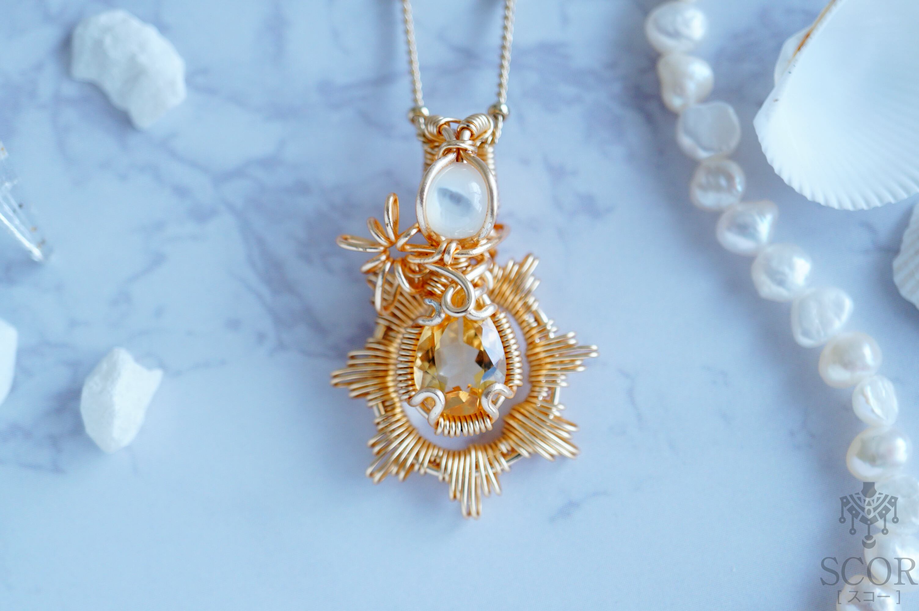 宝石質のシトリンにマザーオブパールを添えたペンダントトップです。