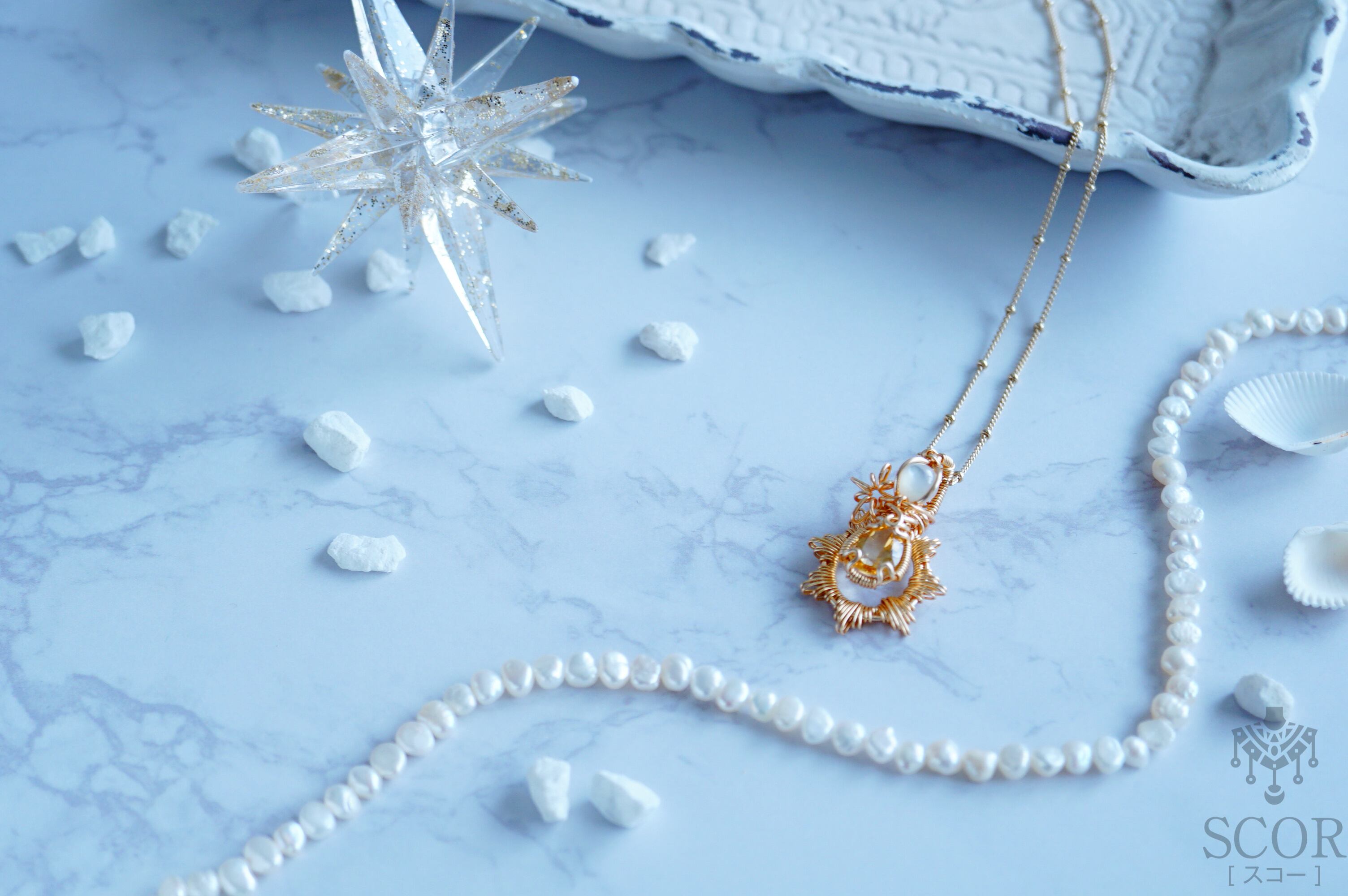 ファセットカットのシトリンを星になぞらえ、その放射光を細いワイヤー装飾で表現したデザイン。