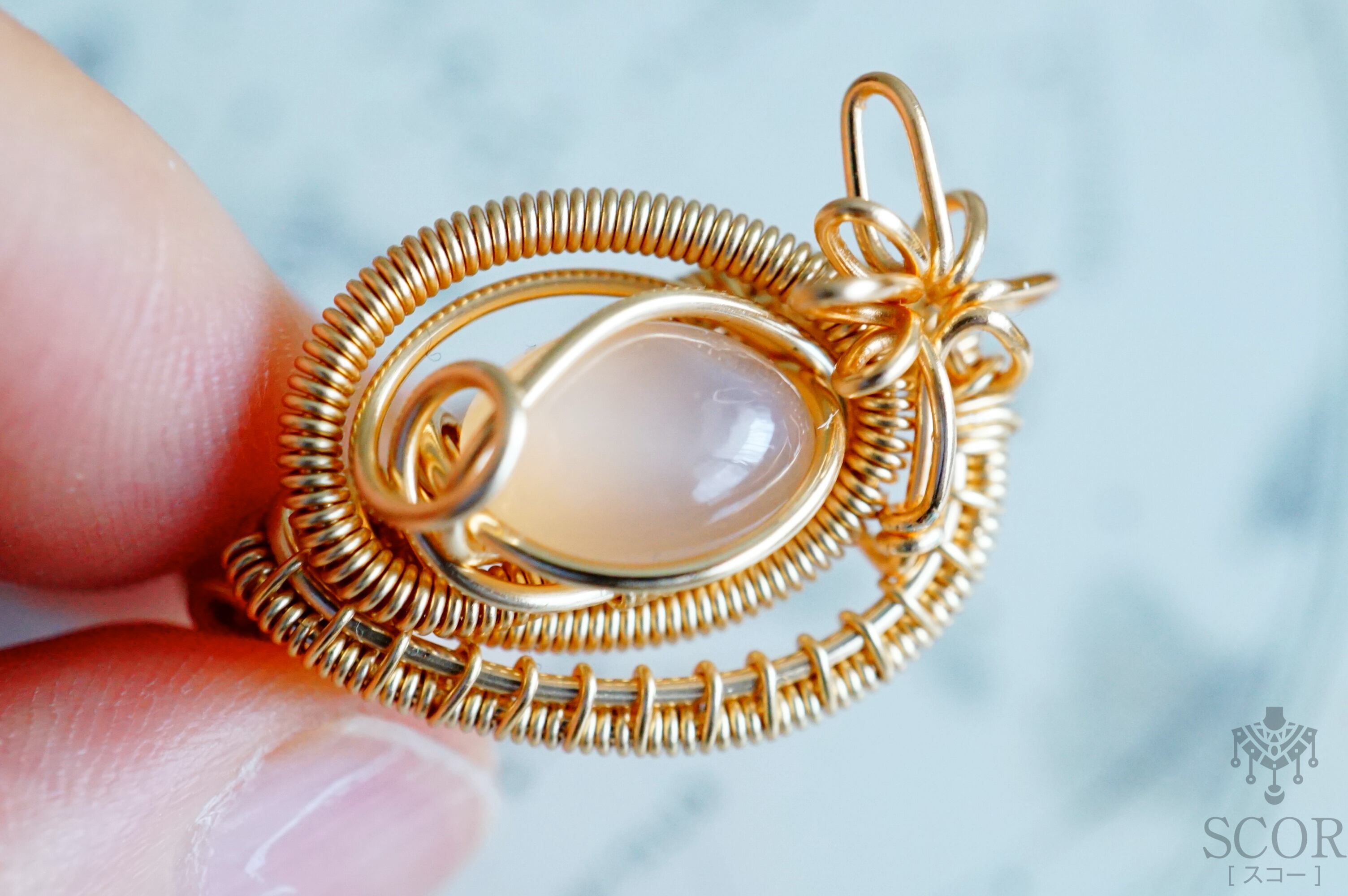 オレンジムーンストーンは透明度が高く、乳白色の光沢が美しいピースを使用。