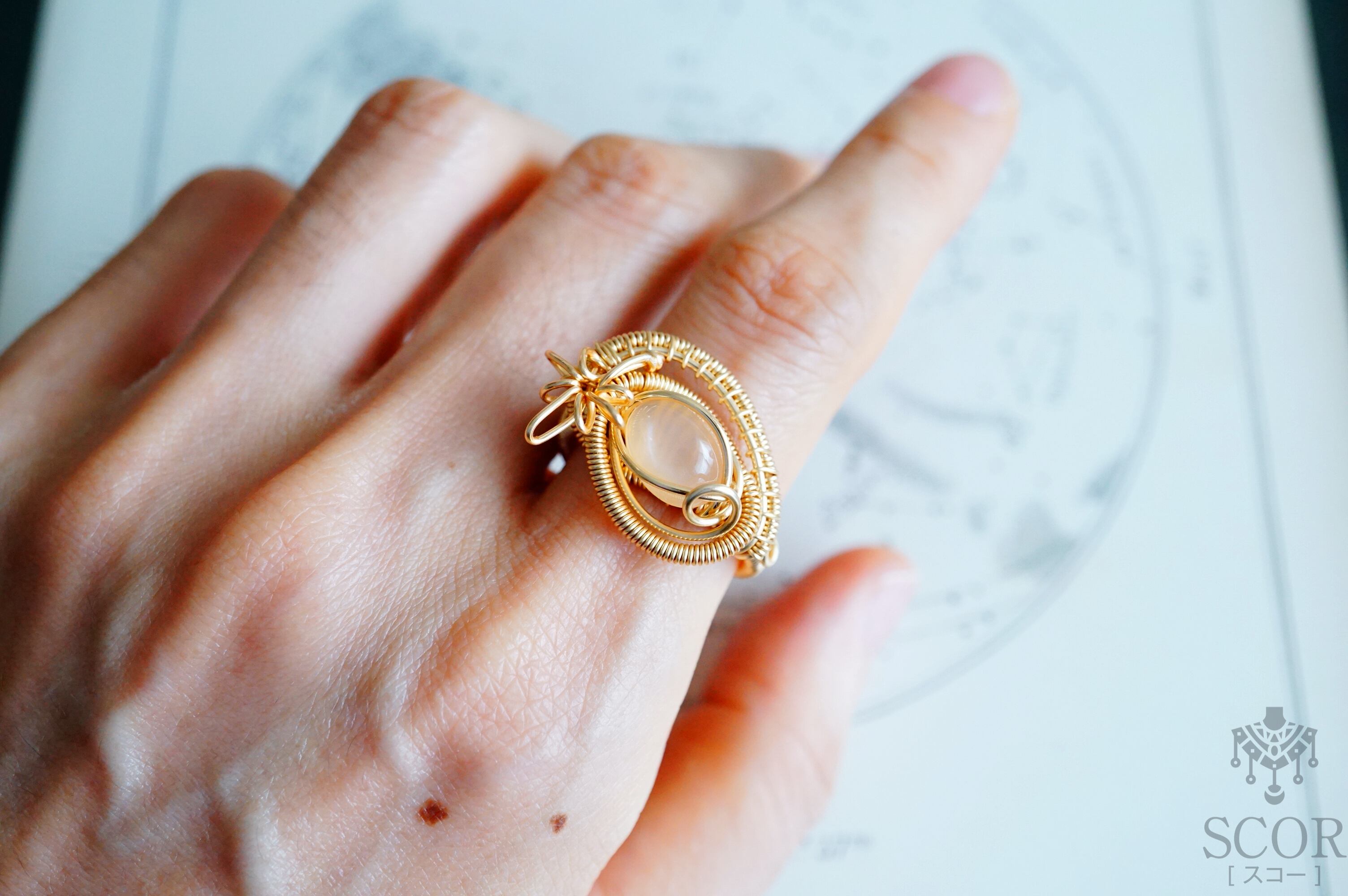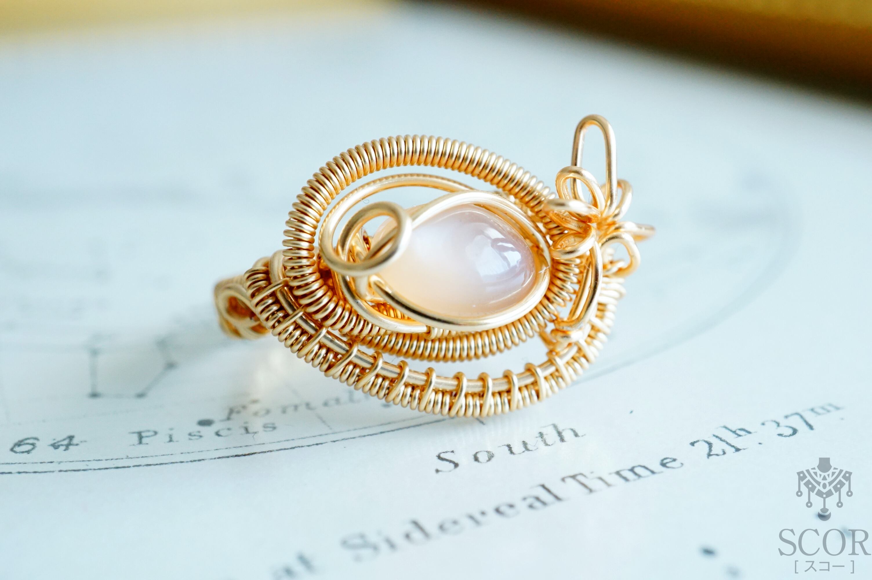 石をなだらかなカーブで取り囲む、透け感のある巻きワイヤー装飾が印象的です。