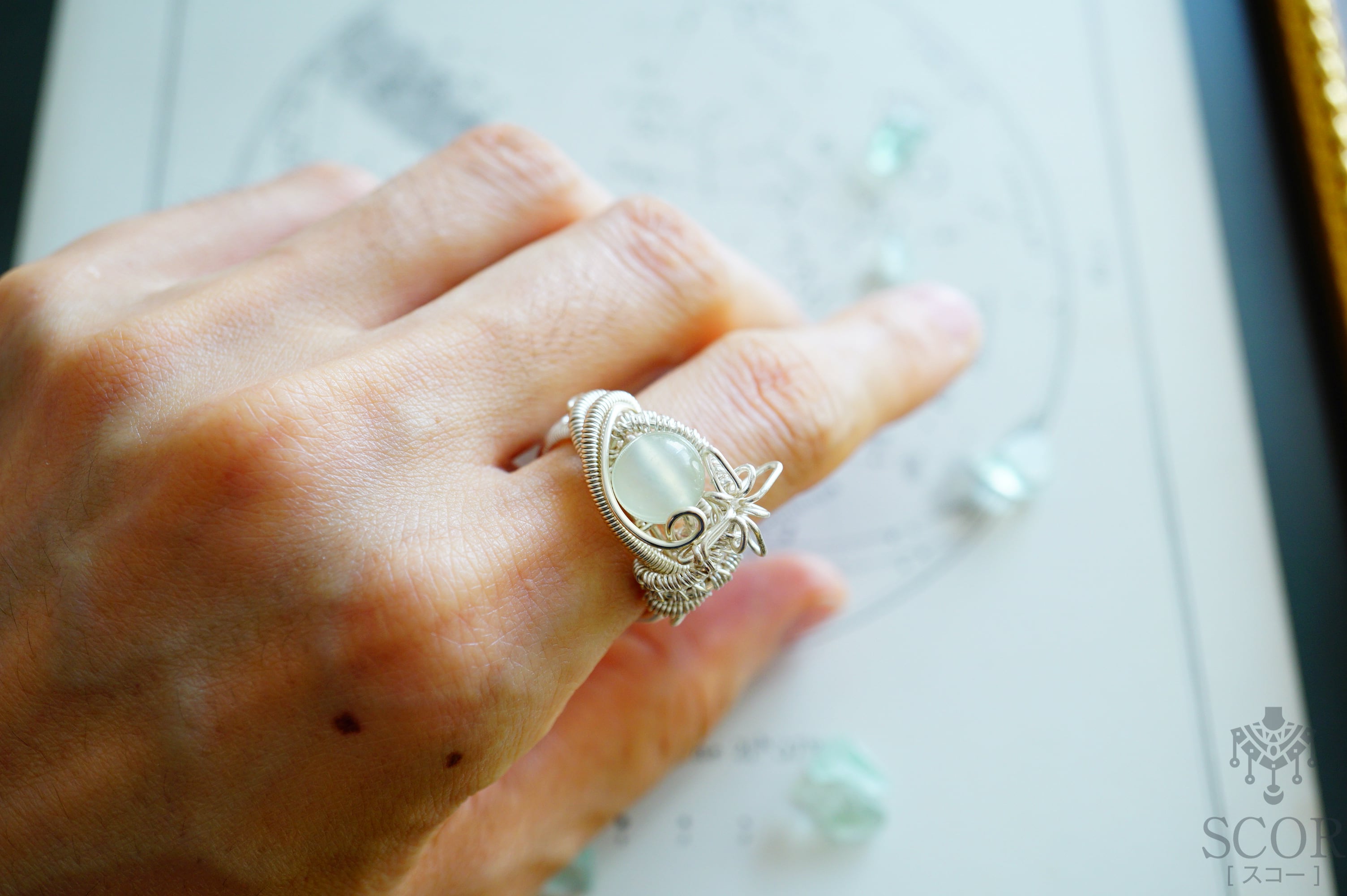 くるりと石のそばで巻いたワイヤーと、小さな光芒モチーフがポイントです。