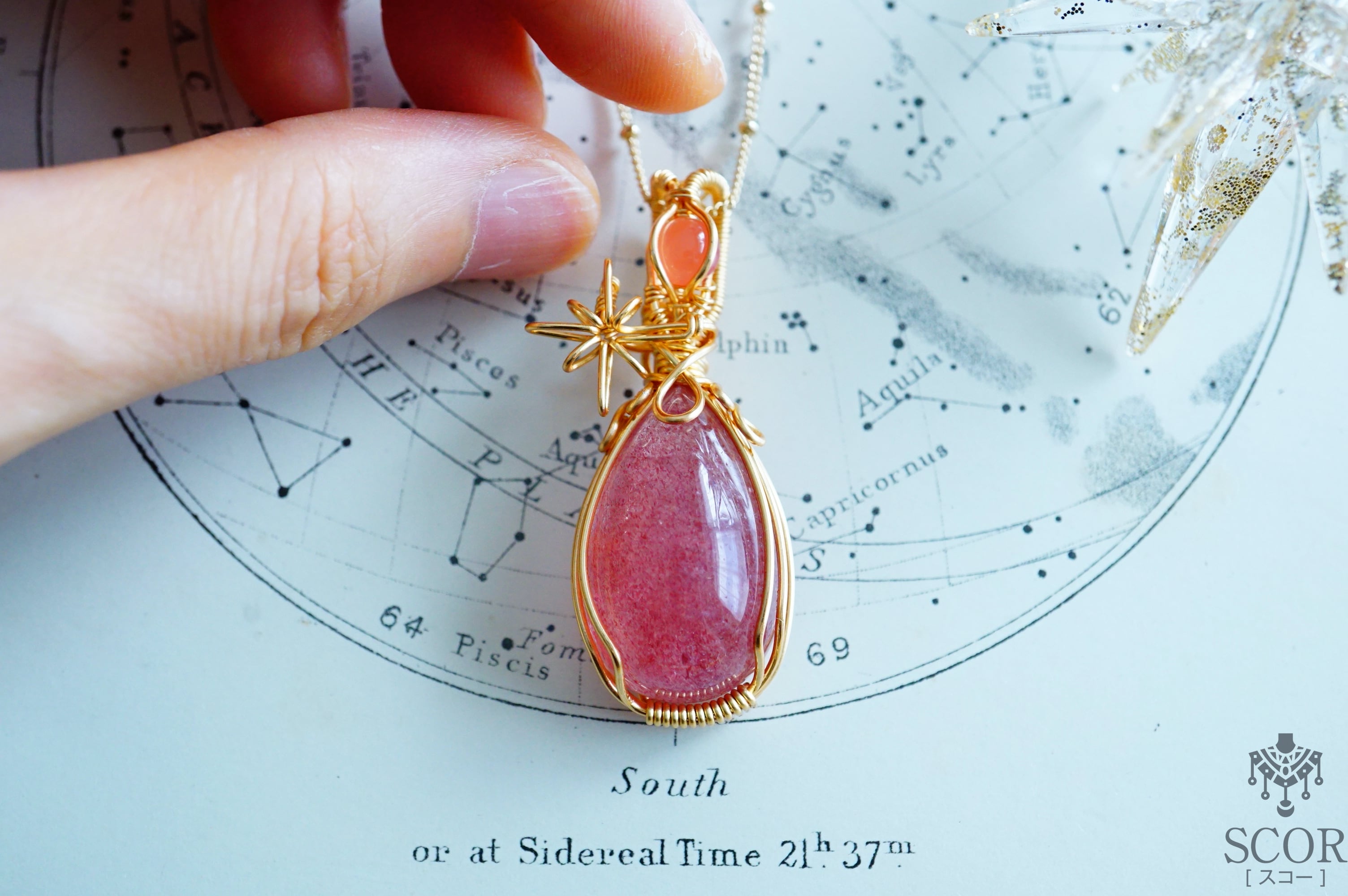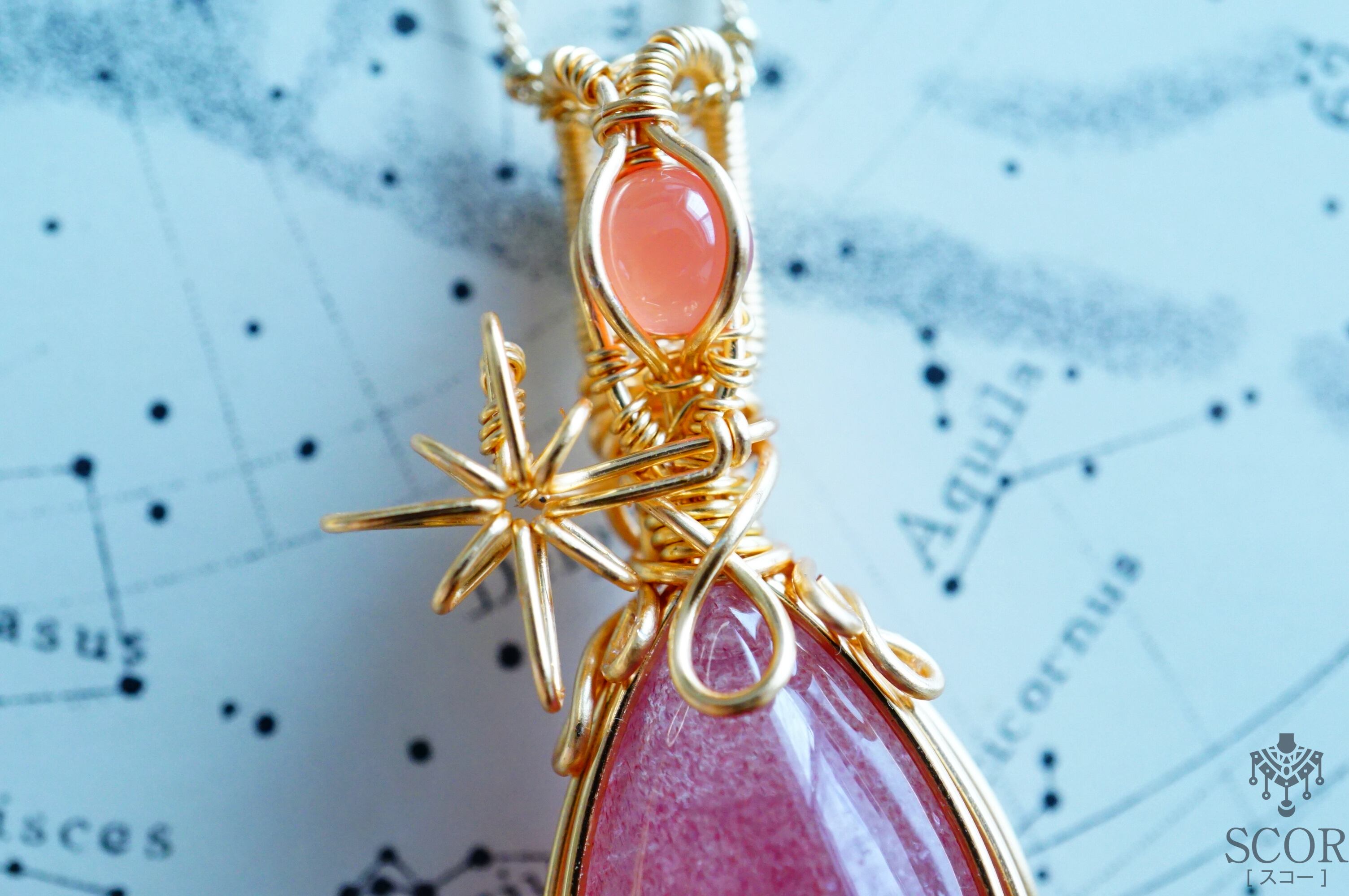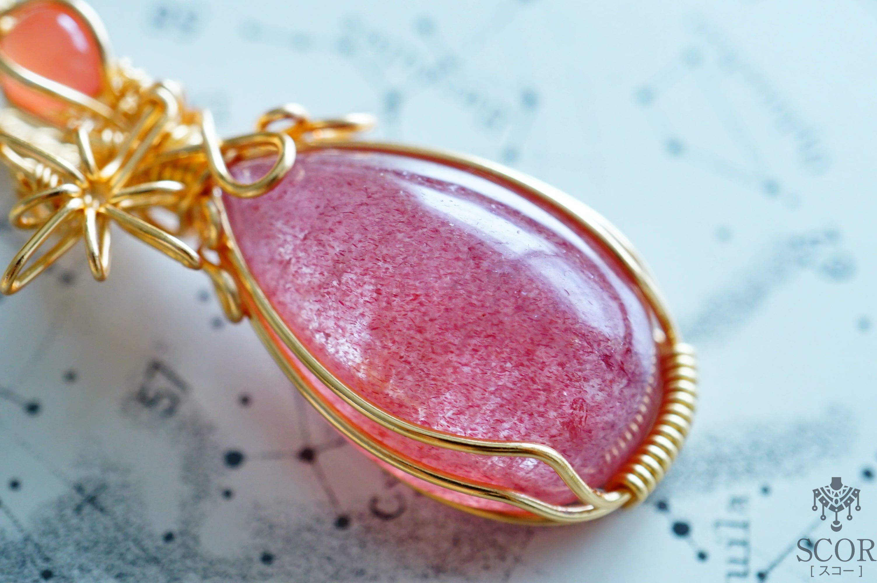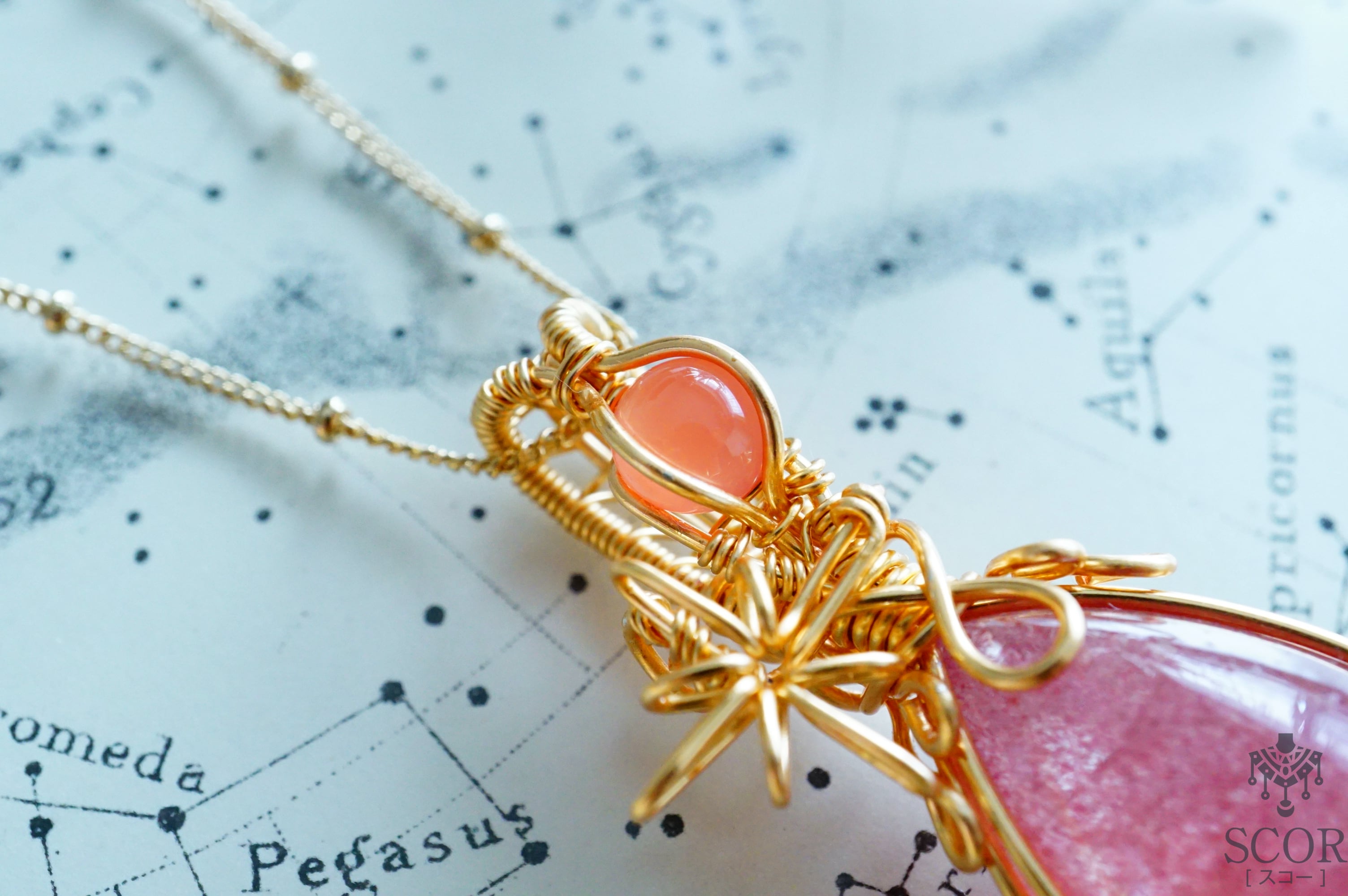 ロードクロサイトは、レッドインクルージョンクォーツシストに合わせて、透明度の高い、オレンジピンクのピースをチョイス。