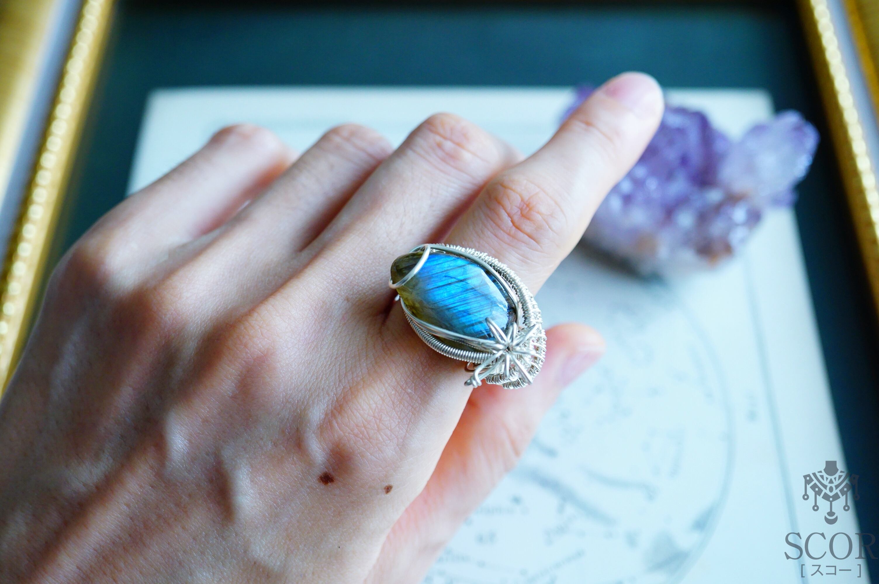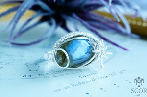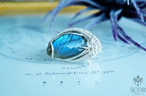 幻想的なラブラドライトの雰囲気に合わせ、レース編みのようなワイヤー装飾をチョイス。
