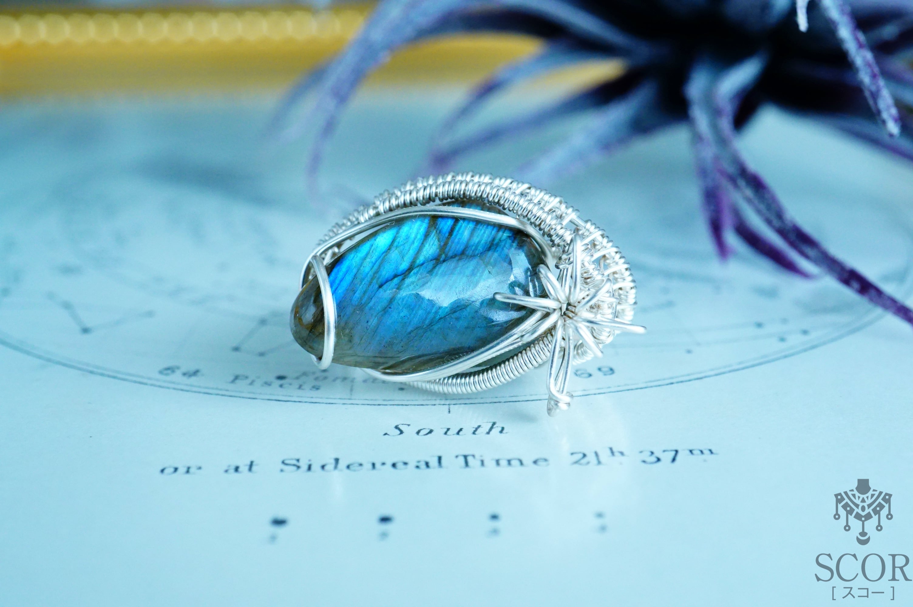 石留めはラブラドライトを眺める時に邪魔にならないよう、ワイヤーを端に寄せ、曲線を描かせて、優雅な雰囲気を添えました。