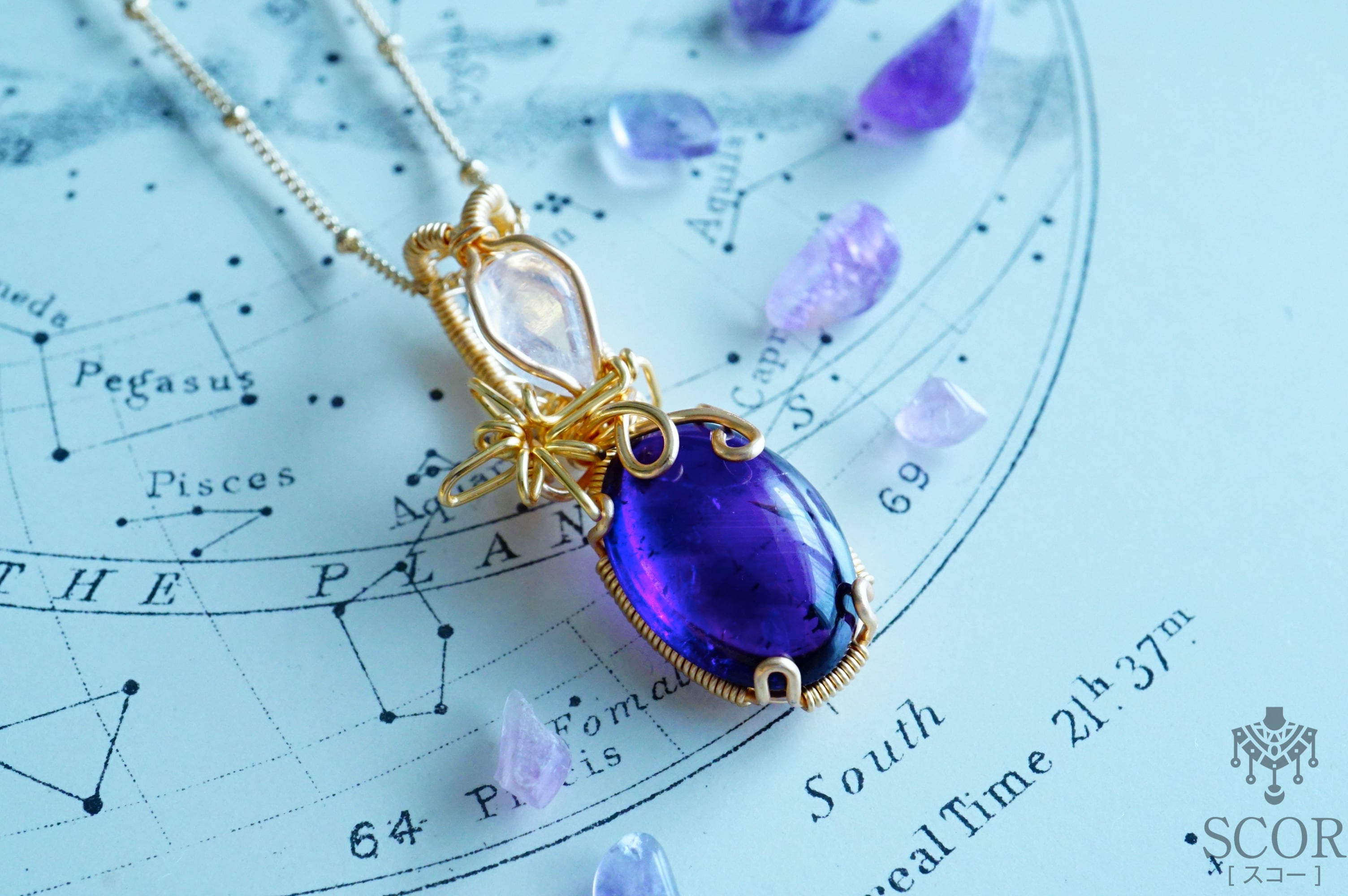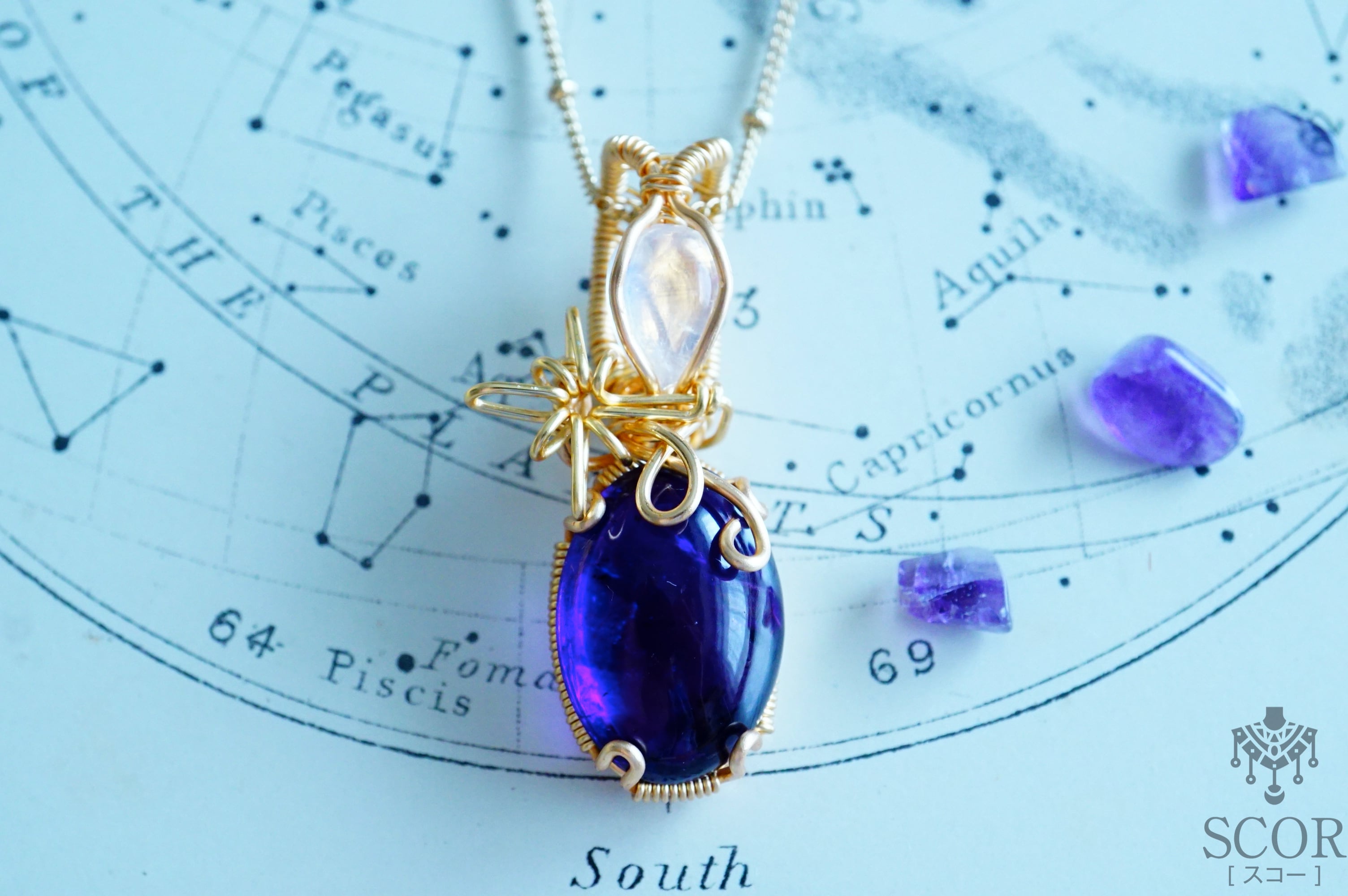 アメジストの宵闇色と、夜空の月の光のようなレインボームーンストーンの幻想的な色合わせに、ゴールドのワイヤーカラーが華やかさを添えます。
