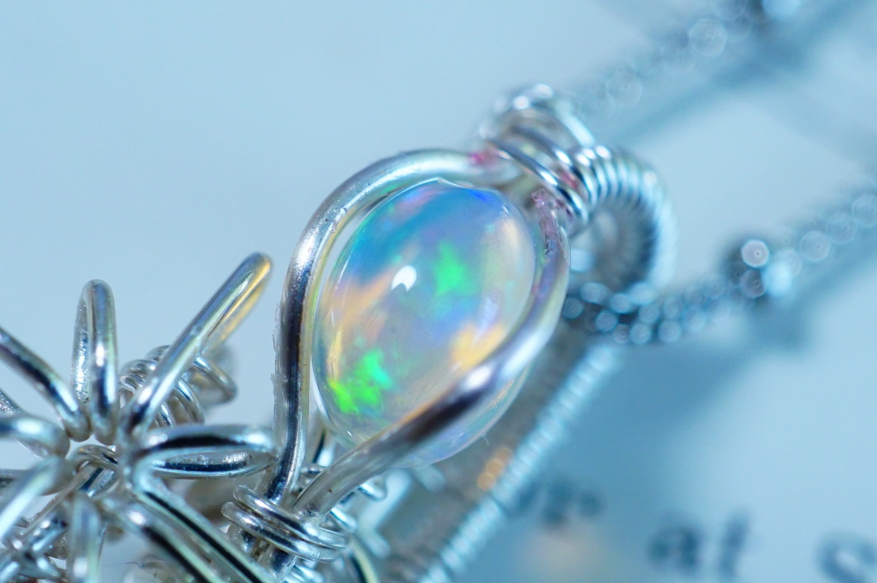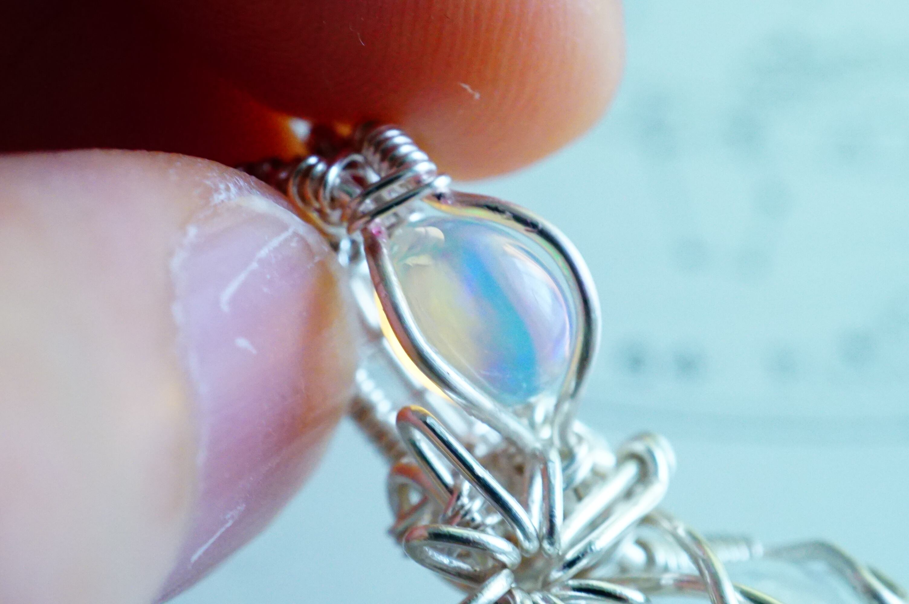 オパールは、レインボームーンストーンのシラーの色合いに合わせて、ベースカラーがブルーのピースをチョイス。