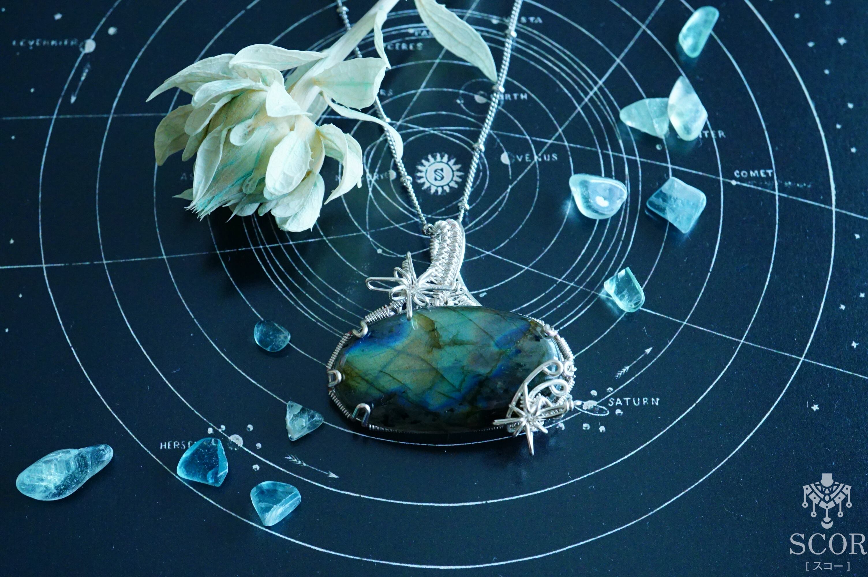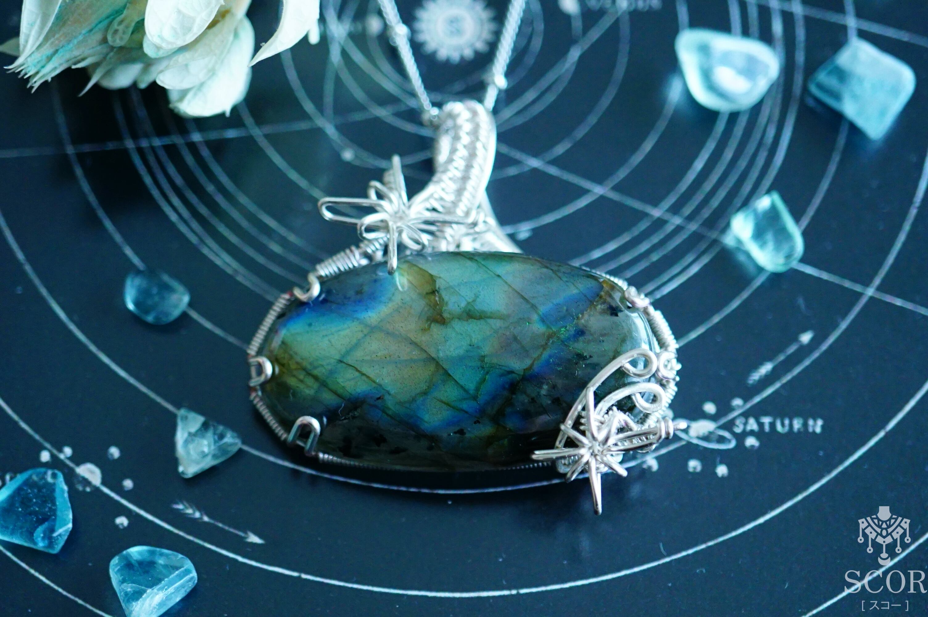 ラブラドライトを夜空に見立て、流星と一等星に見立てた光芒モチーフを添えました。