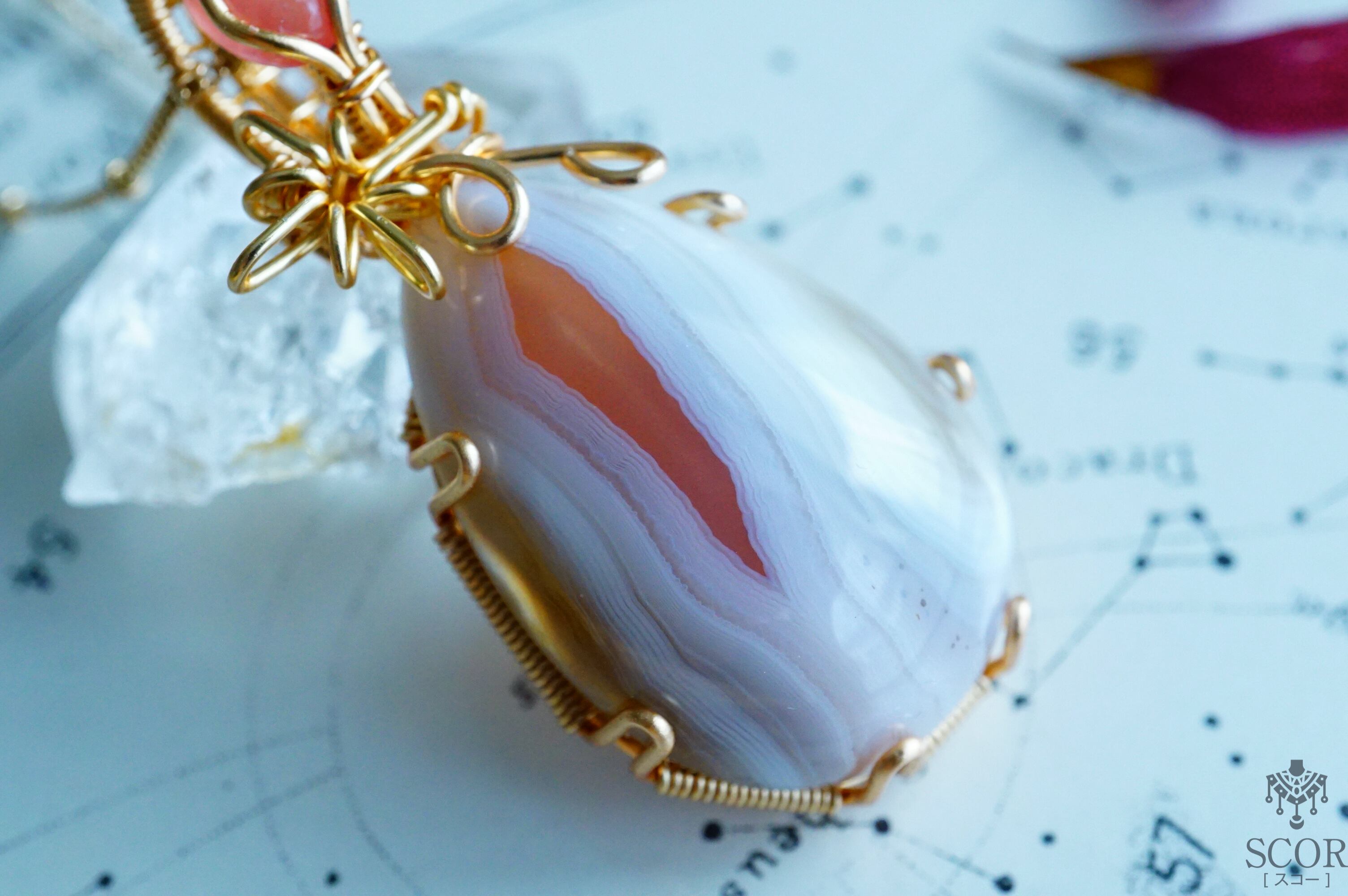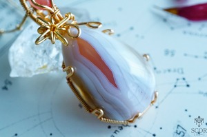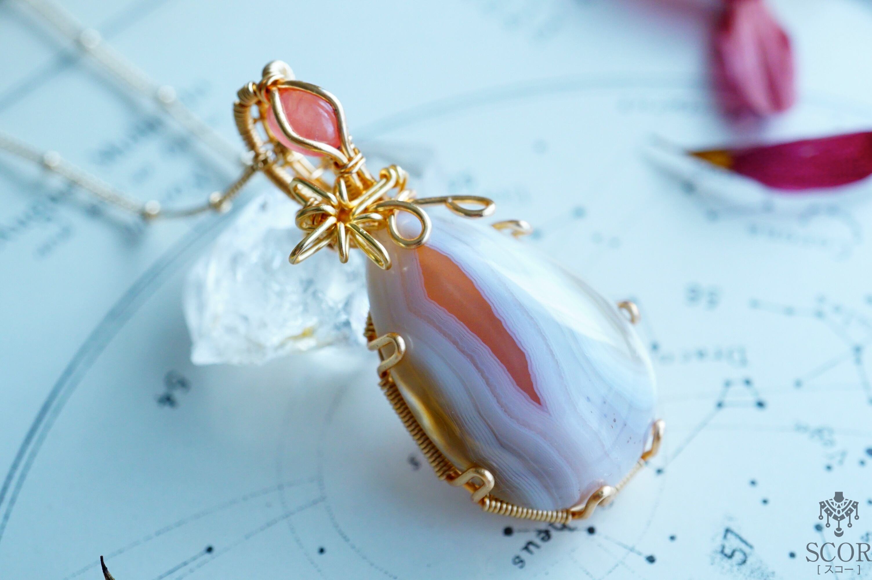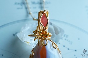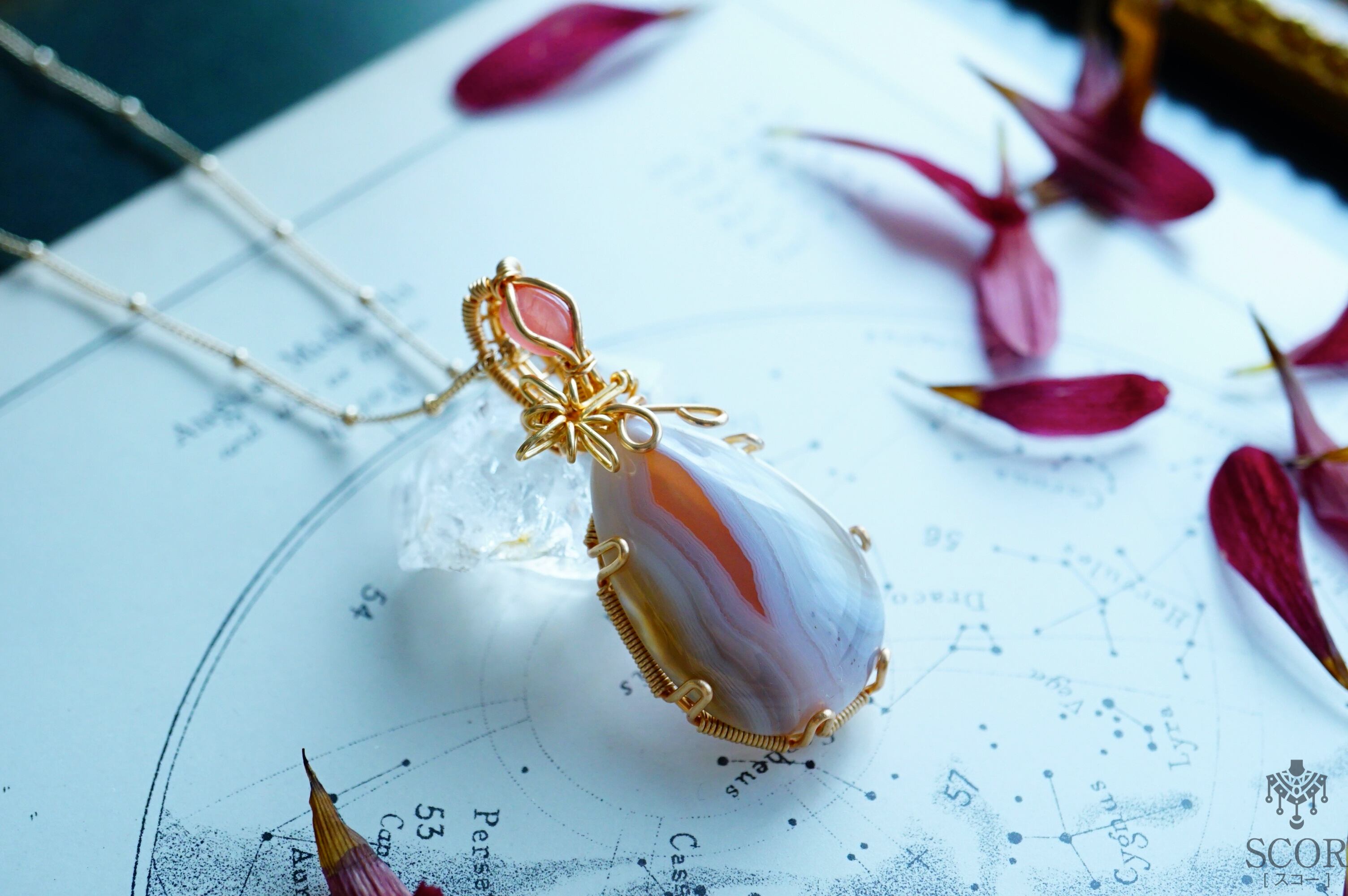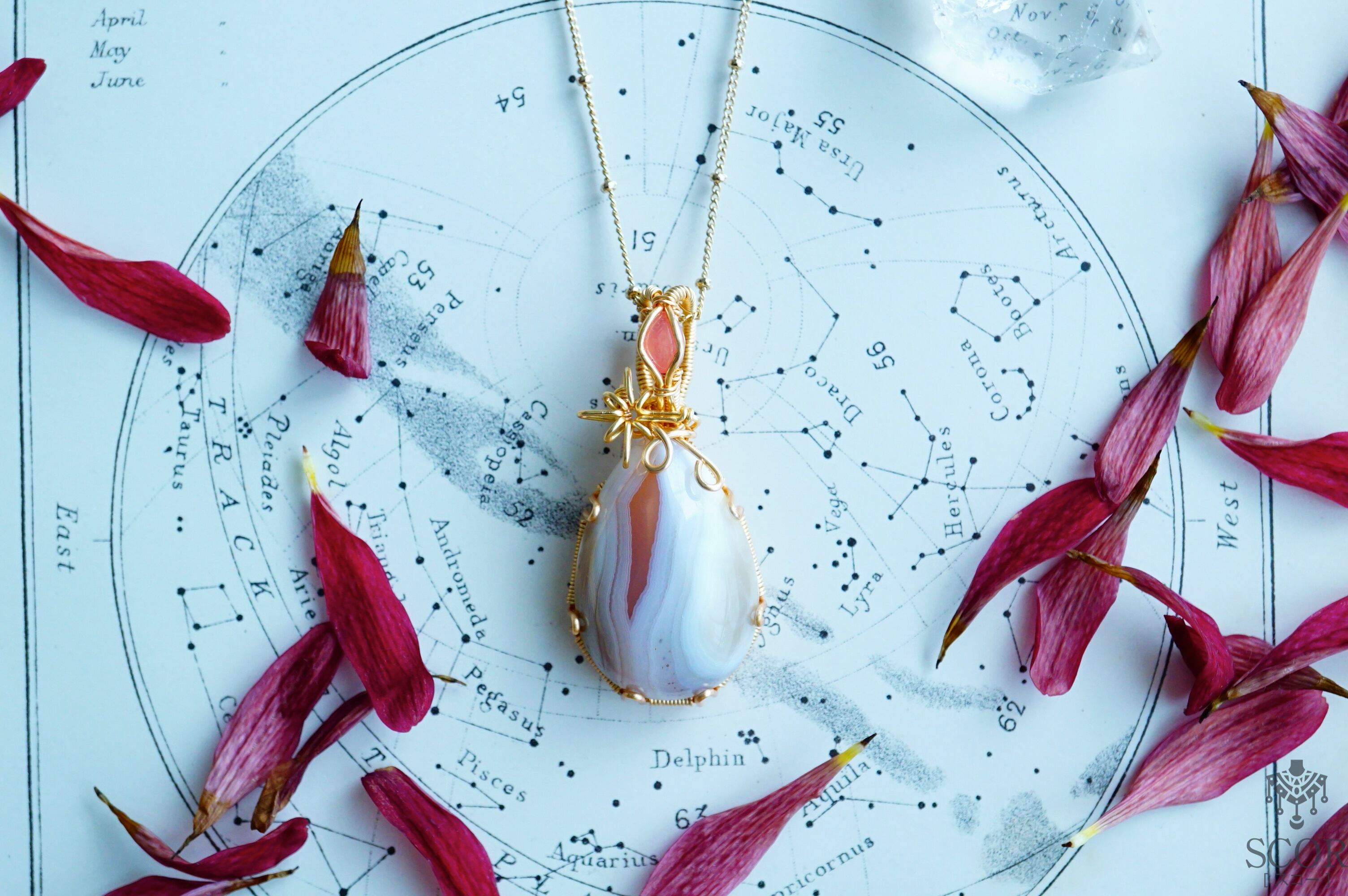 ボツワナアゲートの薔薇色の層を、一筋の星の光に見立て、明るい薔薇色が愛らしいロードクロサイトを装飾石に選びました。