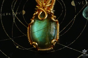 ラブラドライトは、ごく淡いピンクのベースカラーに、グリーン・ゴールド・ブルーが混じったラブラドレッセンス(光沢)が鮮やかな、半透明のカボションを使用。