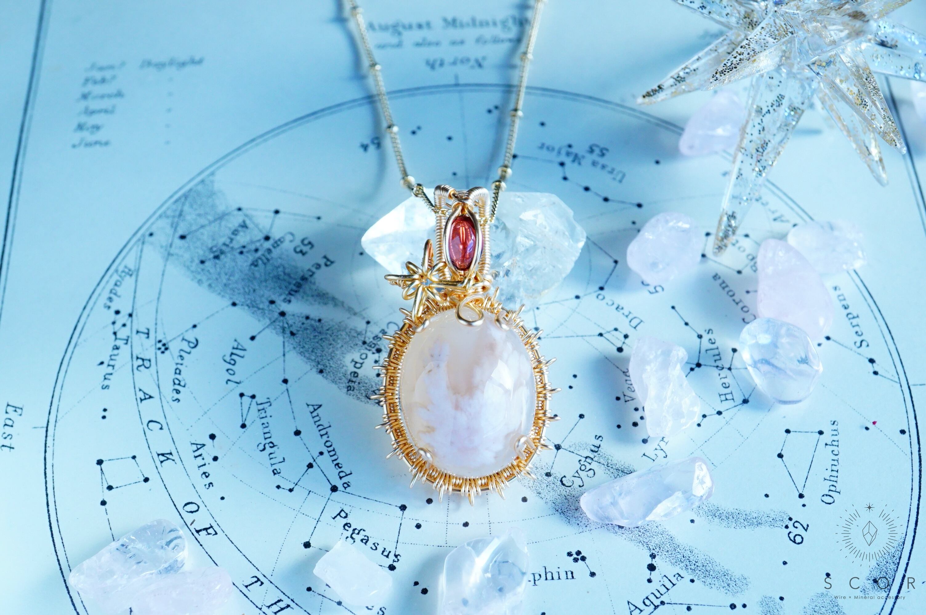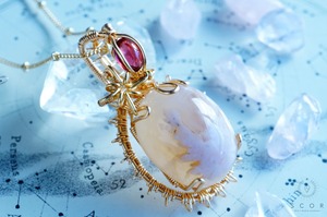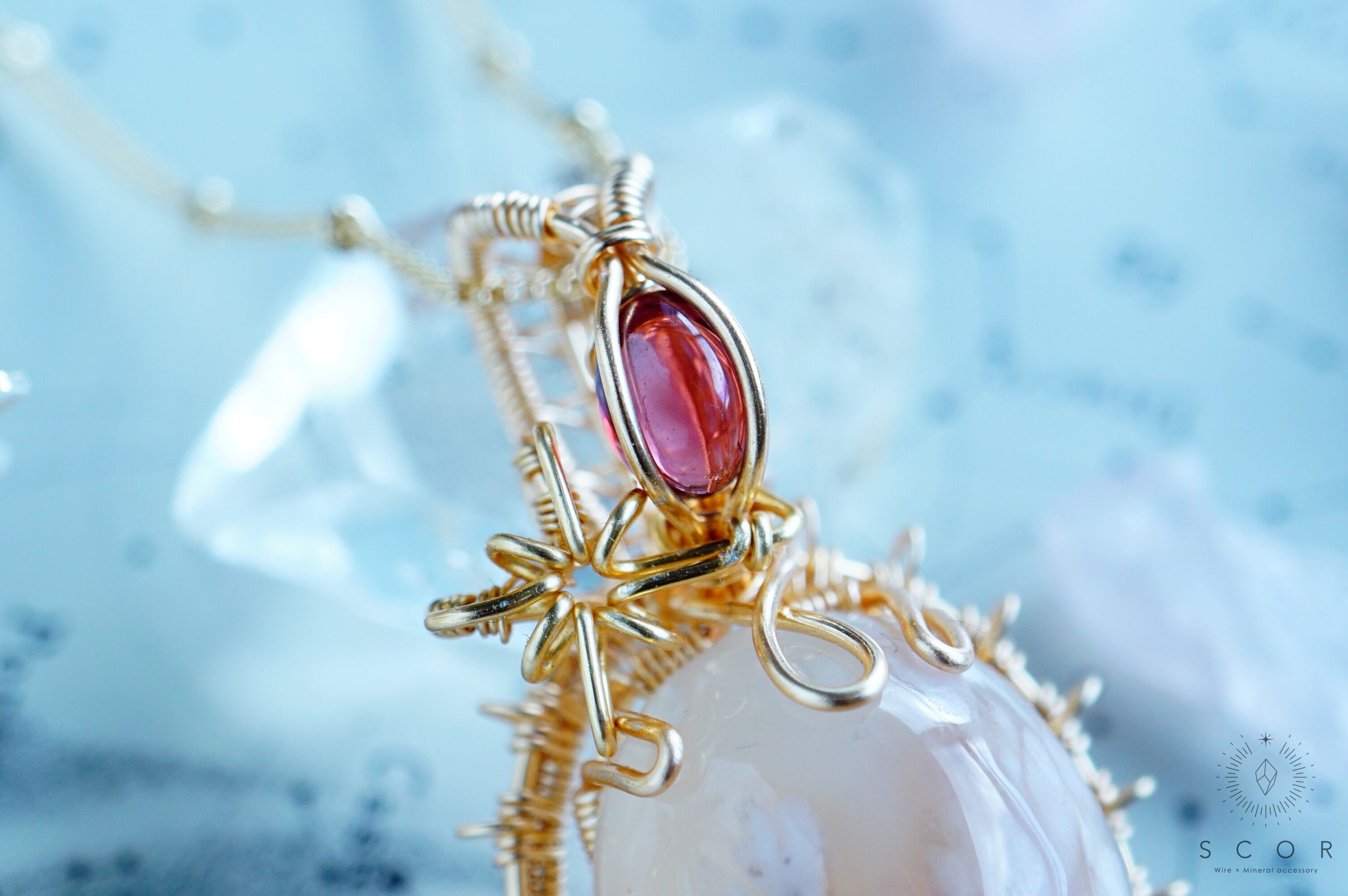 チェリーブロッサムアゲートとゴールド色のワイヤーの淡い色の組み合わせのポイントとなるよう、装飾石には目の覚めるような紅色のガーネットをチョイス。