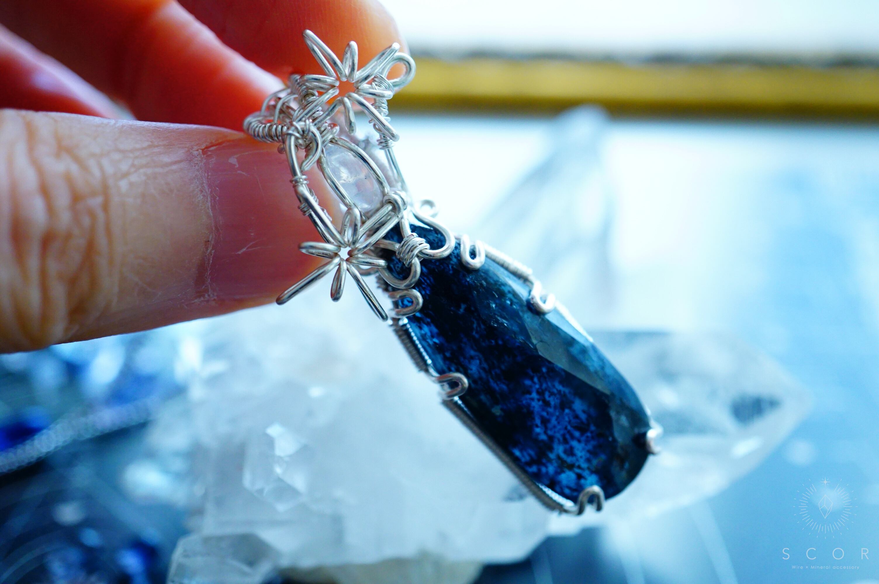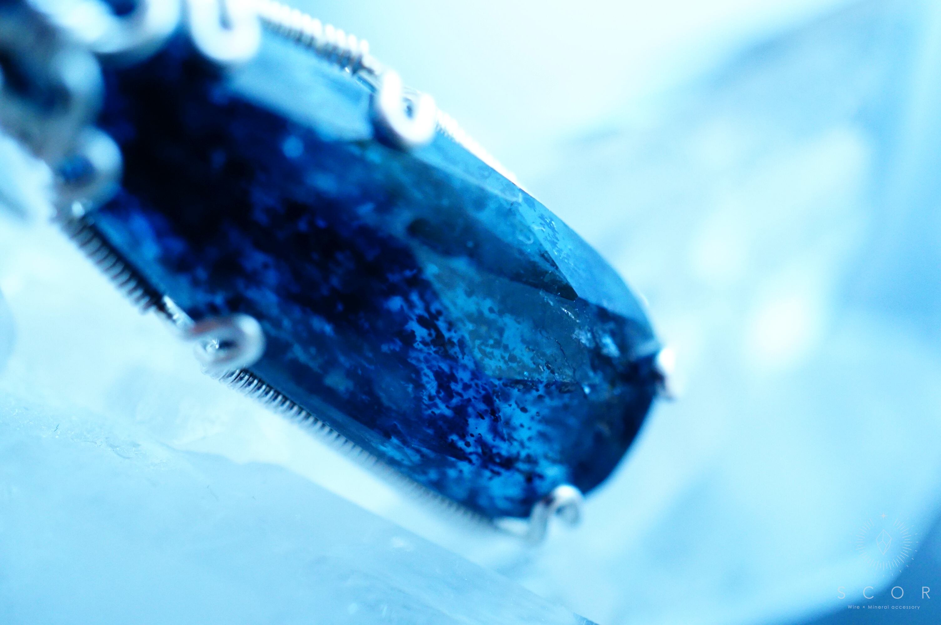 カイヤナイト特有の銀色の内包物が、あちこちで煌めきます。