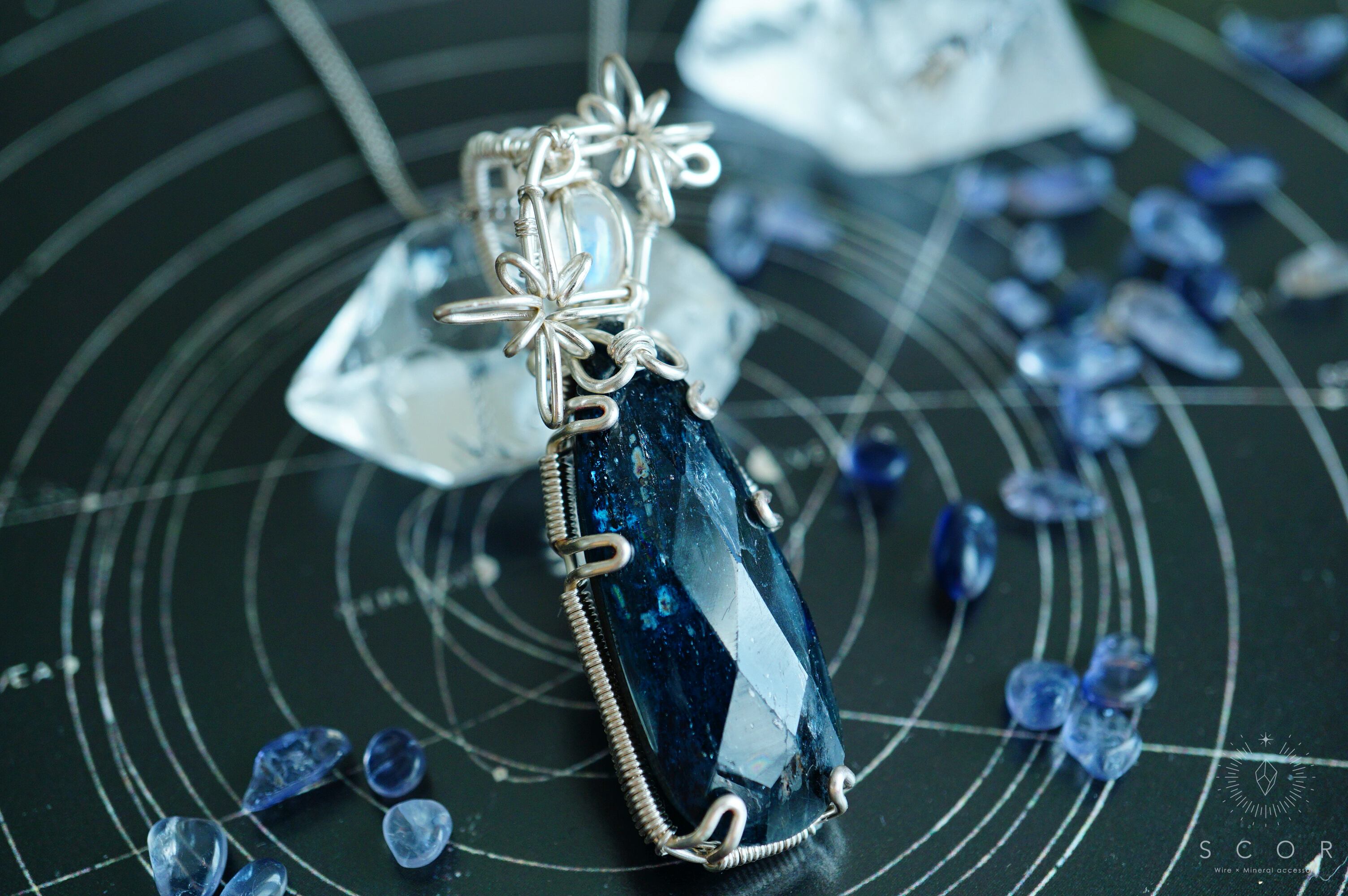 黒と合わせると、カイヤナイトの銀色の内包物と、流星のワイヤー装飾が際立ちます。
