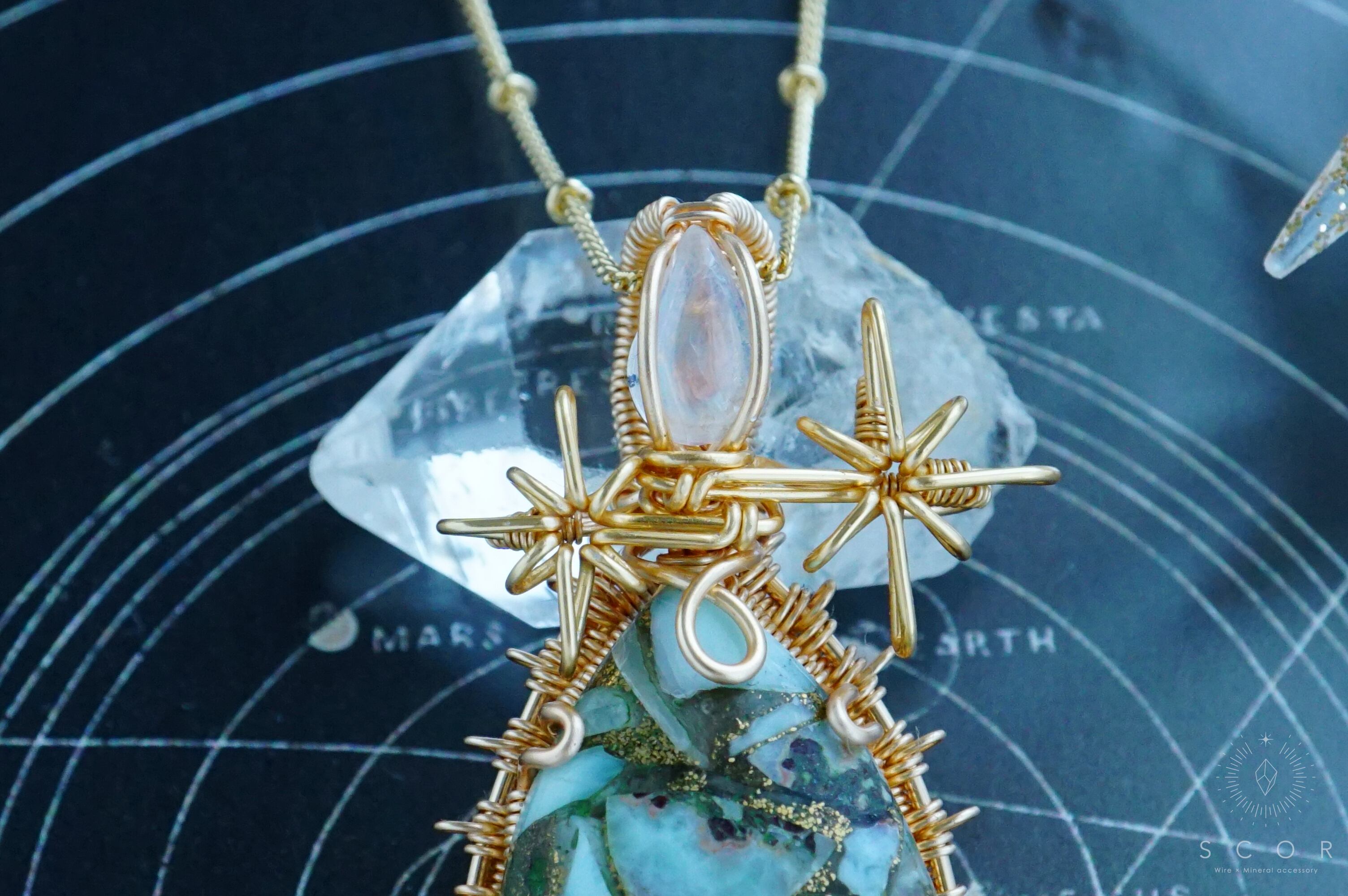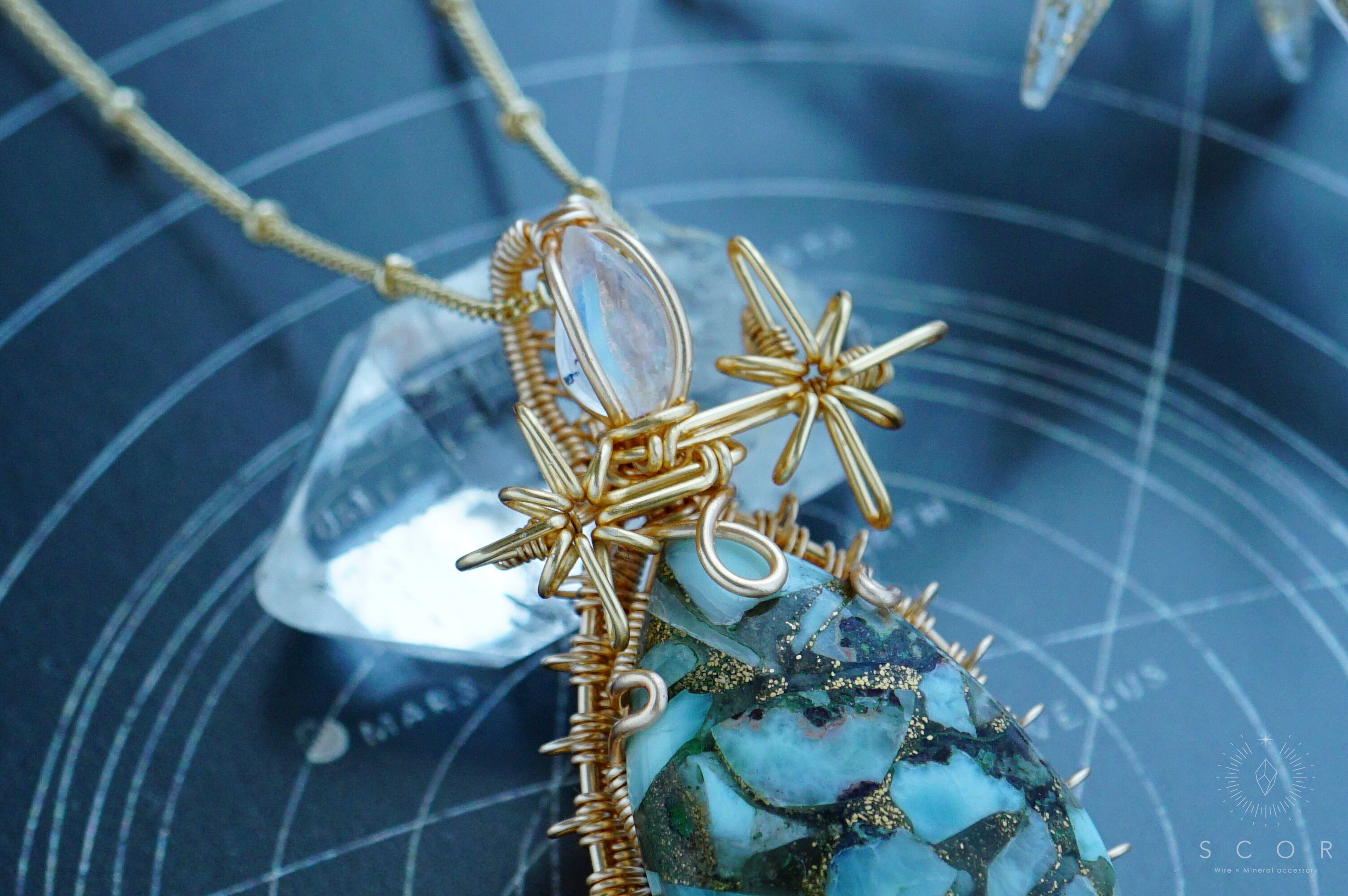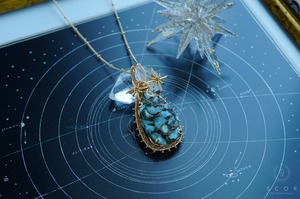 小さなラリマー+カッパー(銅)でできた星が、金色の光を放つ様子をイメージしています。