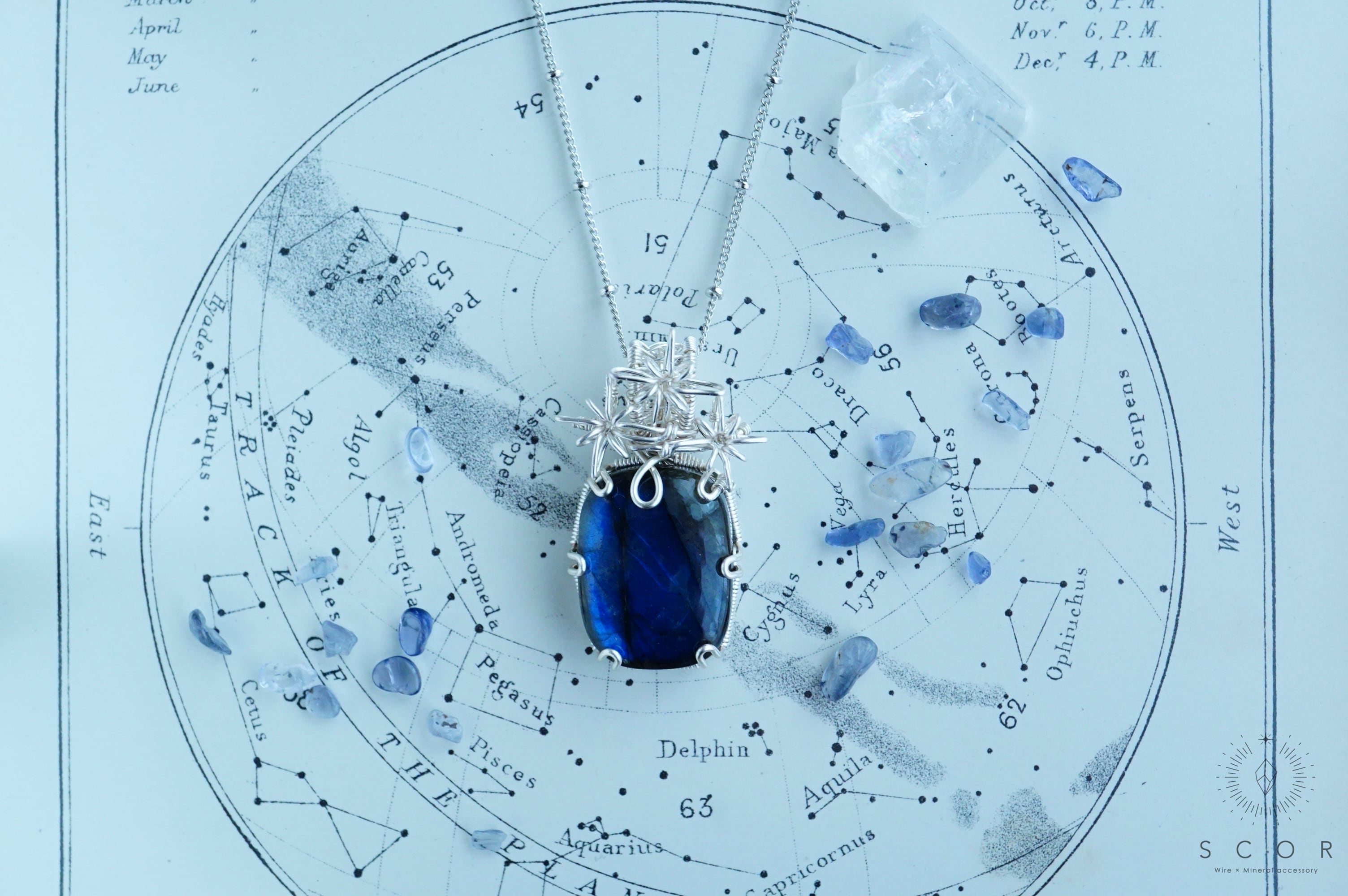 真っ青なラブラドレッセンス(光沢)と、細かな銀色のインクルージョン(内包物)が楽しめる、四角いカボションを使用。