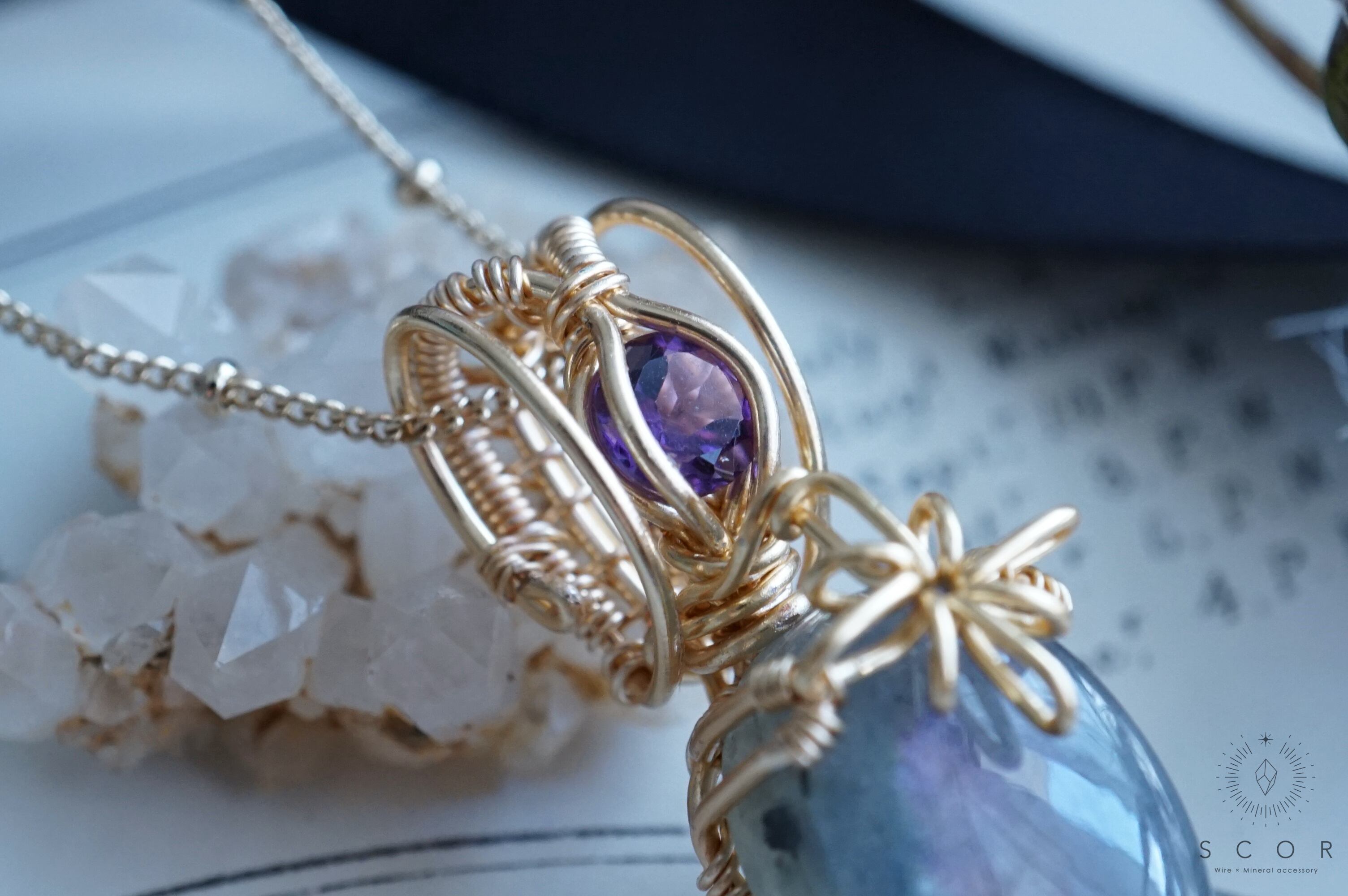 バチカンは、ラブラドライトの光沢色(ラブラドレッセンス)を際立たせる、明るい色のファセットカットのアメジストを中央に配置。