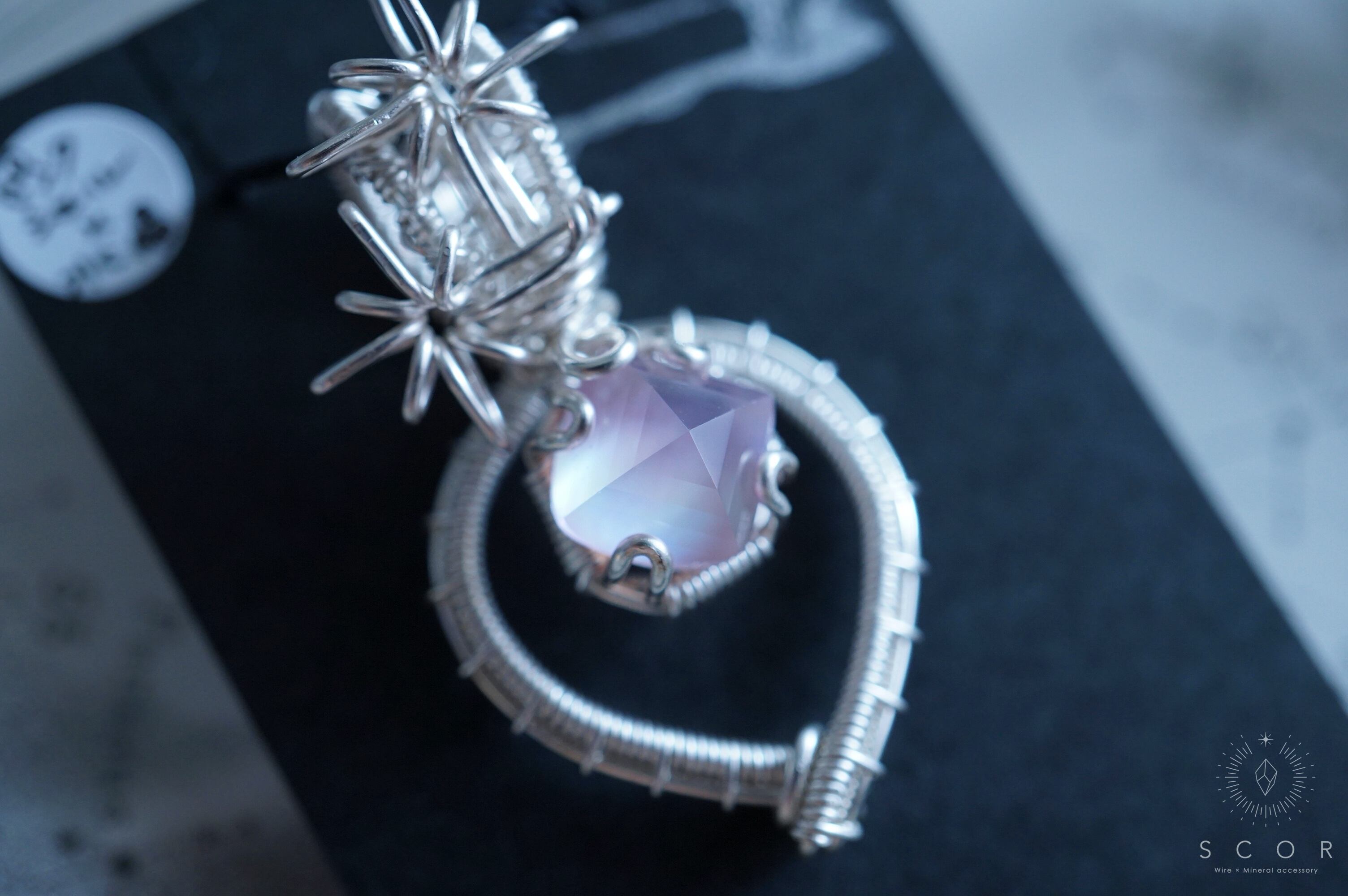 シュガーローフカットの水晶越しに見える、ピンクシェルの真珠色の煌めきが幻想的です。