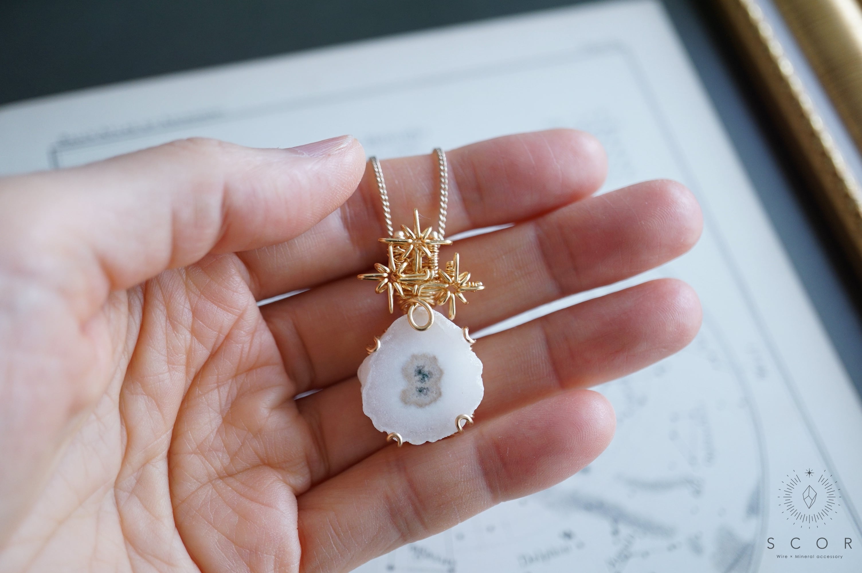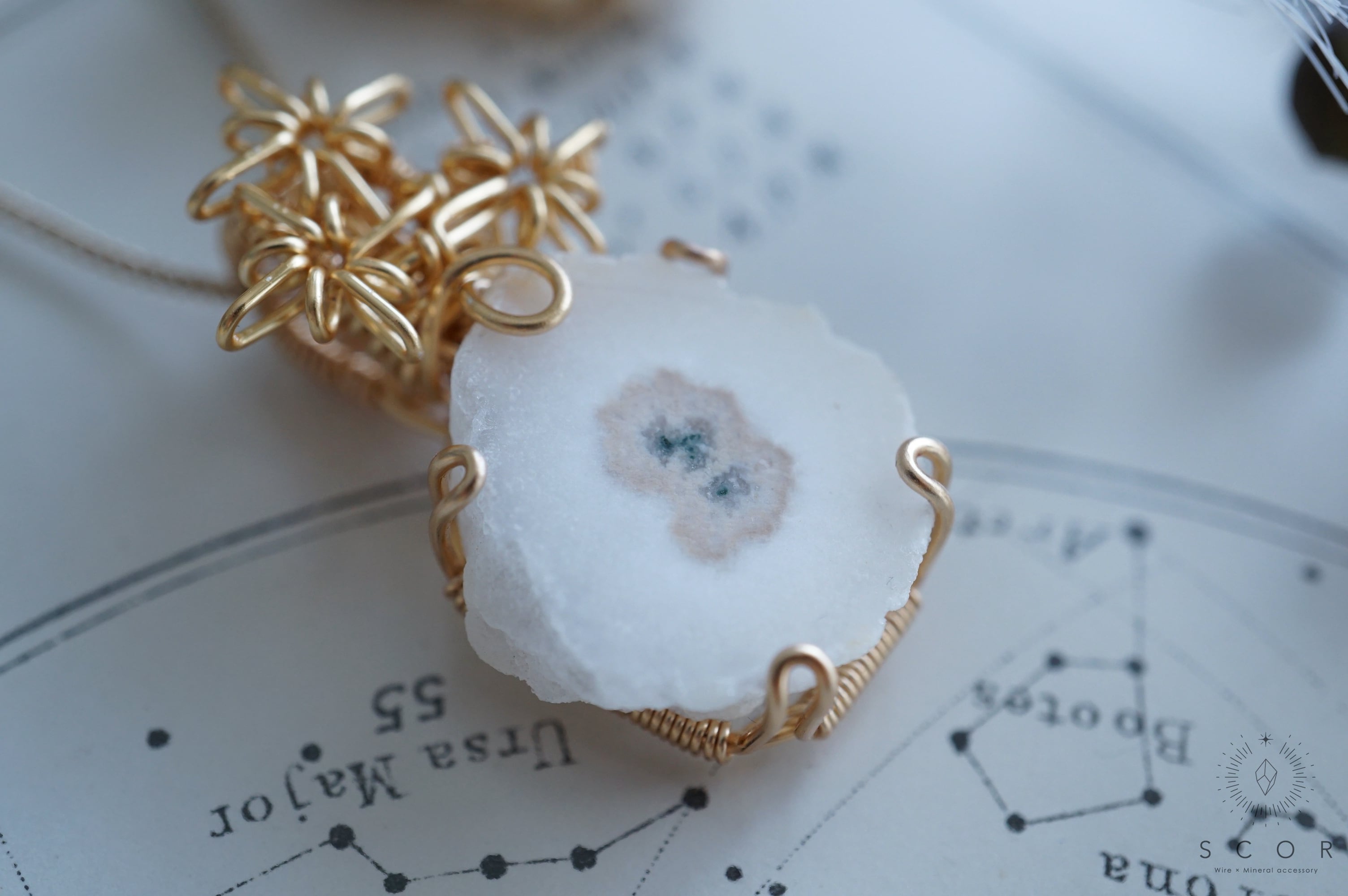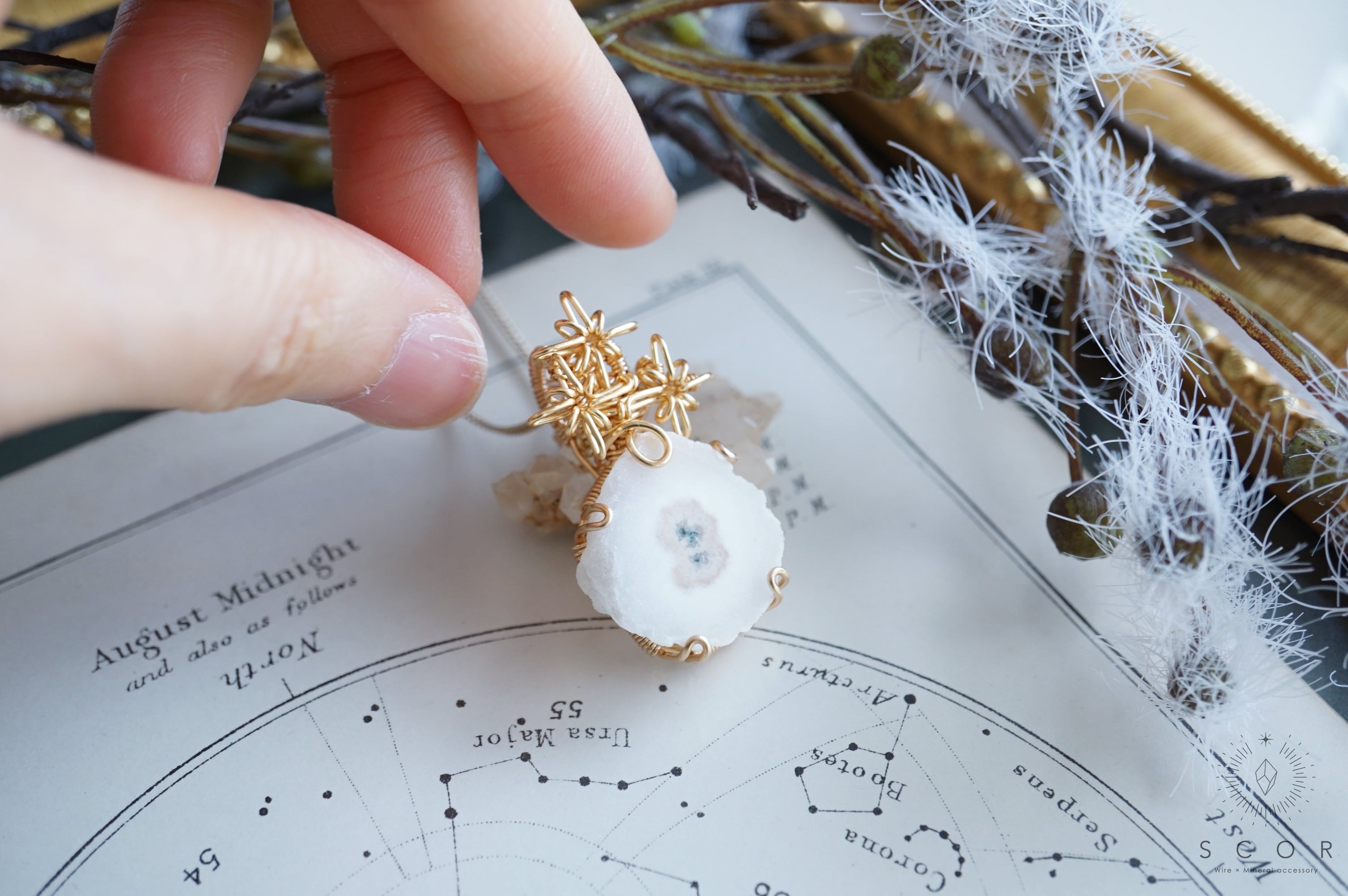 ソーラークオーツは、アゲート(めのう)を中心に水晶が放射状に広がった鉱物。