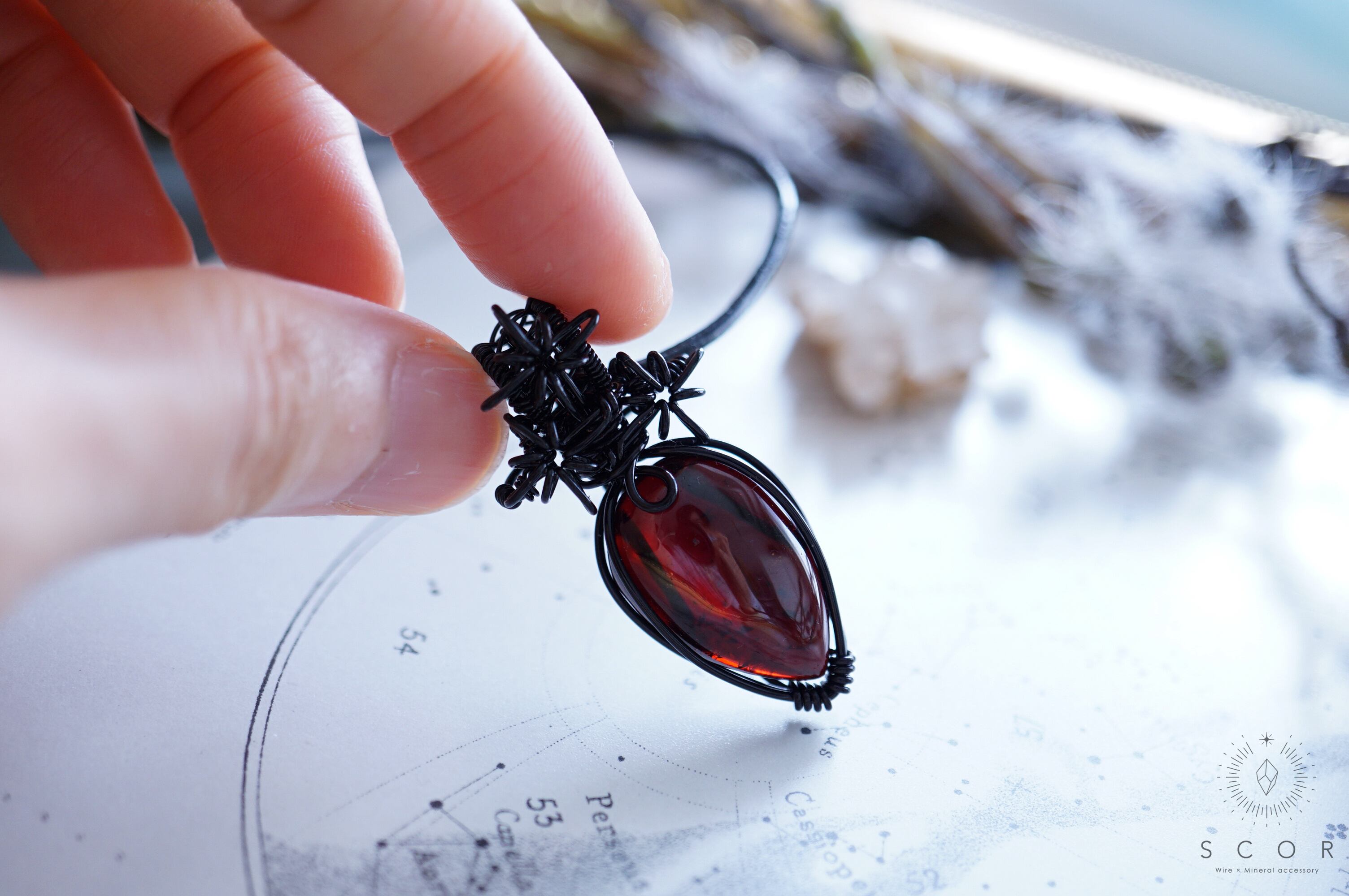 白や淡い色の服と合わせると、ガーネットの色合いと、黒いワイヤーの造形が際立ちます。