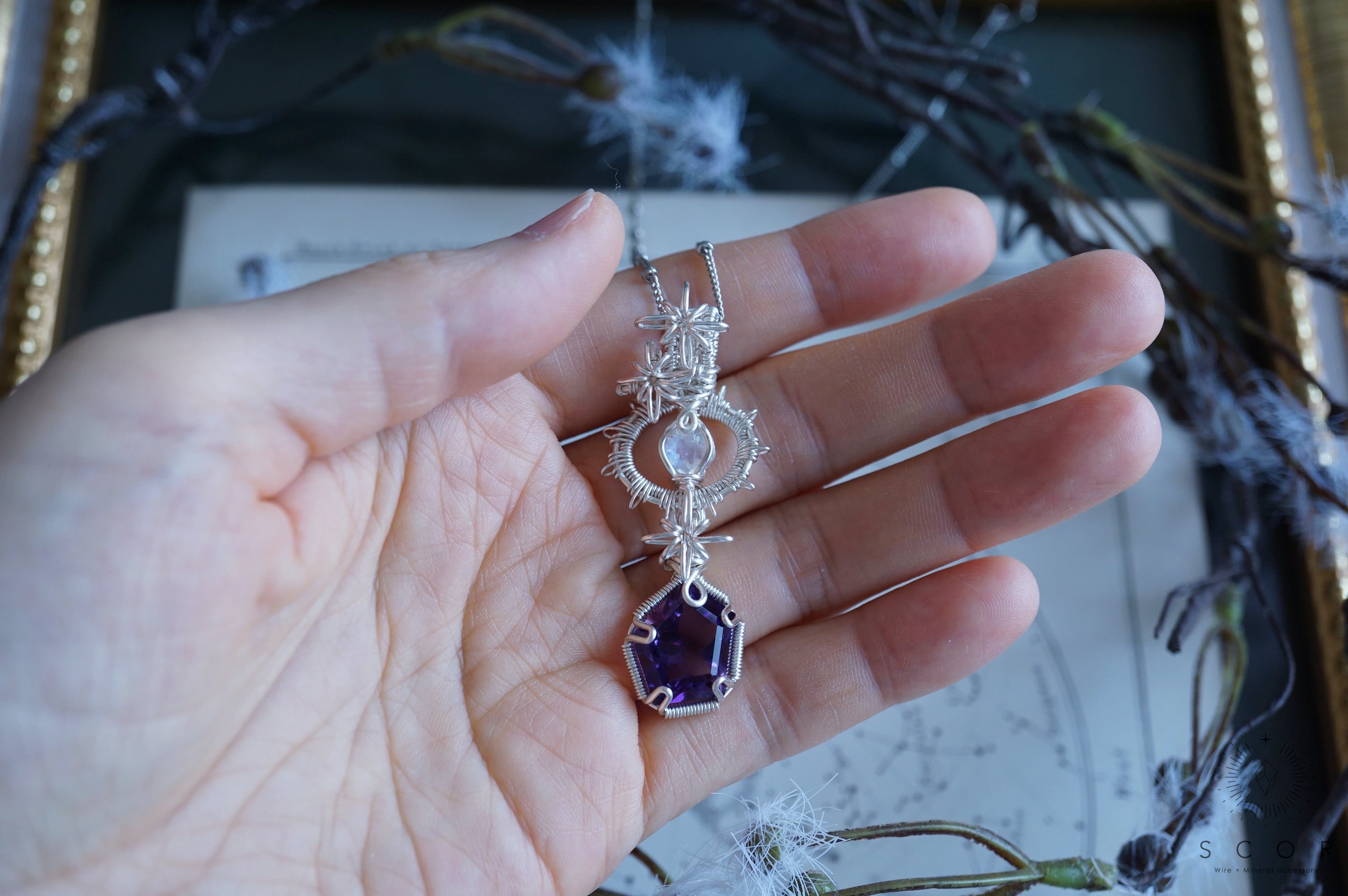 満月になぞらえて、石の周りに月光をイメージしたワイヤー装飾を添えました。