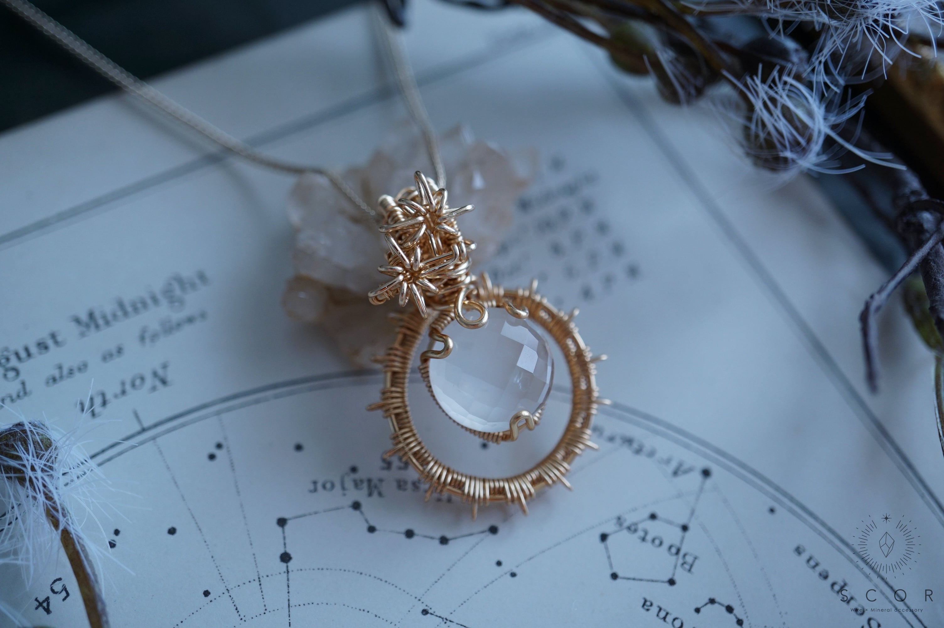 黄みがかったミルキーホワイトのムーンストーンを、満月に見立て、正円のワイヤー装飾を月虹のようにあしらったデザイン。