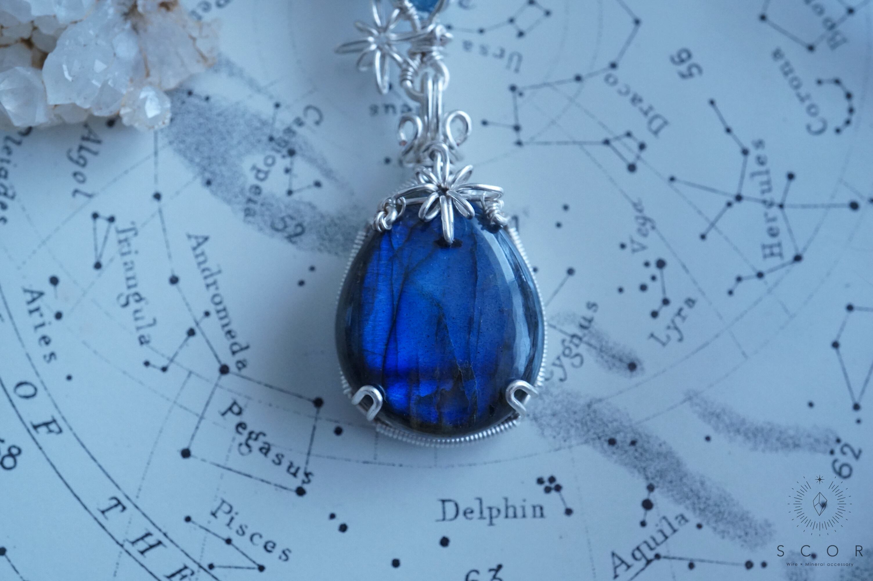 ラブラドライトのニュアンスのあるブルーに合わせて、明るい紺色部分と、無色透明部分が混じり合ったピースを添えました。