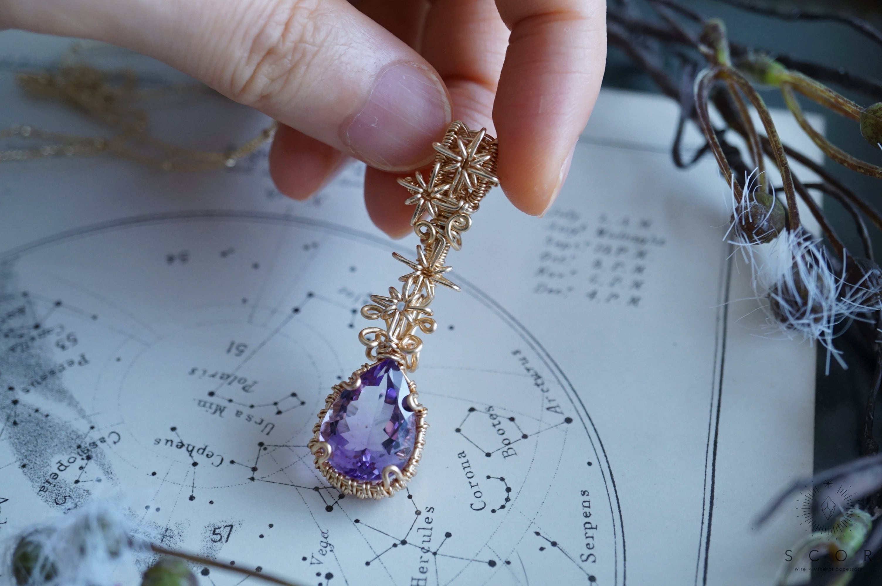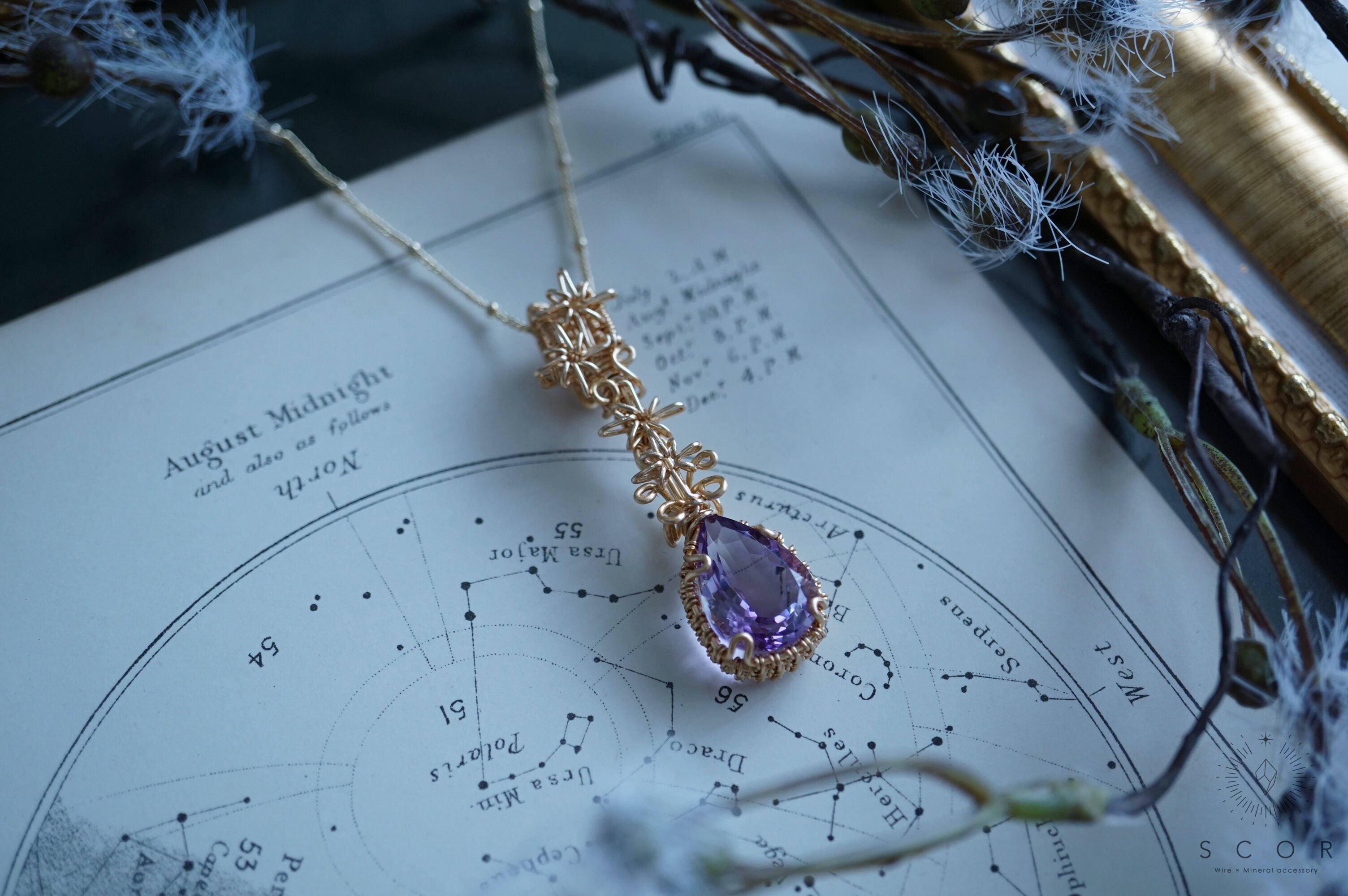流星に見立てたアメジストと、バチカンとをつなぐ部分には、微妙にサイズの異なる4つの光芒のモチーフと、くるりと丸めたワイヤーによる装飾で、流れる星の煌めきをファンタジックに表現。