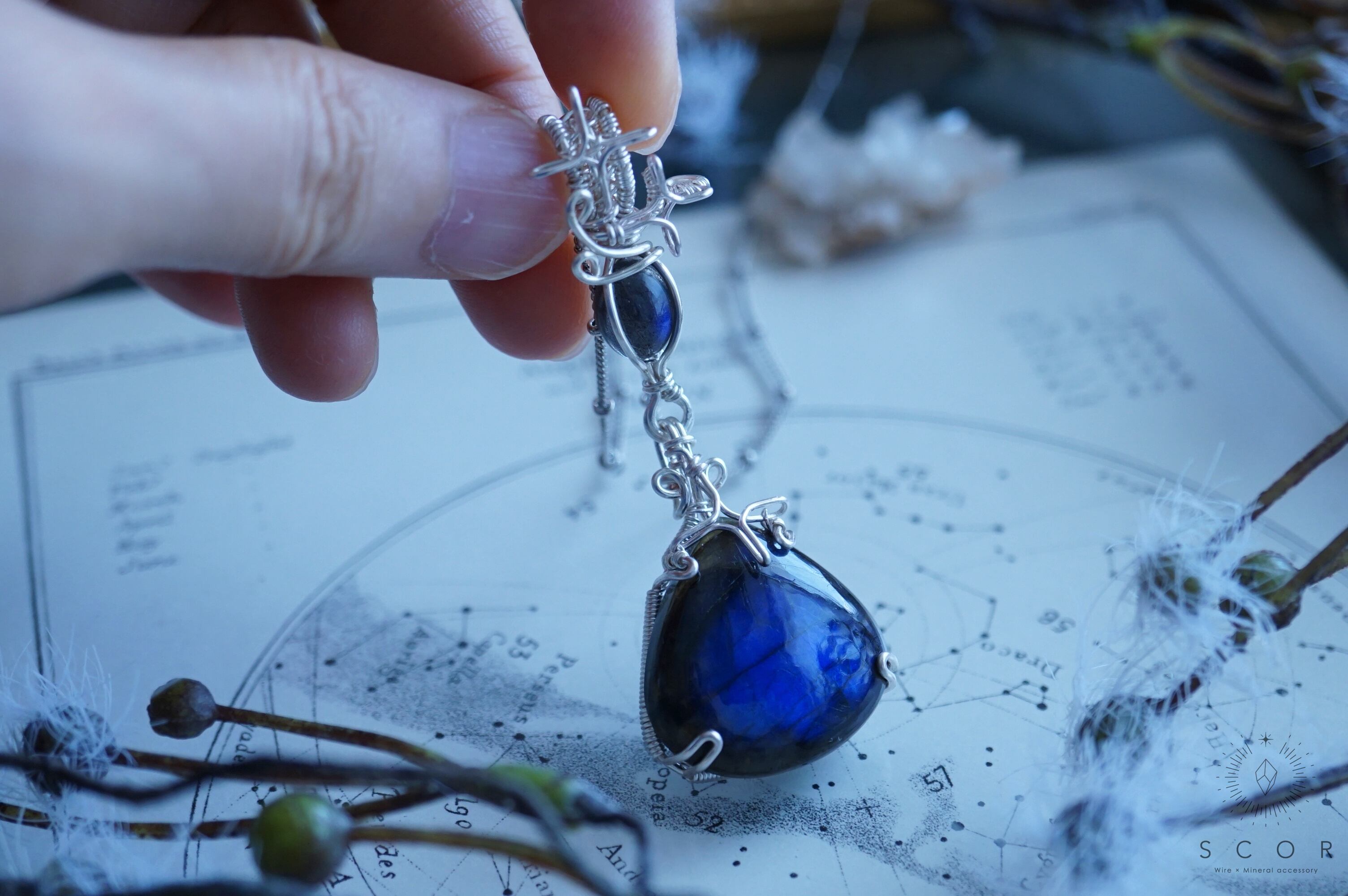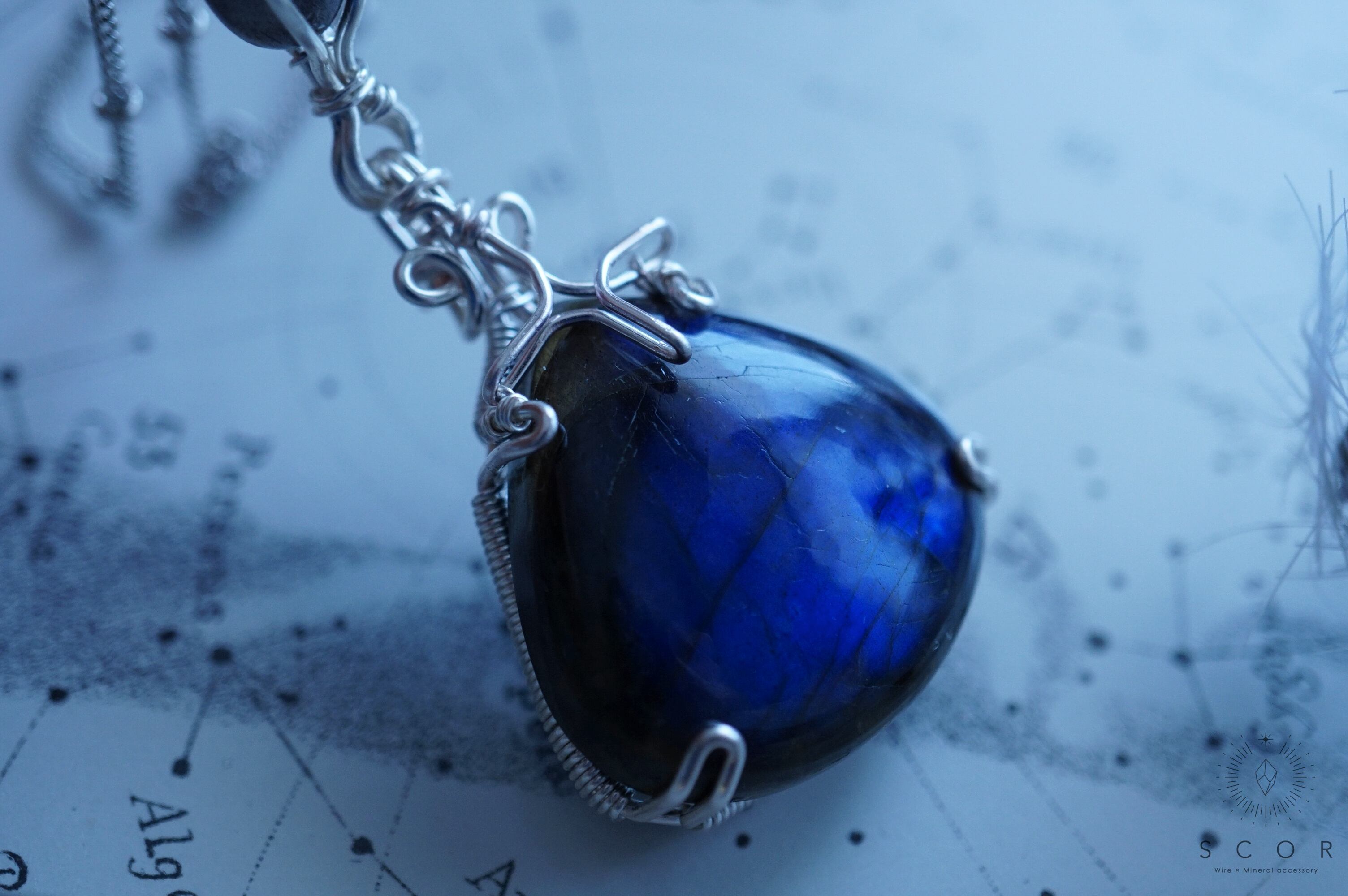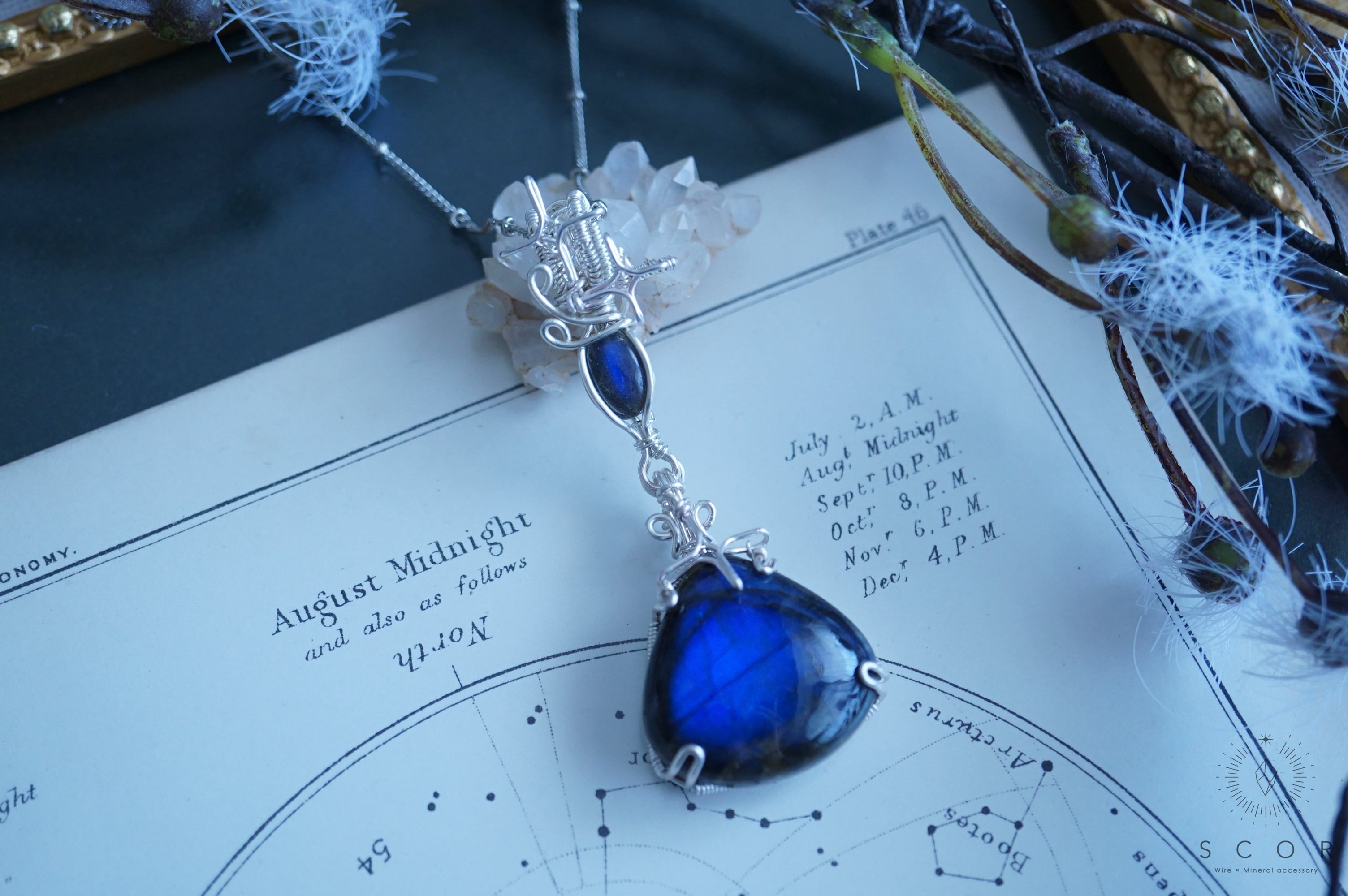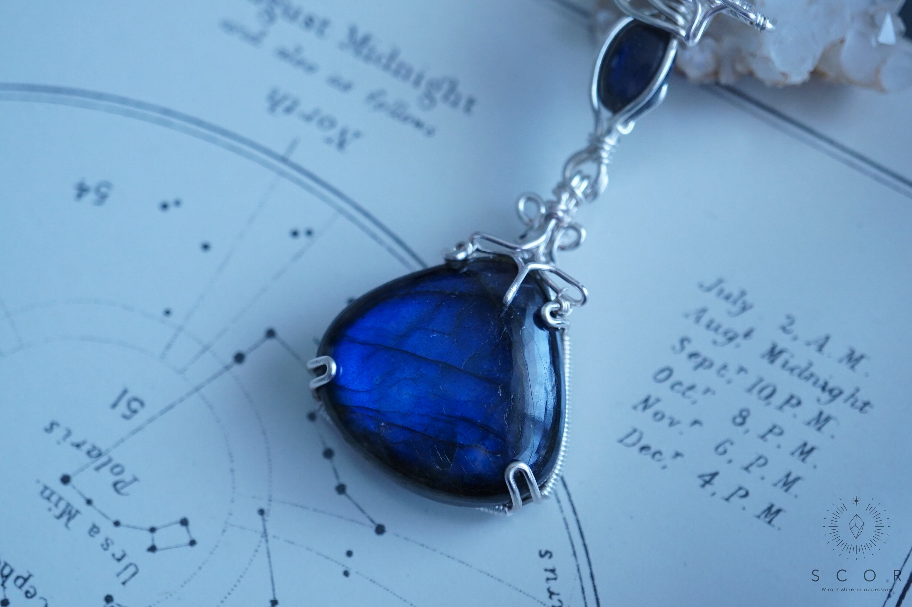 メインに使用したラブラドライトは、夜空のようなブルーのラブラドレッセンス(光沢)と、星屑のように煌めく内包物が美しい、マロン型のカボションを使用。