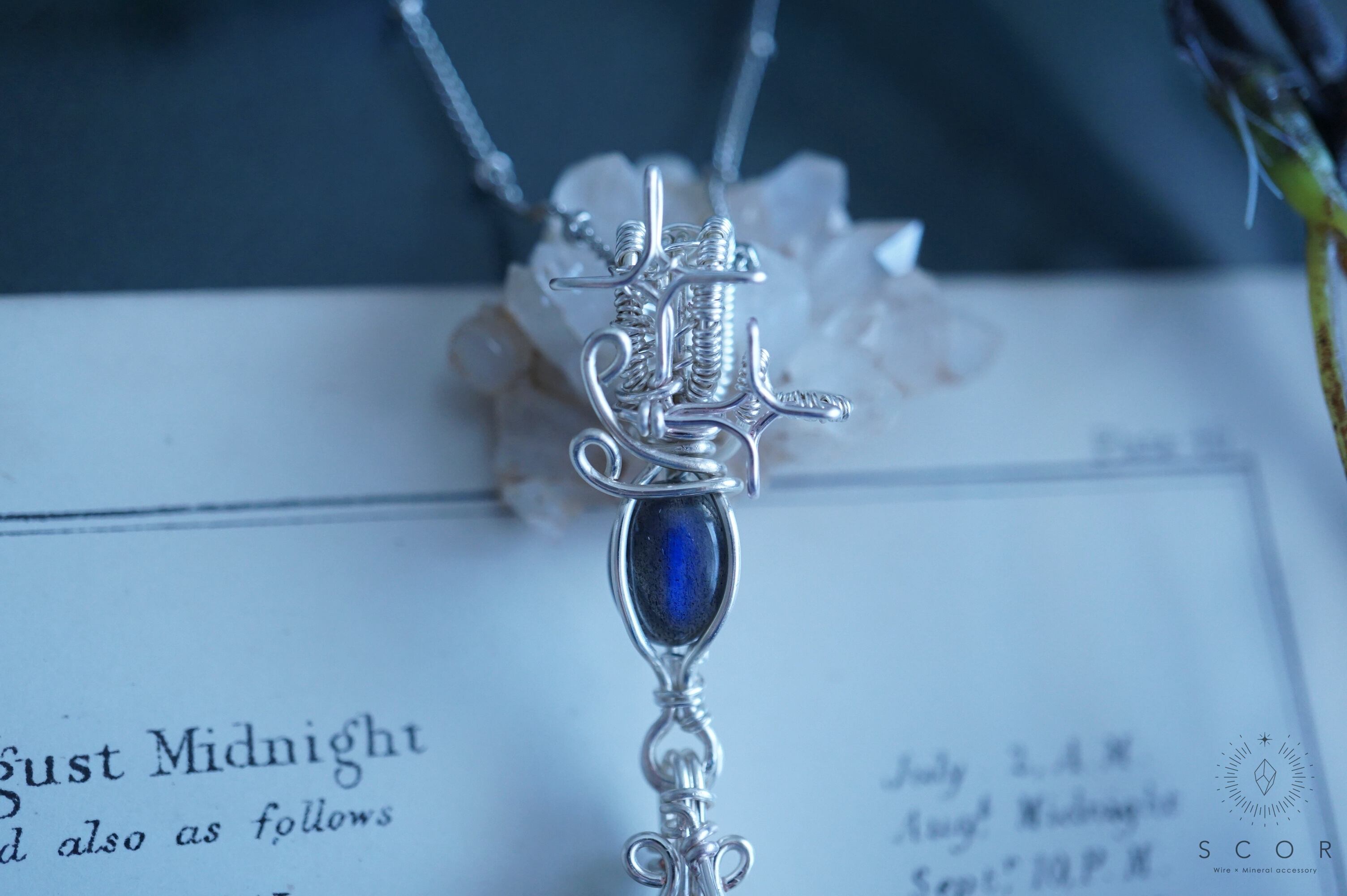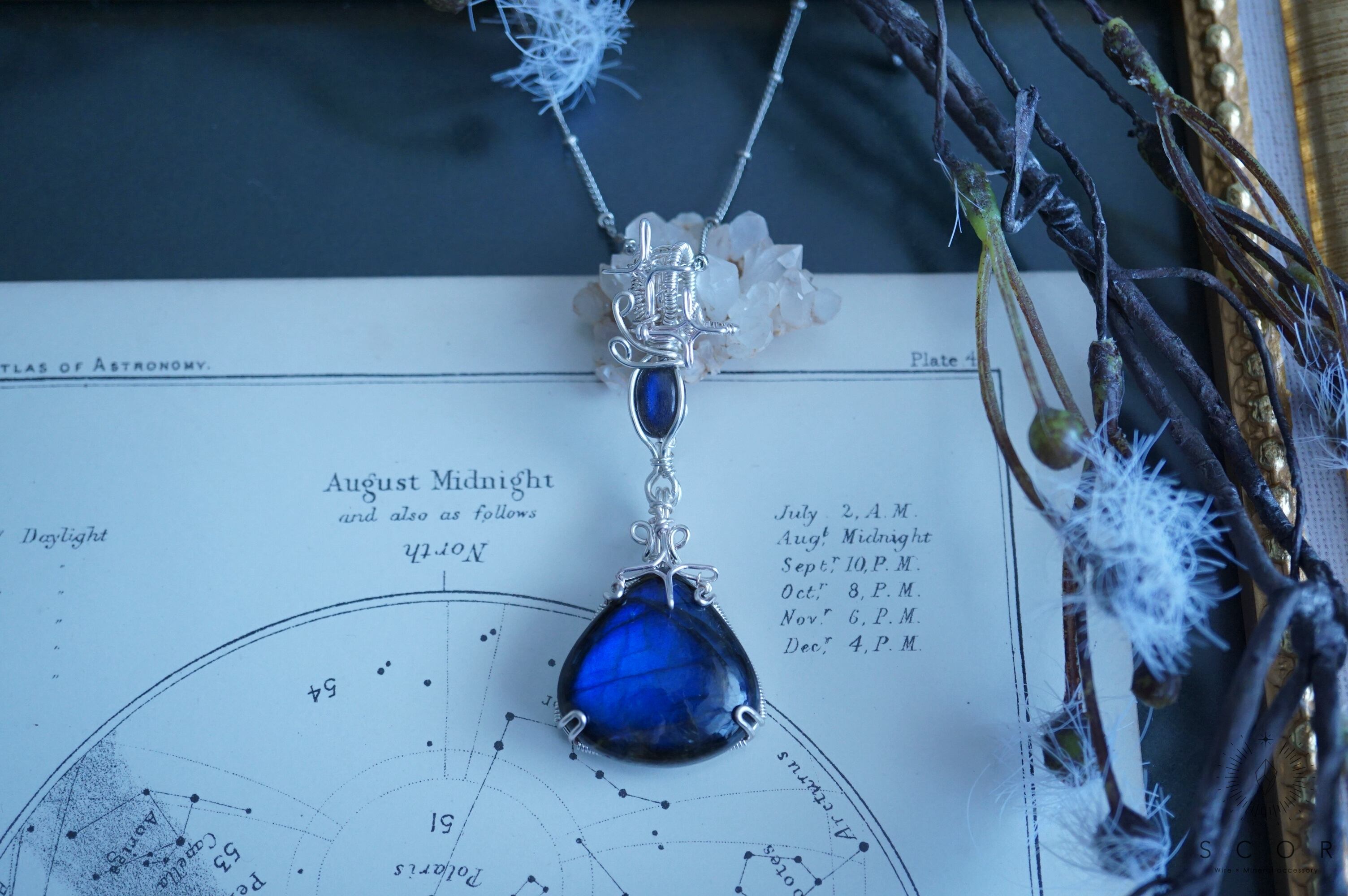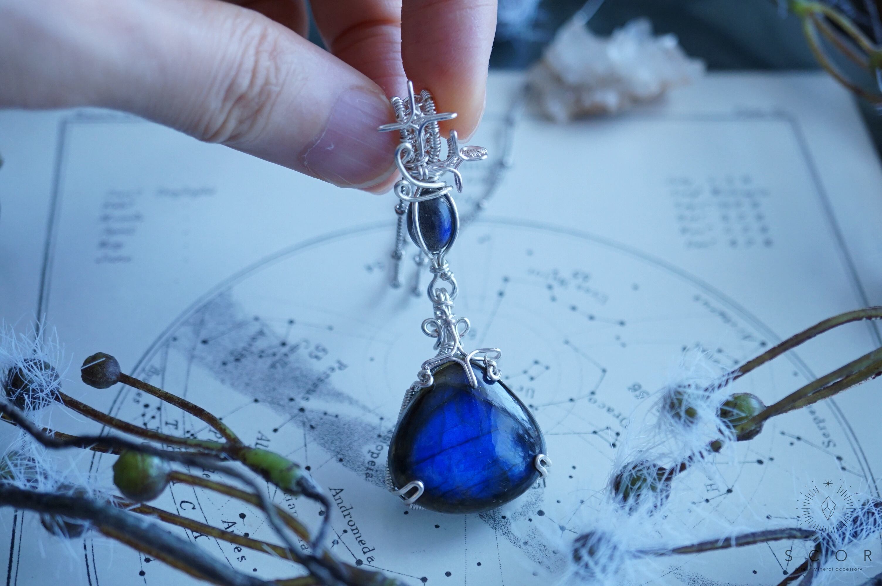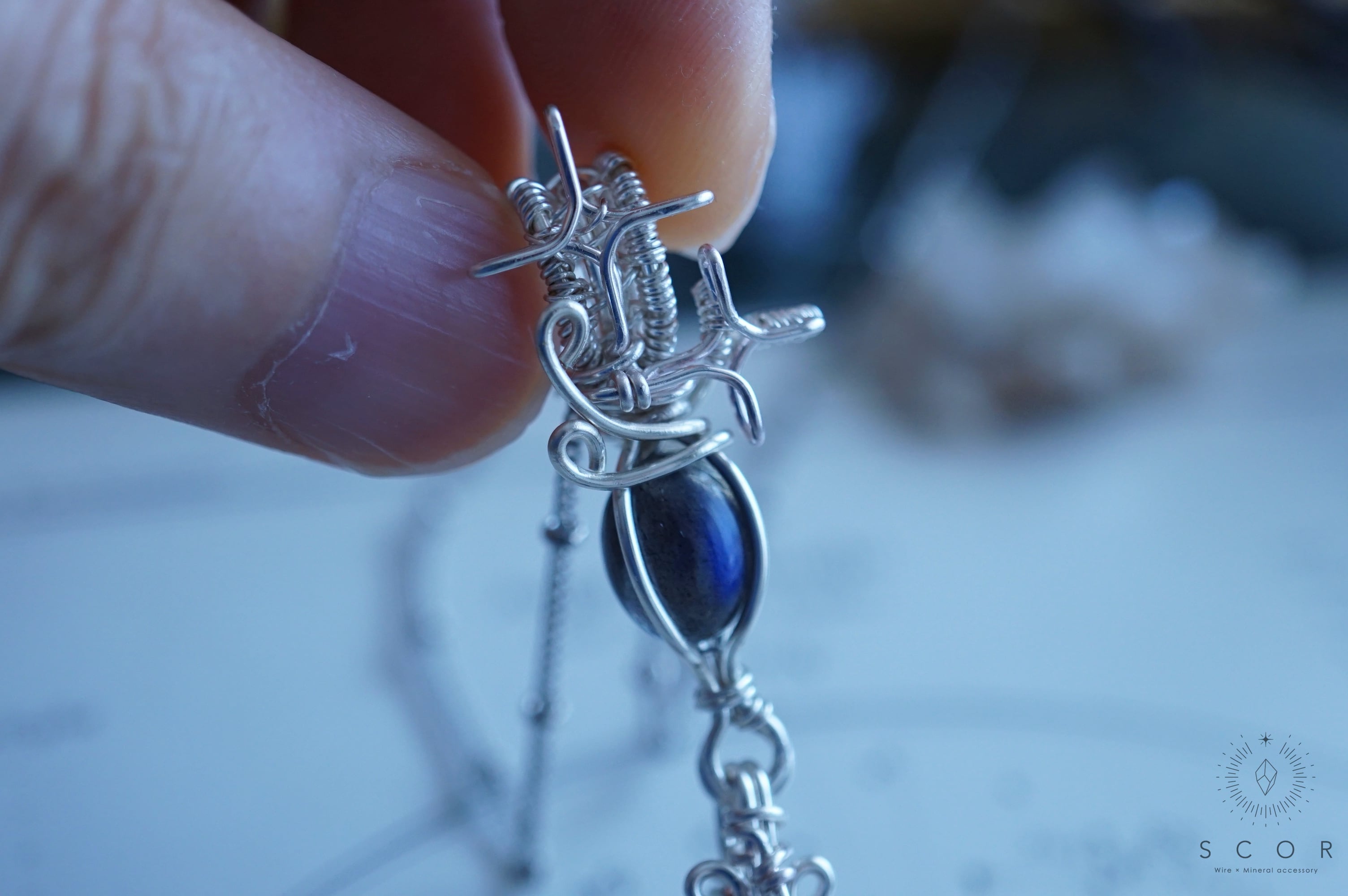 メインに使用したラブラドライトは、夜空のようなブルーのラブラドレッセンス(光沢)と、星屑のように煌めく内包物が美しい、マロン型のカボションを使用。