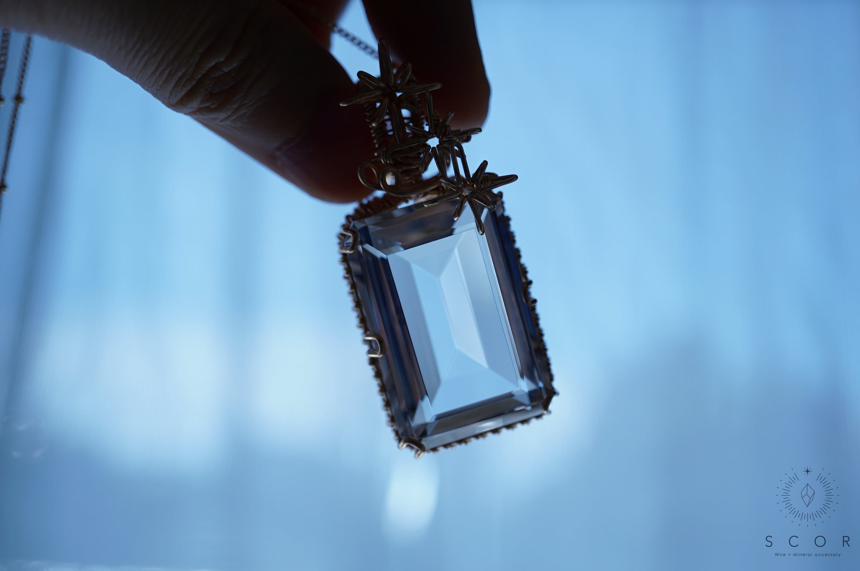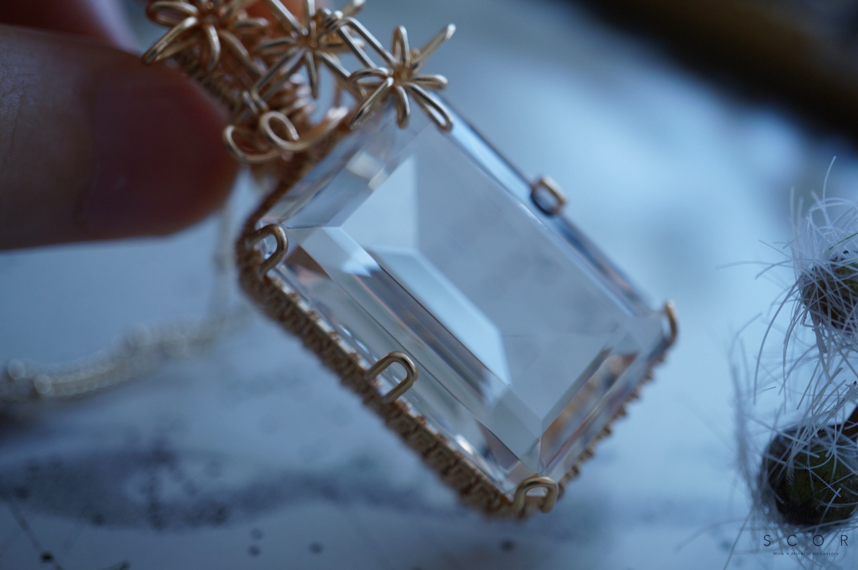 広いテーブル(正面側の最も広い面)を持つエメラルドカットが、内包物のない、無垢な水晶の美を際立たせ、光が当たると、真っ直ぐな稜線が浮かび上がります。
