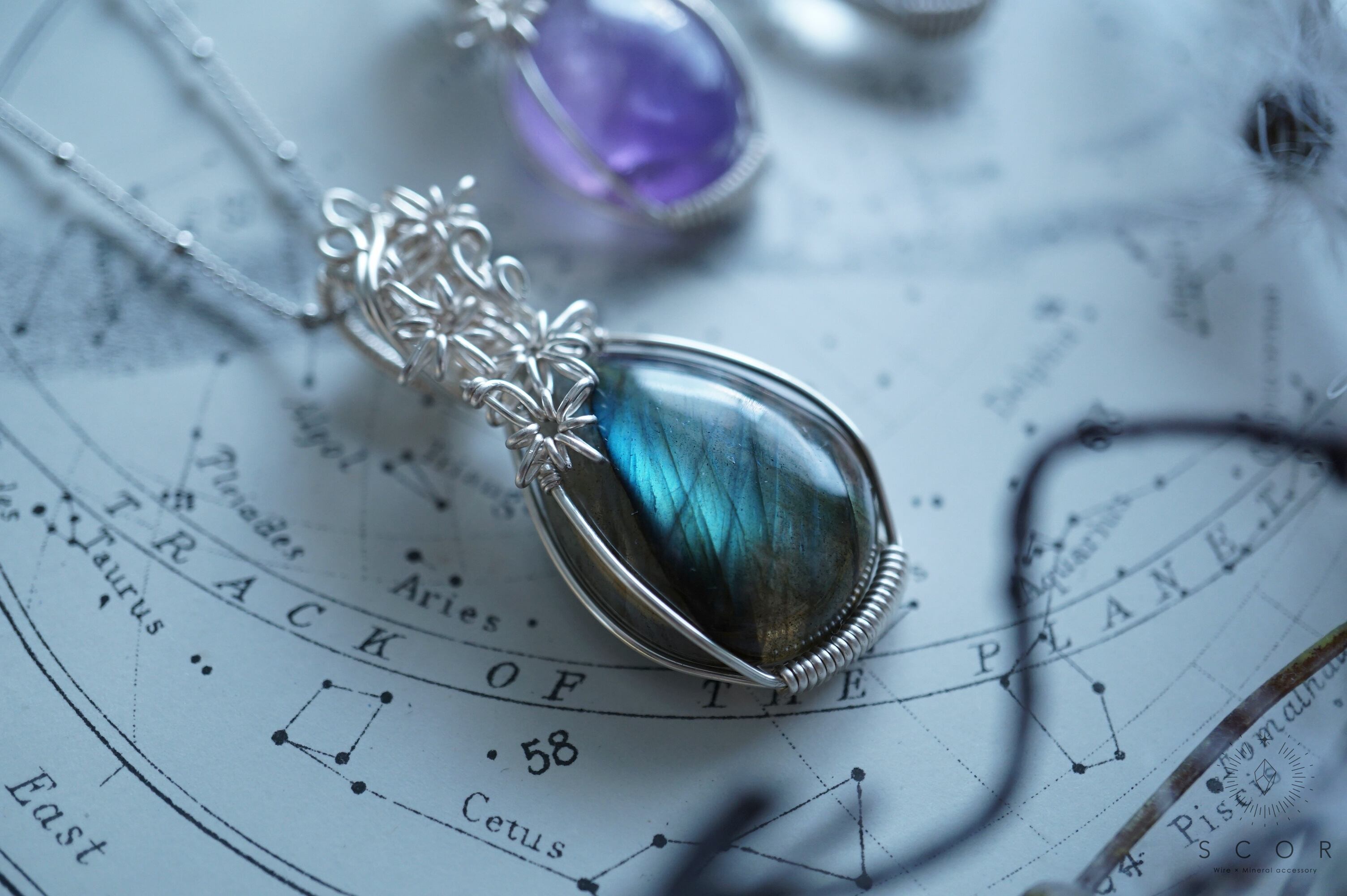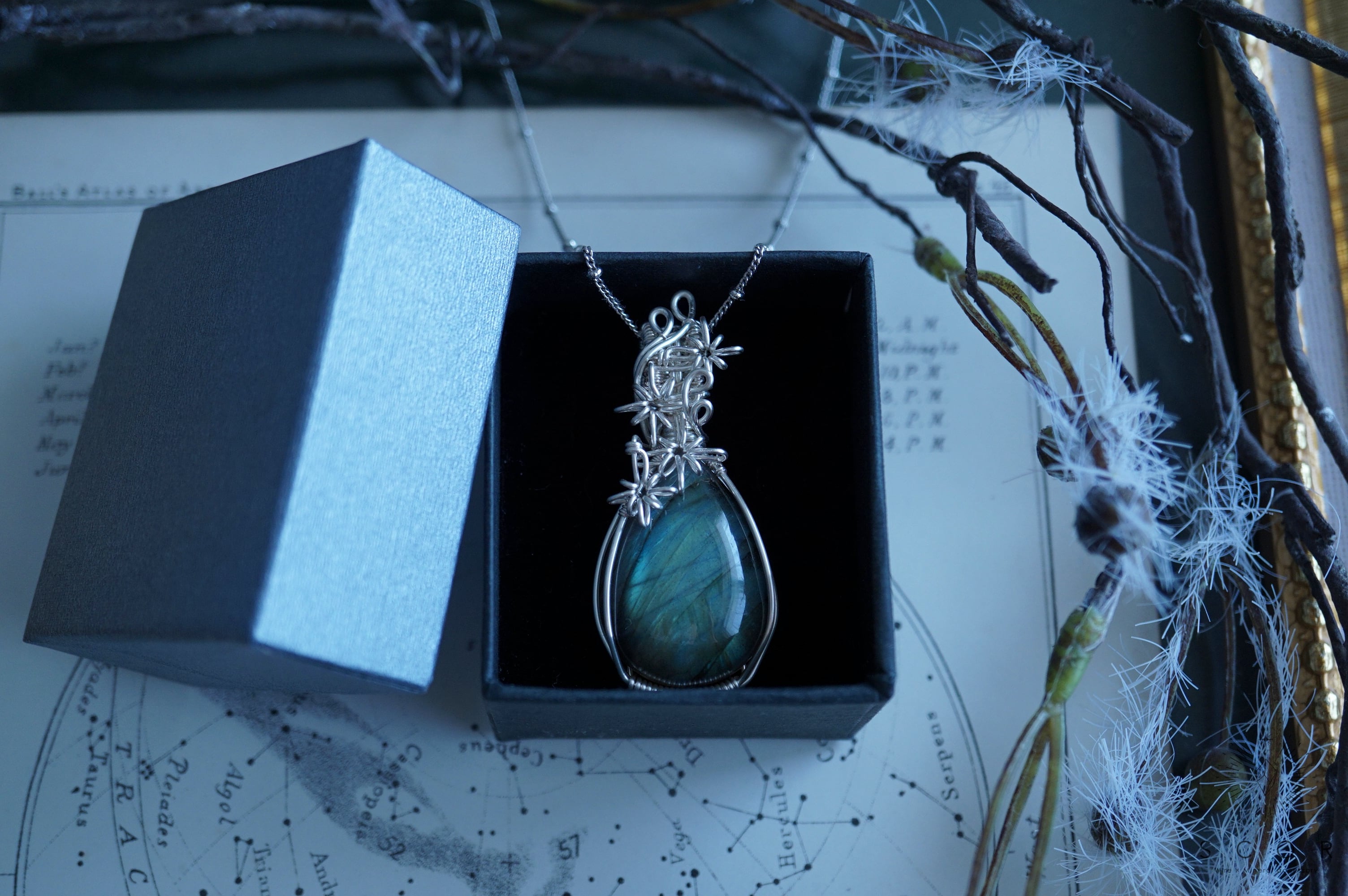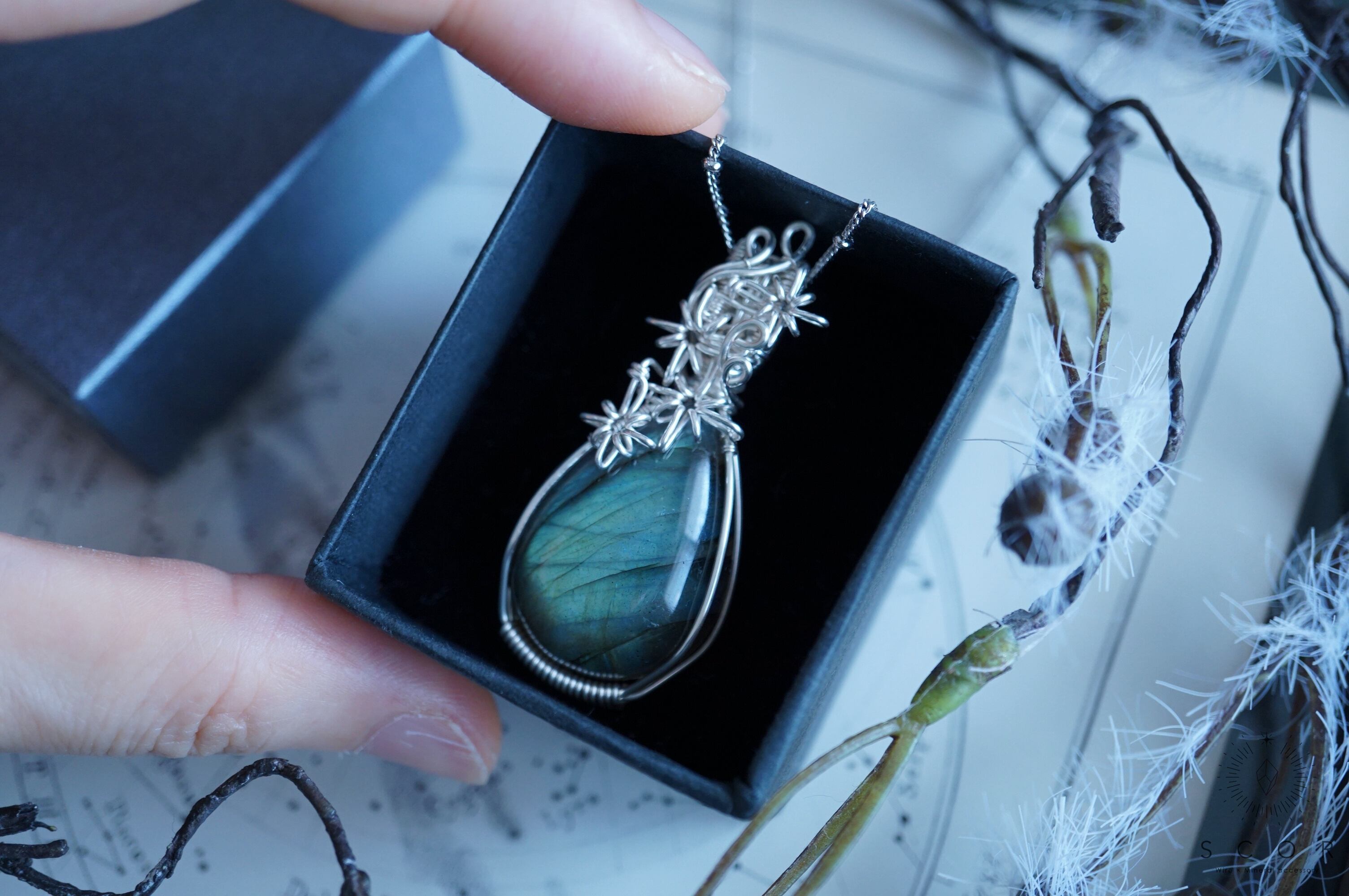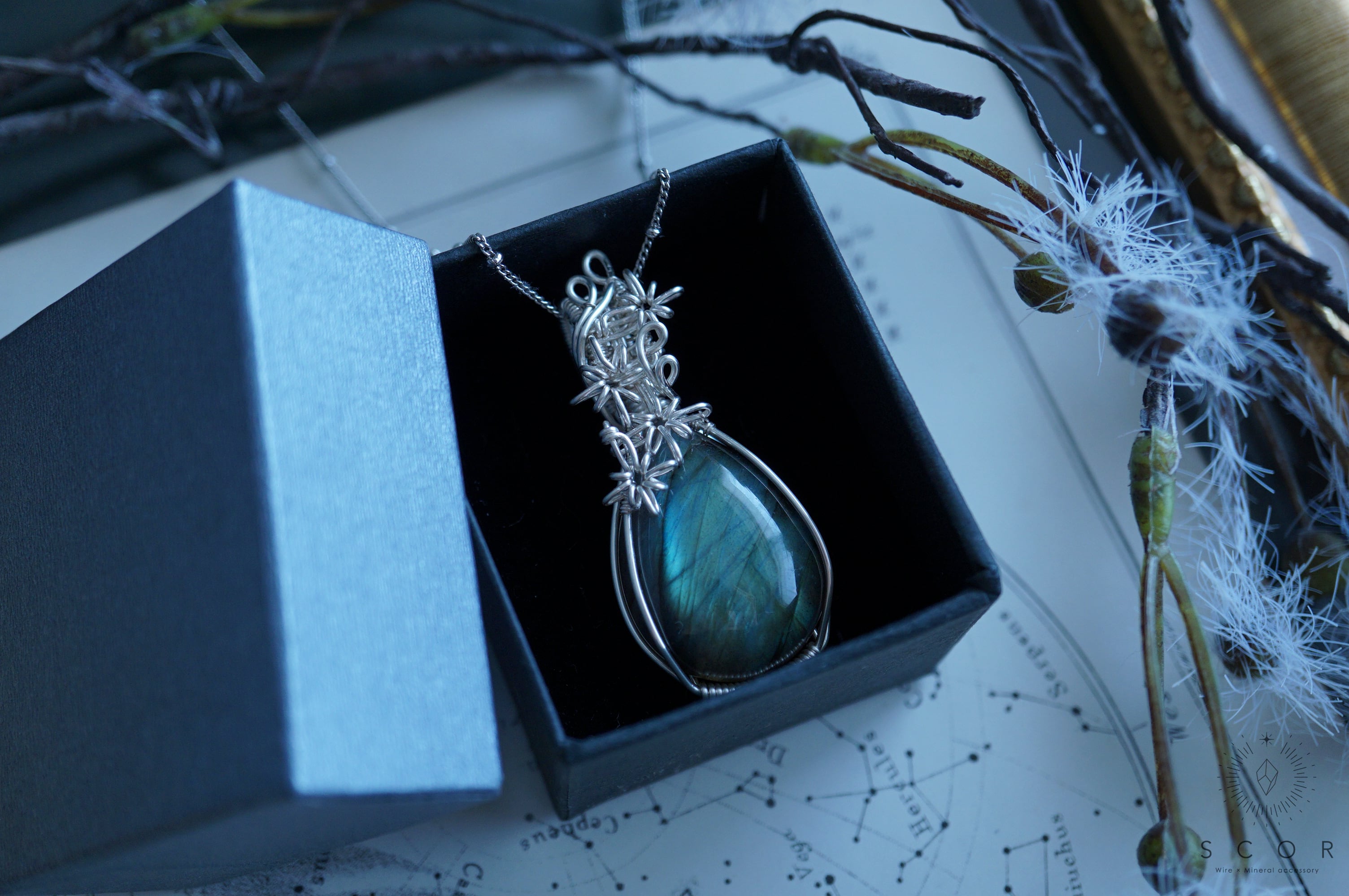 黒や濃い色の服と合わせると、ラブラドライトの色合いと、ワイヤー装飾のディテールが際立ちます。