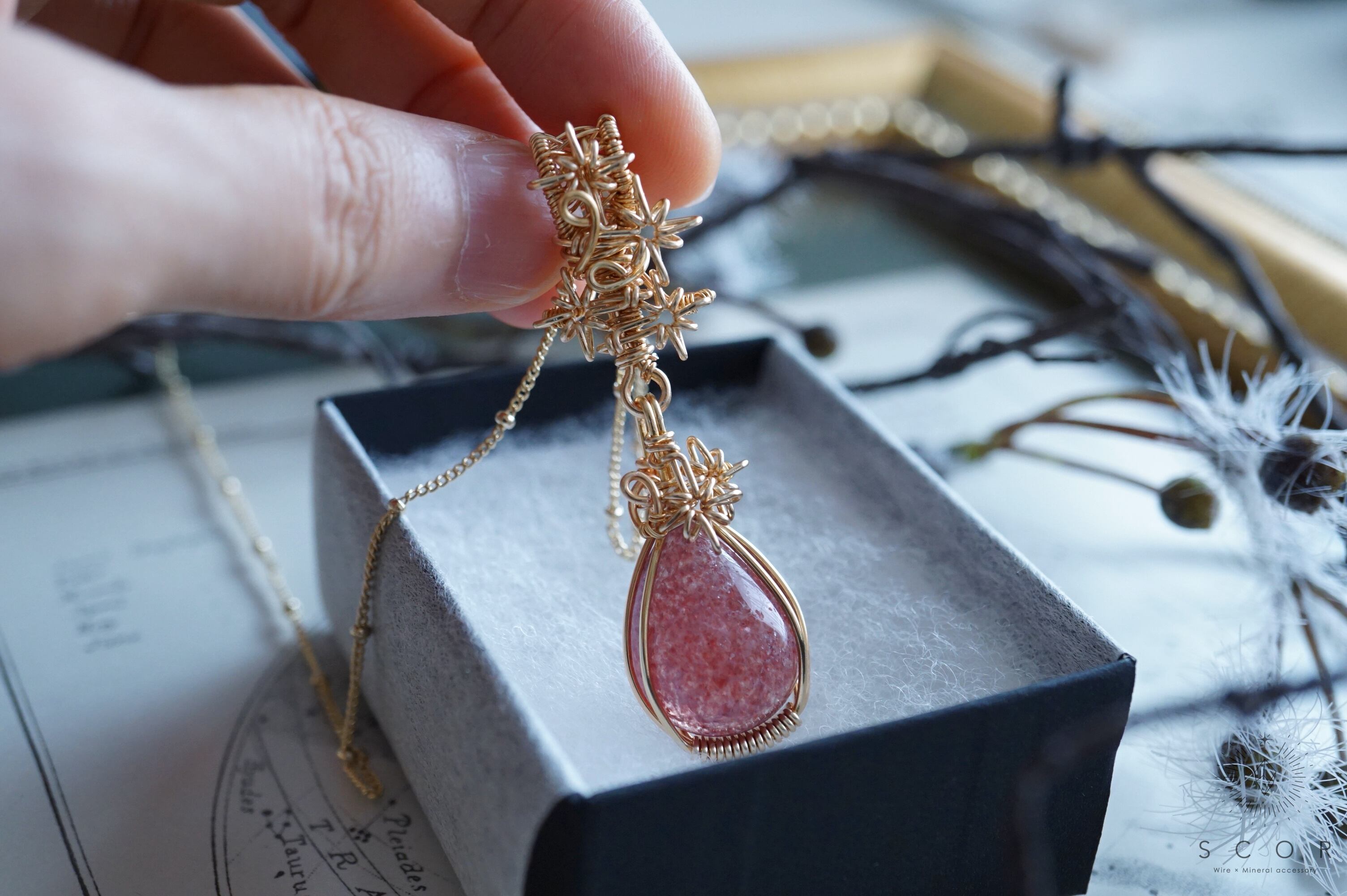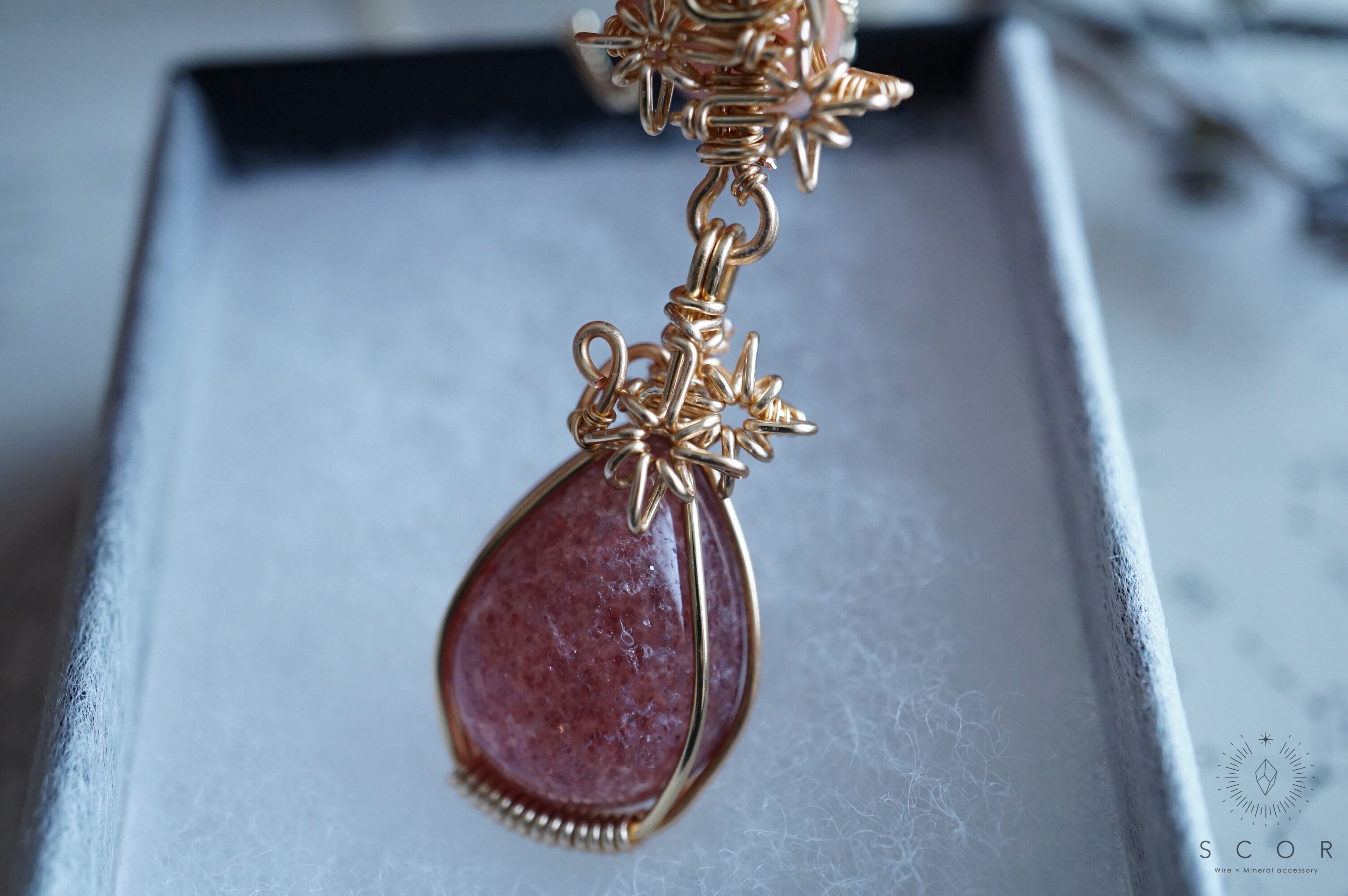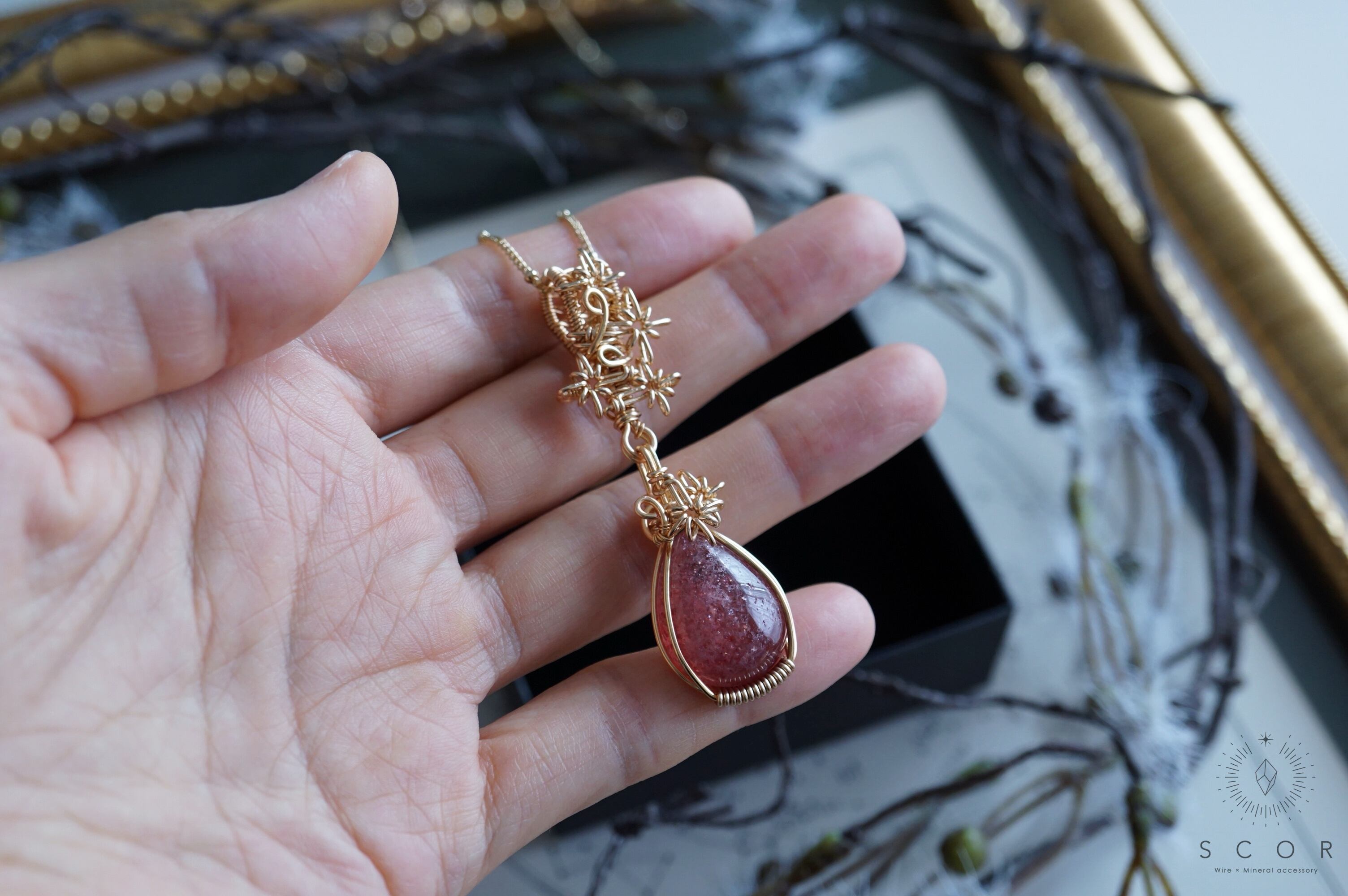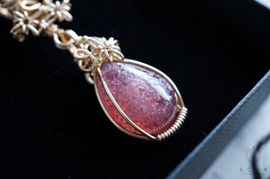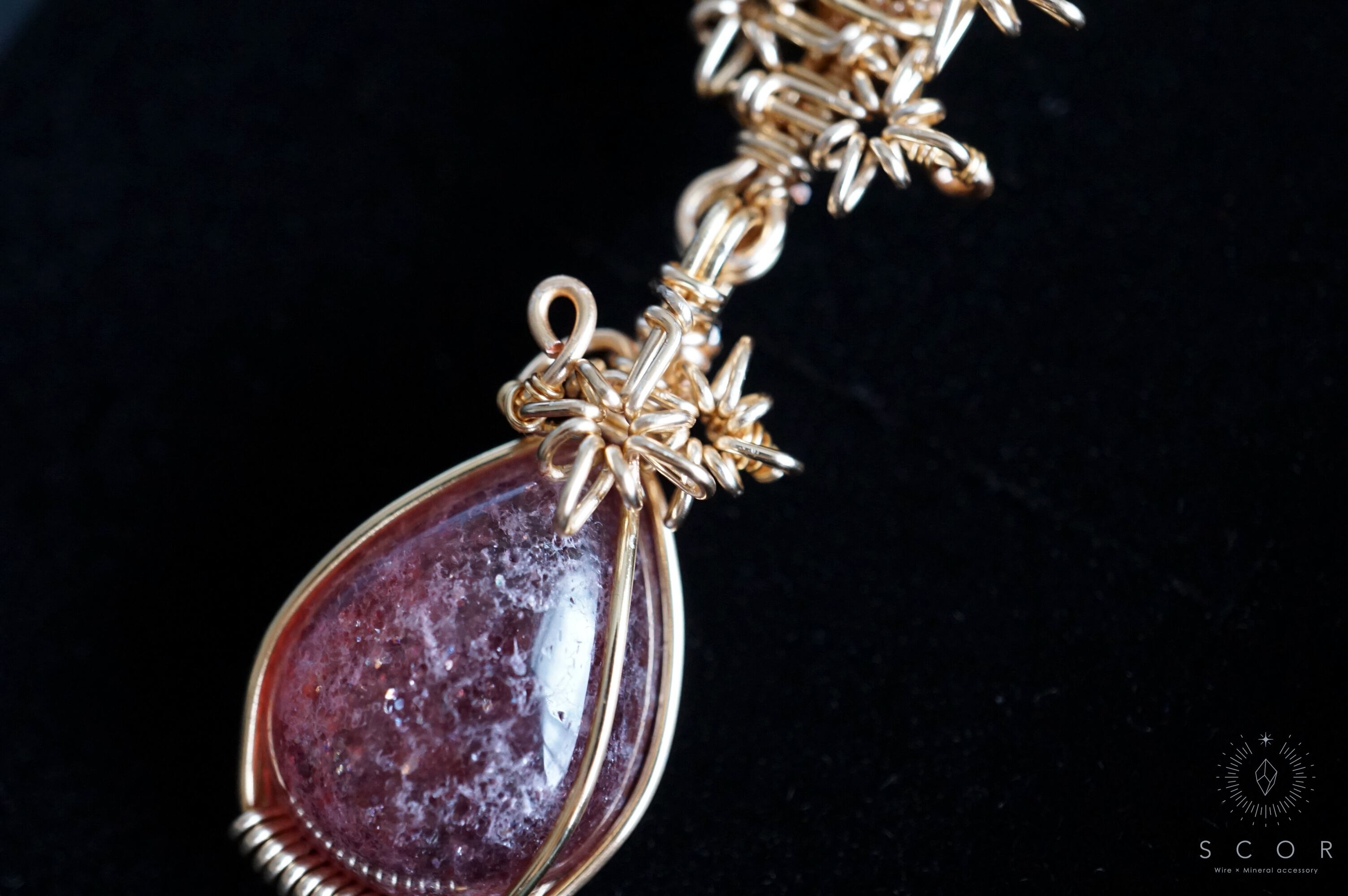 白や淡い色の服と合わせると、レッドアベンチュリンクオーツシストのプラムピンク色とワイヤーのゴールド色が、華やかでシックなコーディネイトに。