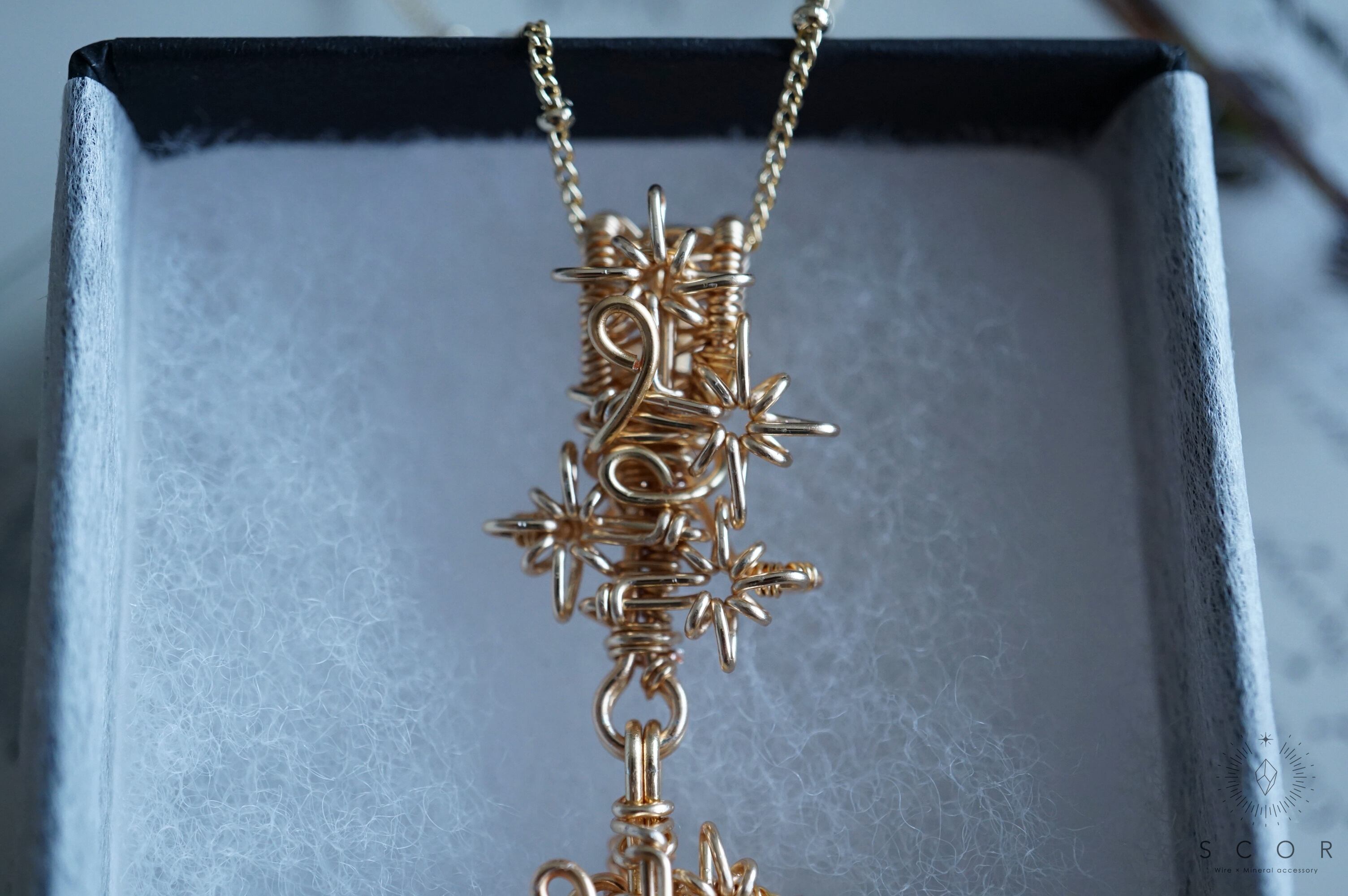 ワイヤー切断面は、なるたけ表に出ないように処理をしていますが、ストール、マフラー、レースなどと共に身につける際は、引っかかりにご注意ください。