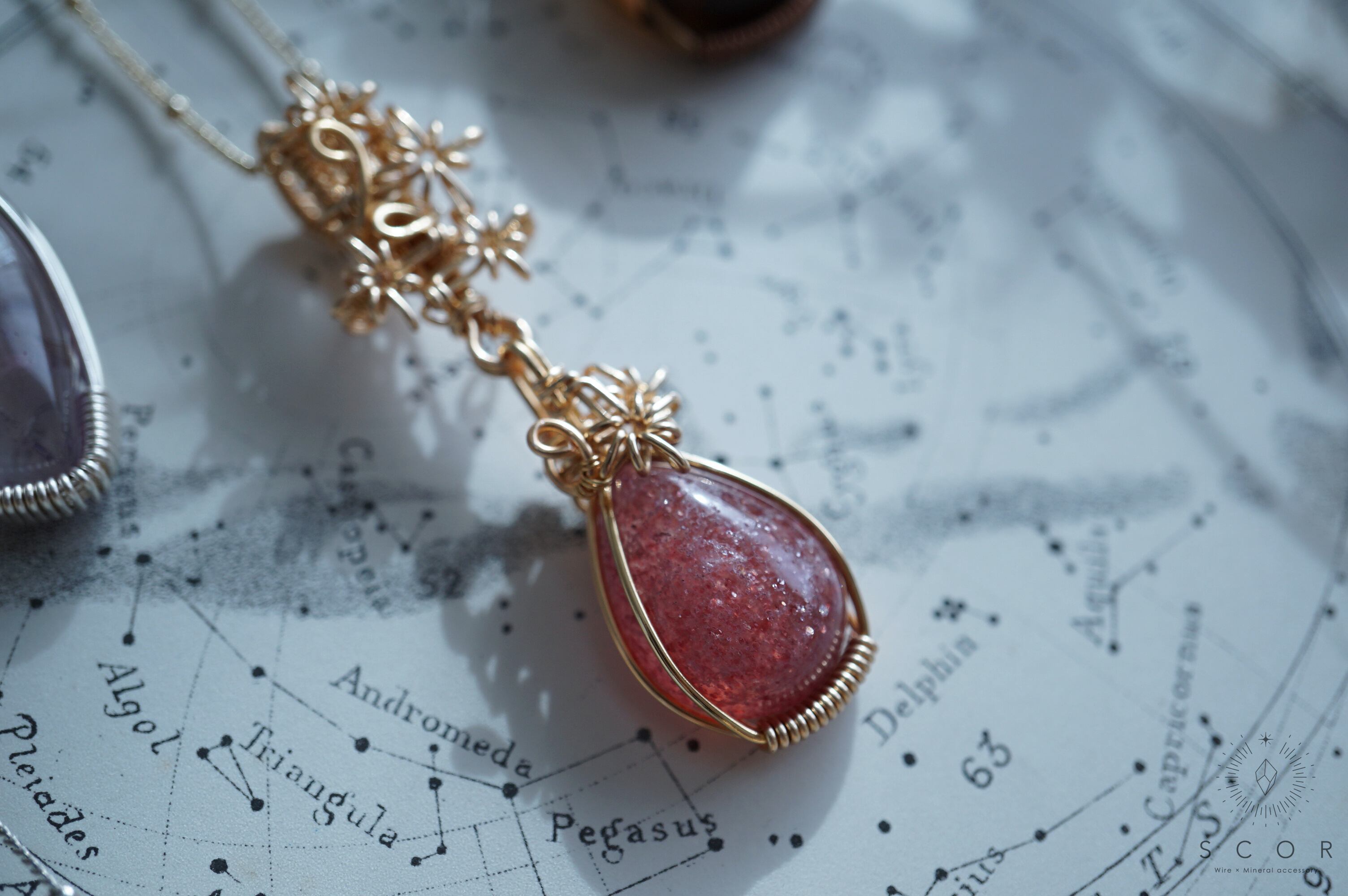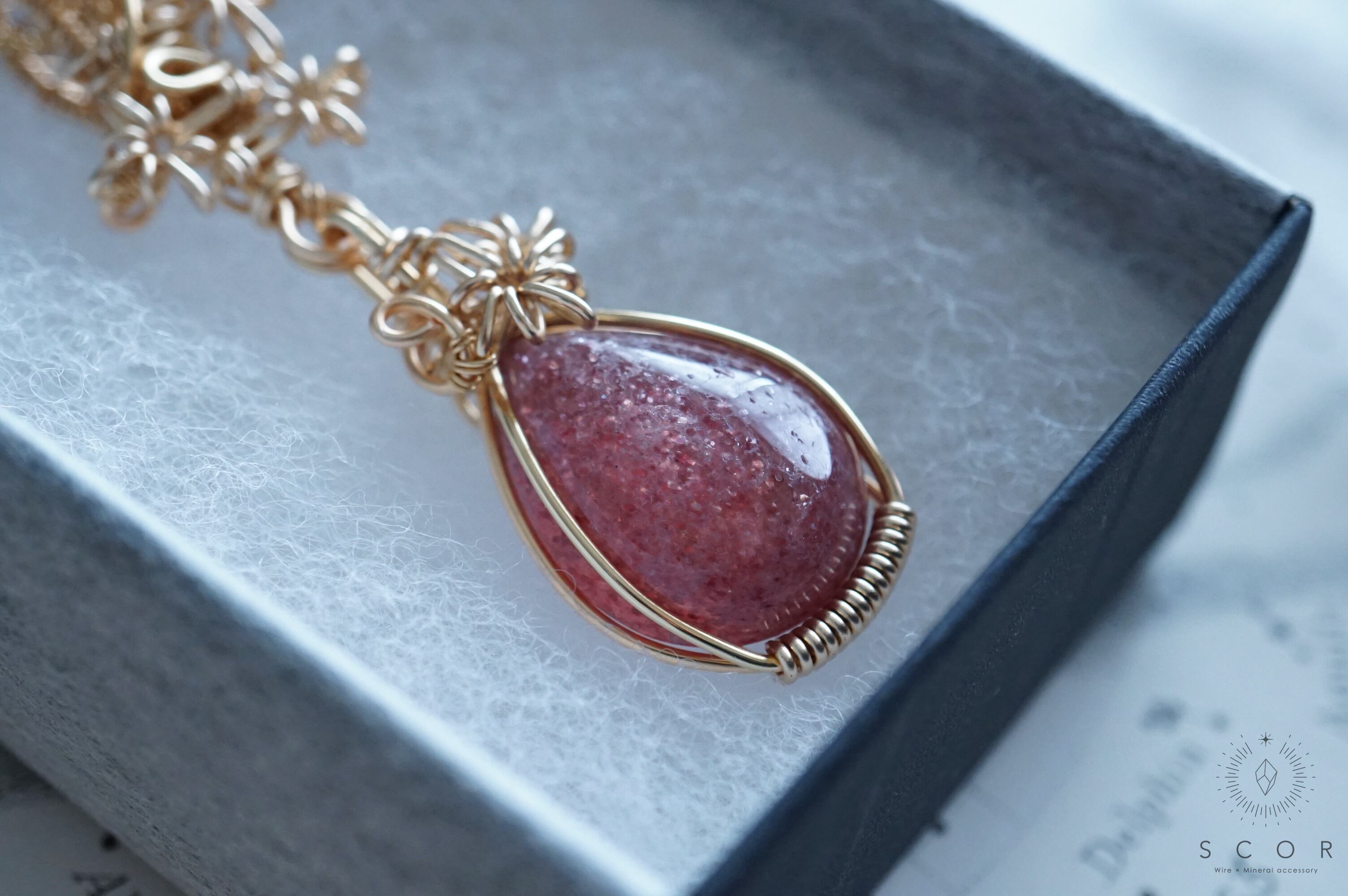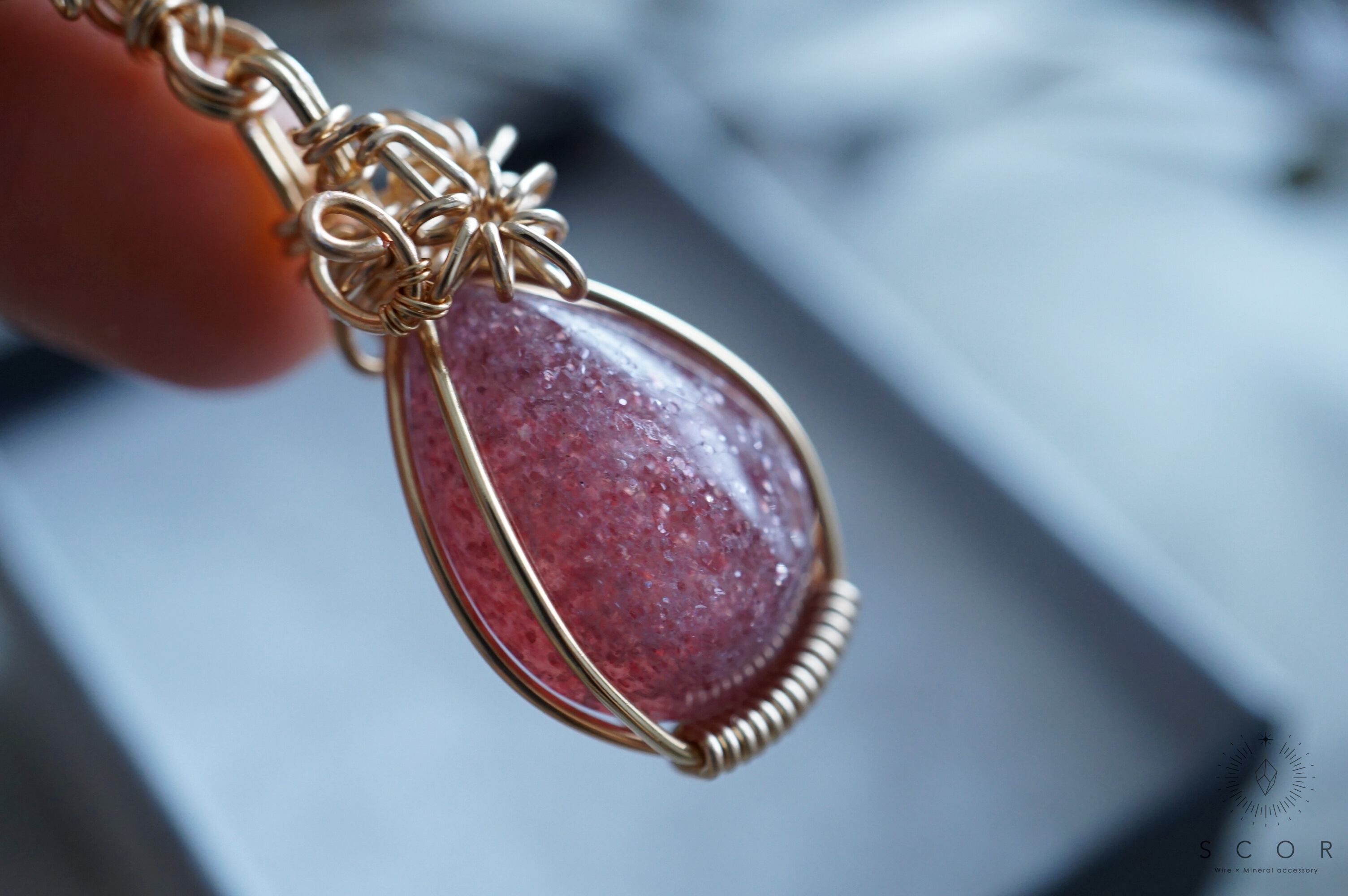 大粒のラメをぎゅっと固めたようなレッドアベンチュリンクオーツシストは、揺れることで煌めきの変化が楽しめるチャームに仕立てました。