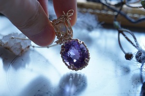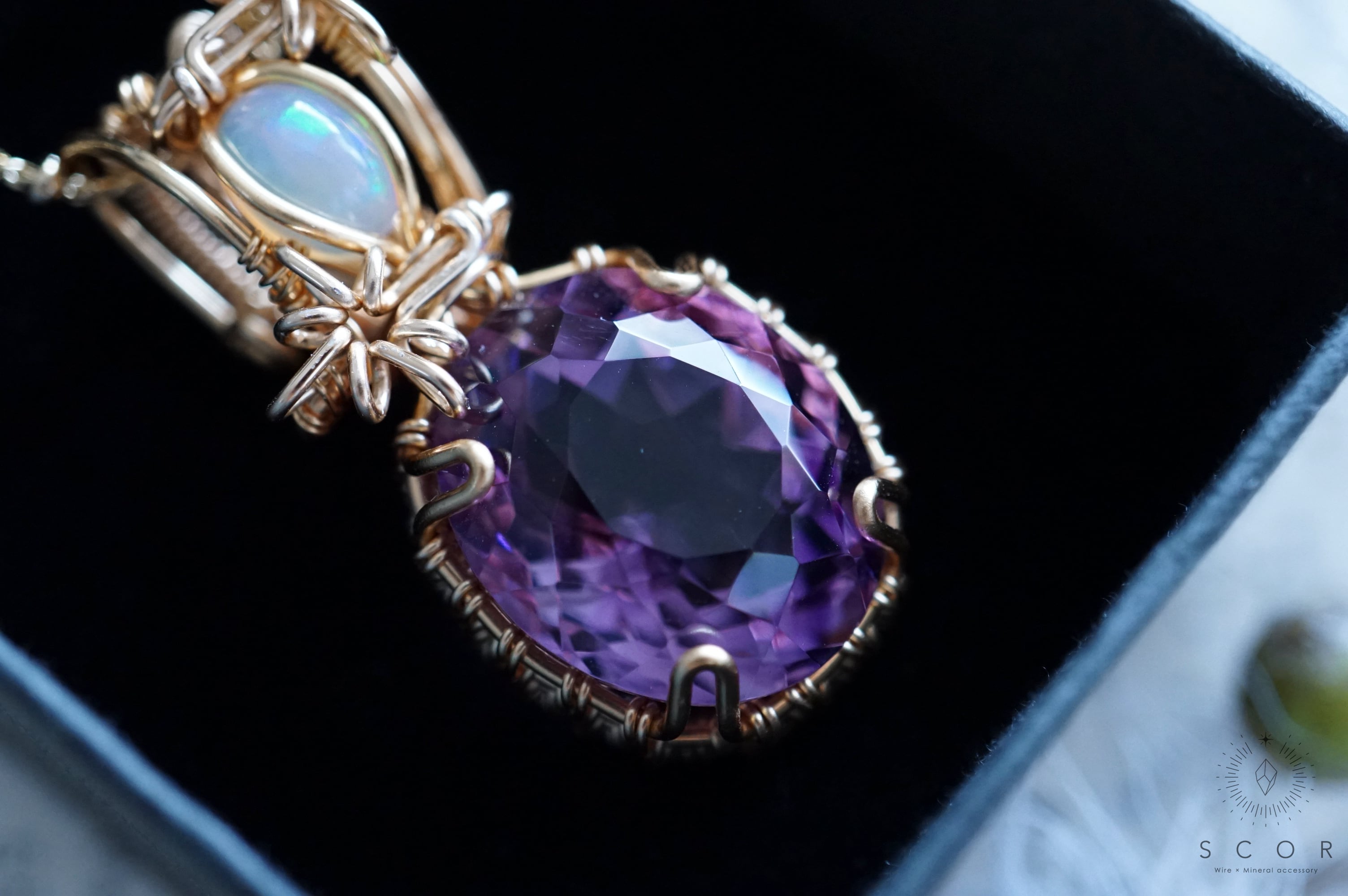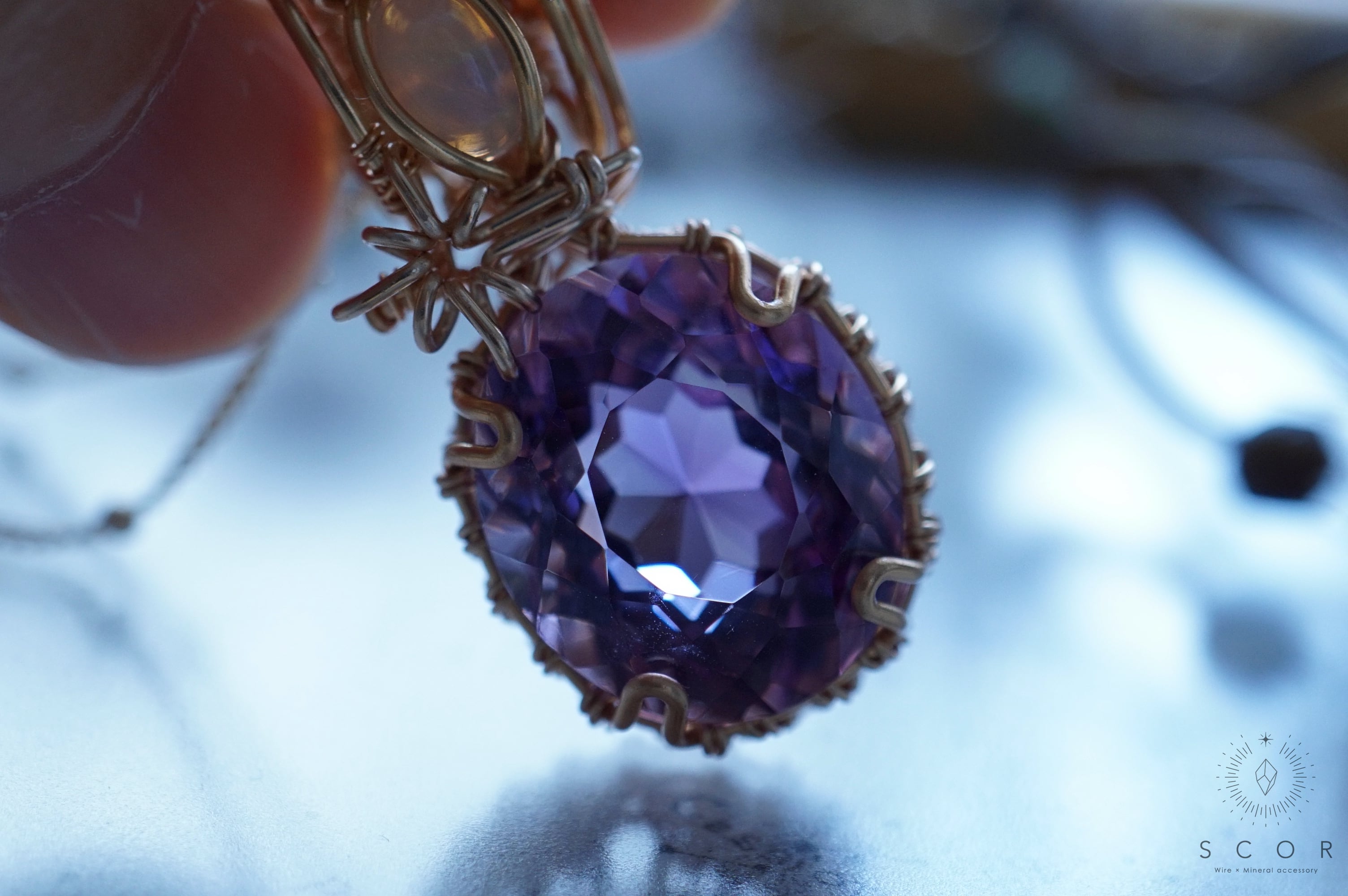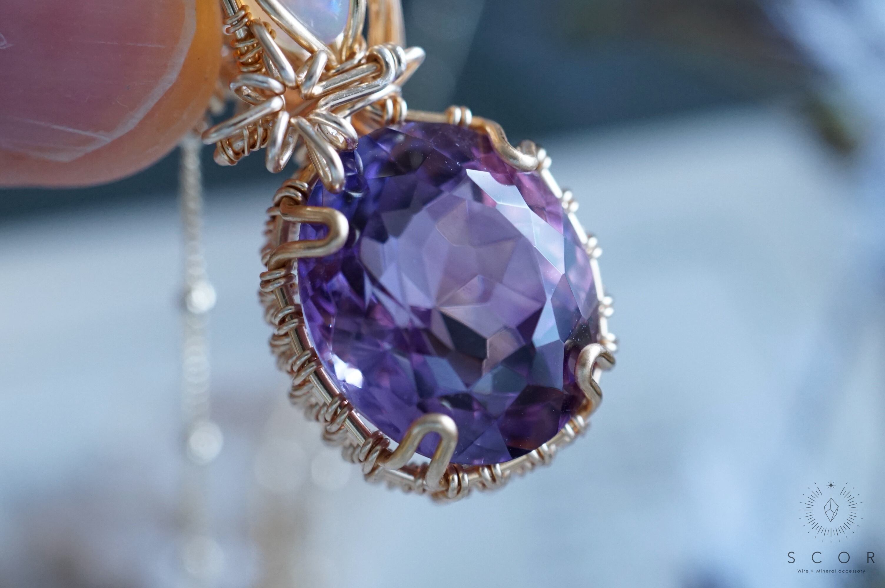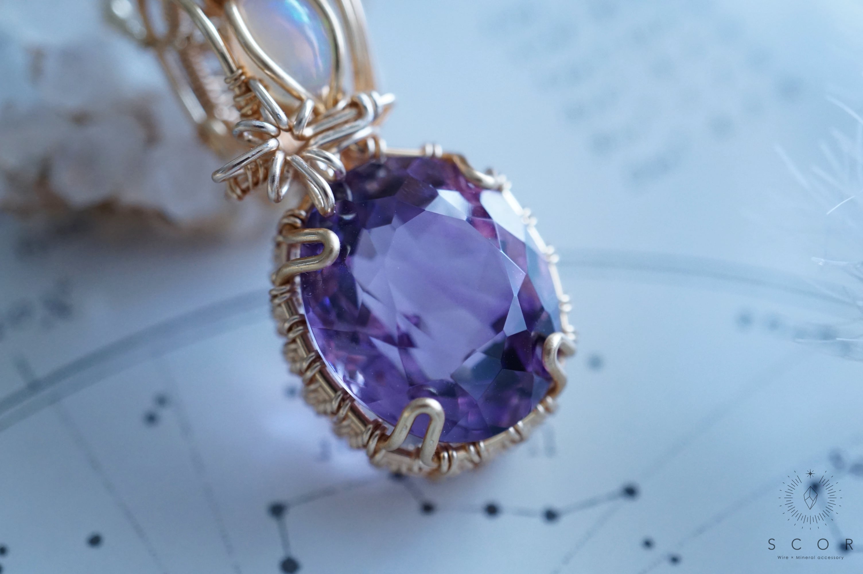 アメジストは、高い透明度と、華やかな紫色が魅力的なファセットカットのピースを使用。