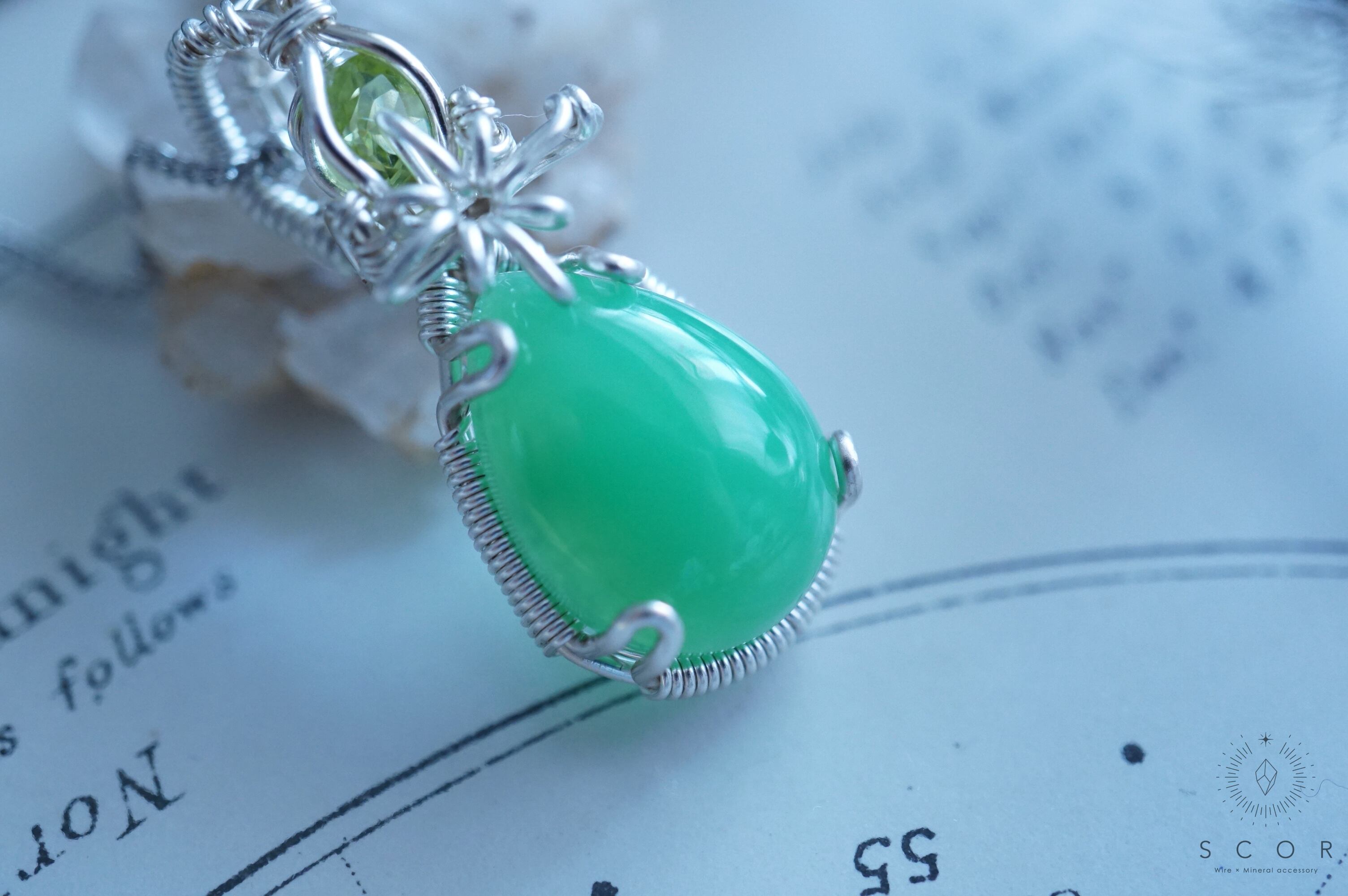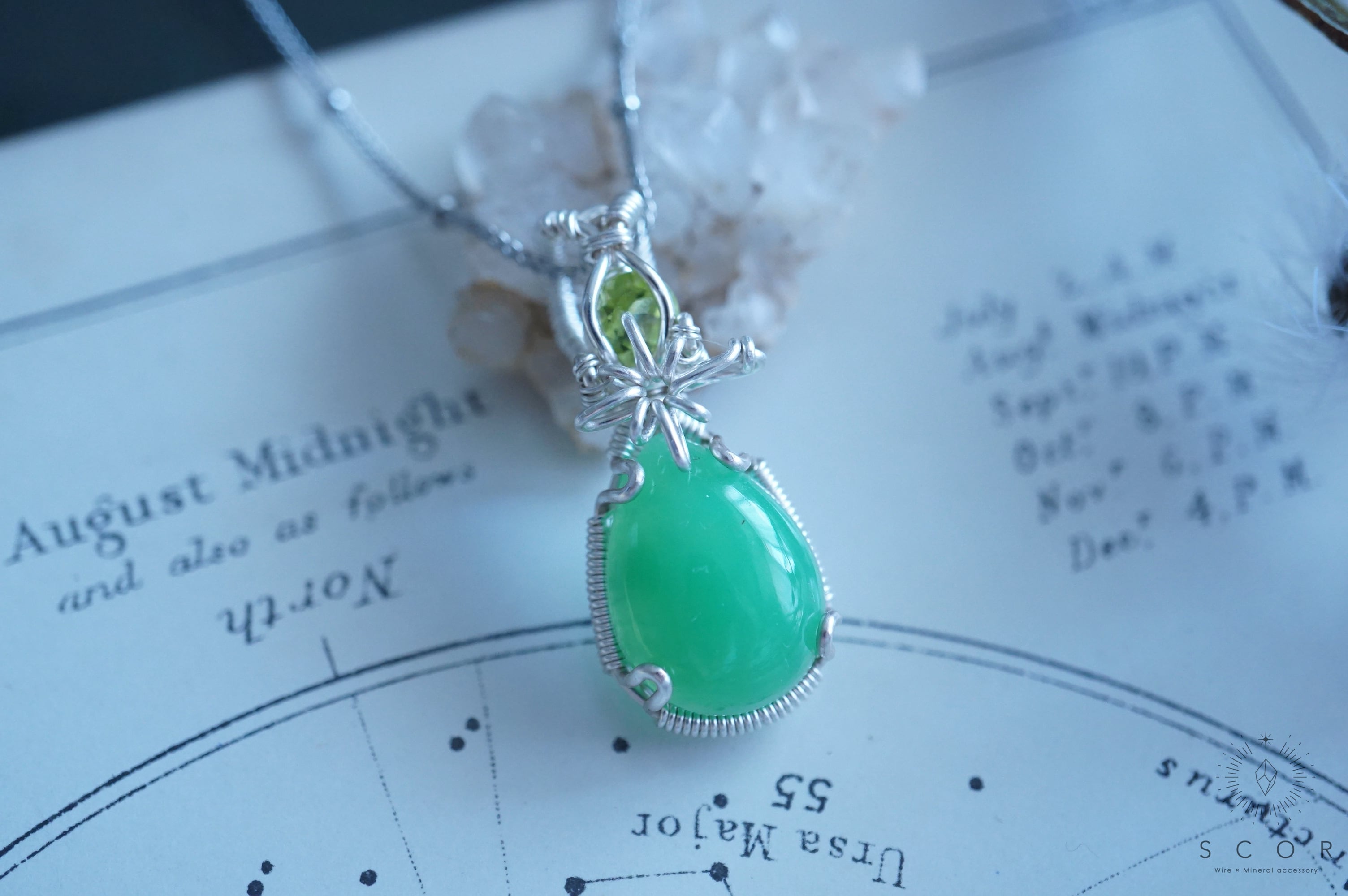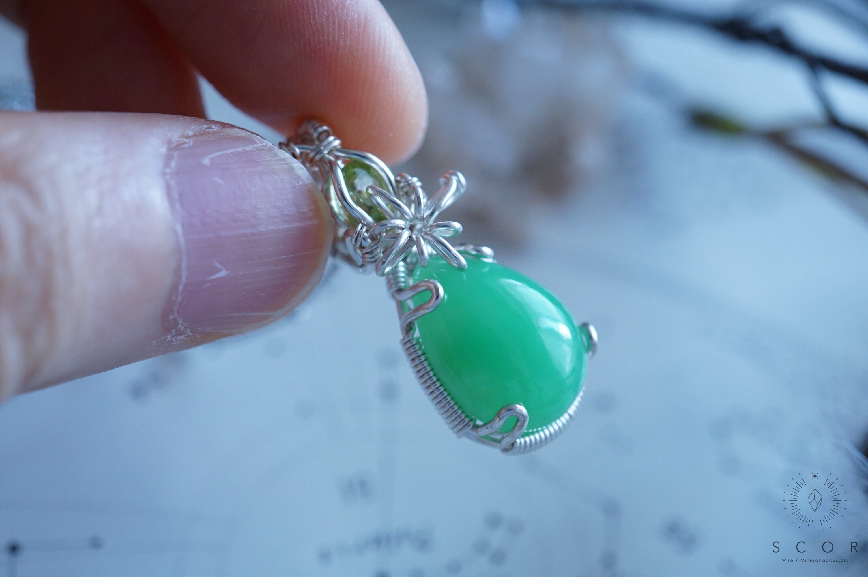 クリソプレーズは、濡れたような艶のある雫型のカボションを使用。