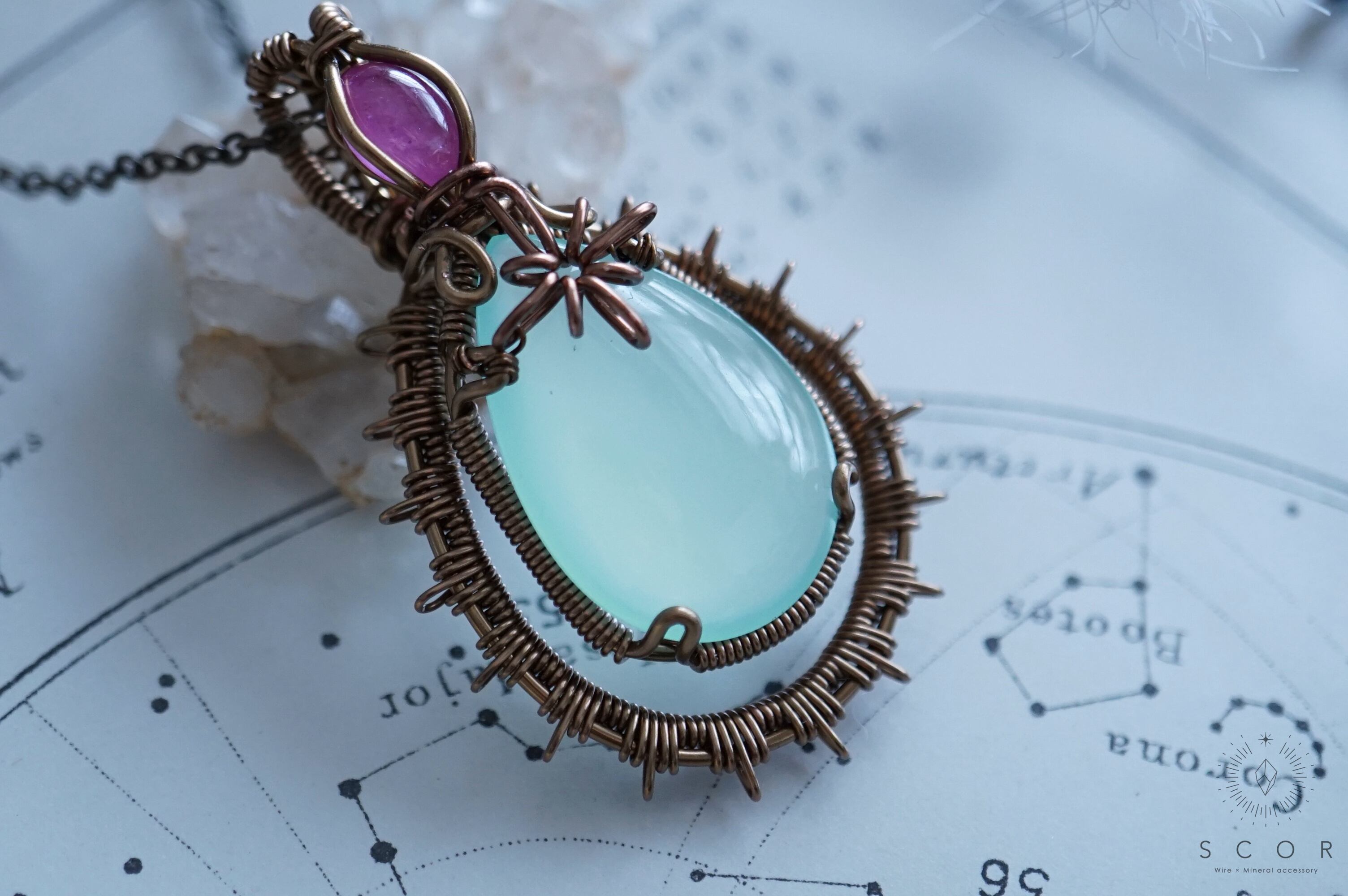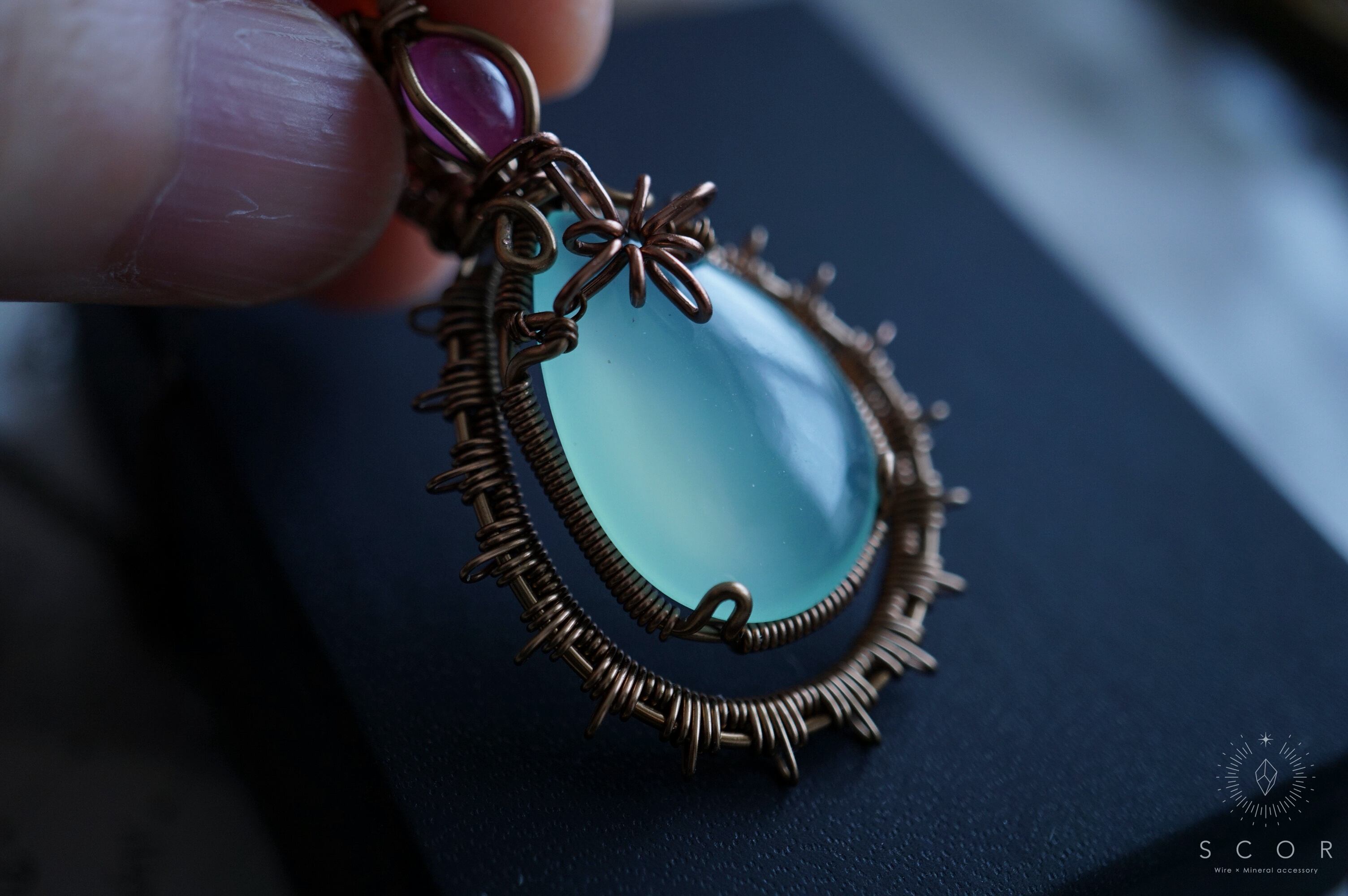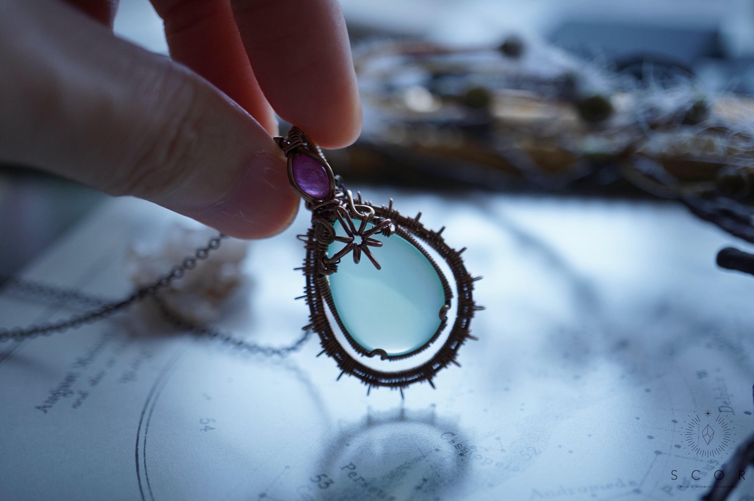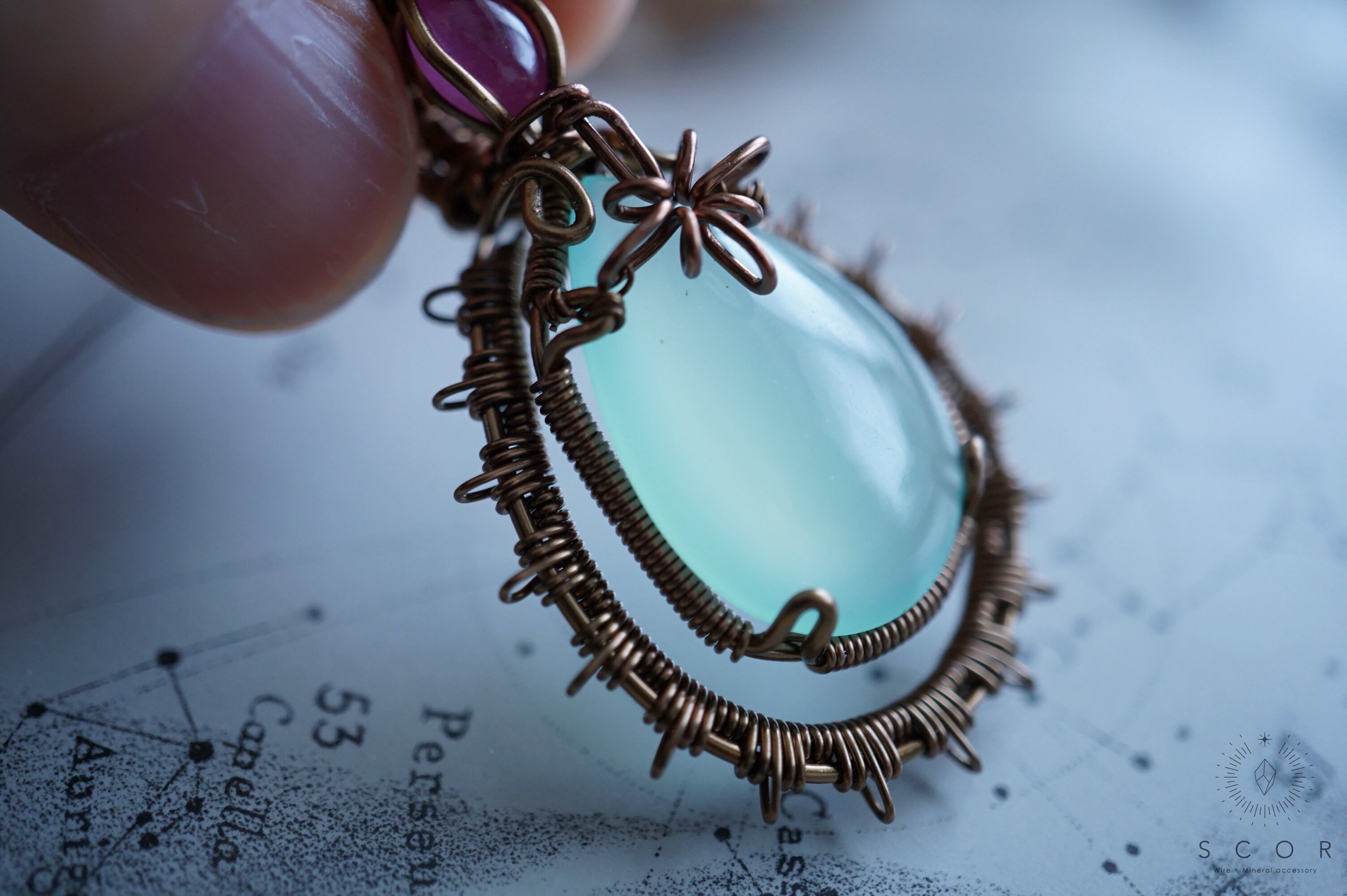 カルセドニーに重ねた光芒型のワイヤーモチーフは、水の色をした架空の星に重なる一等星をイメージ。