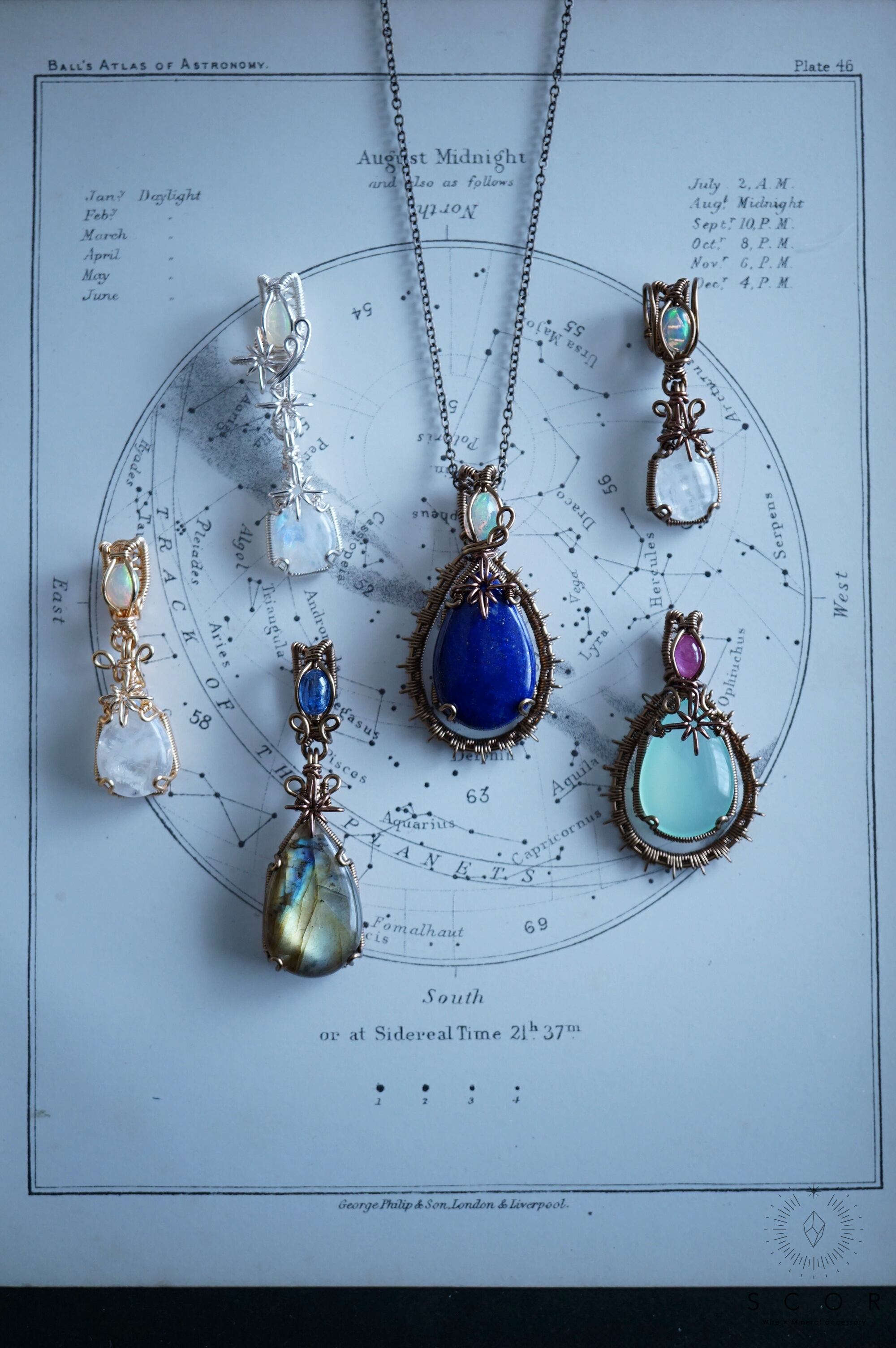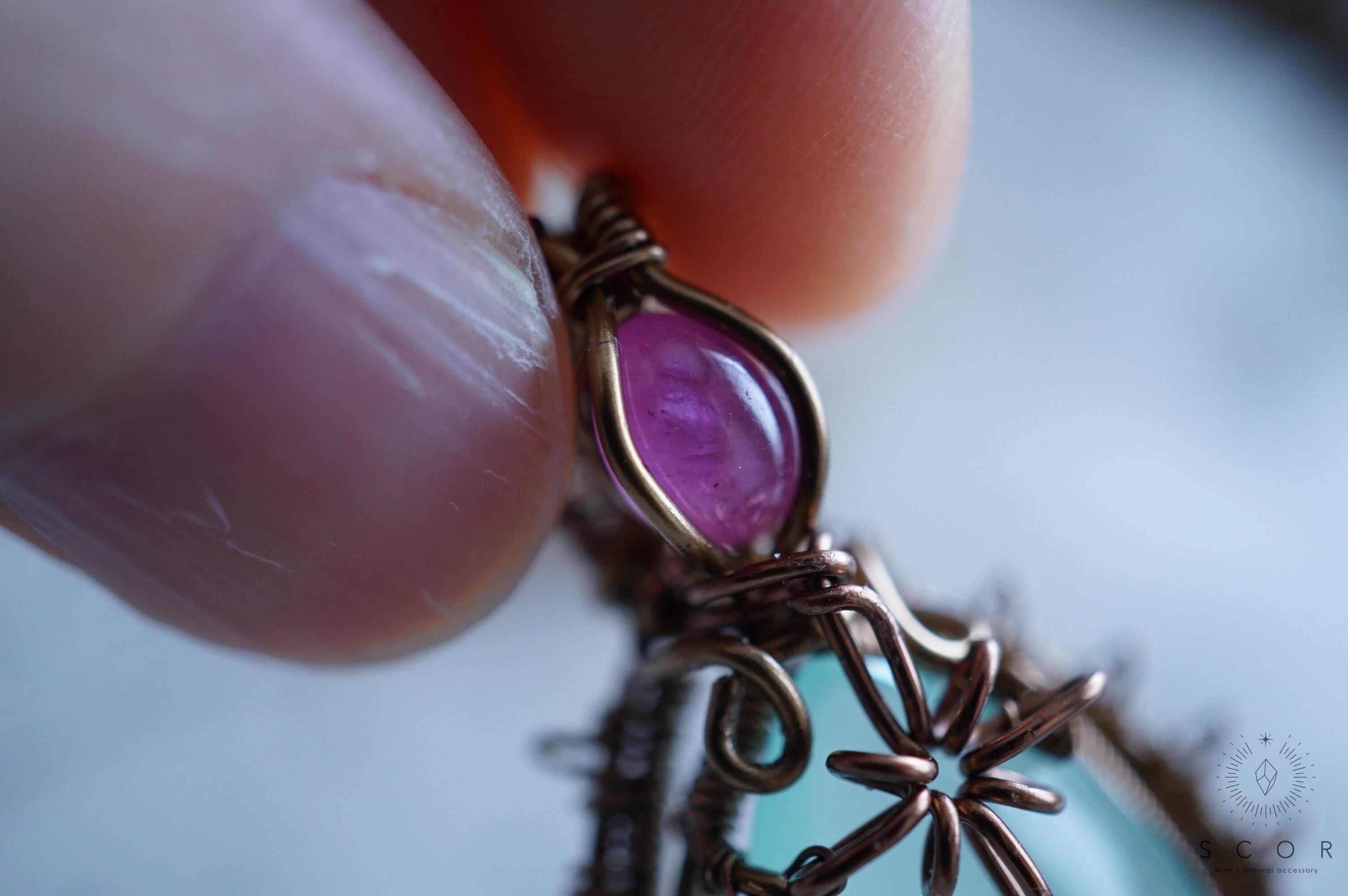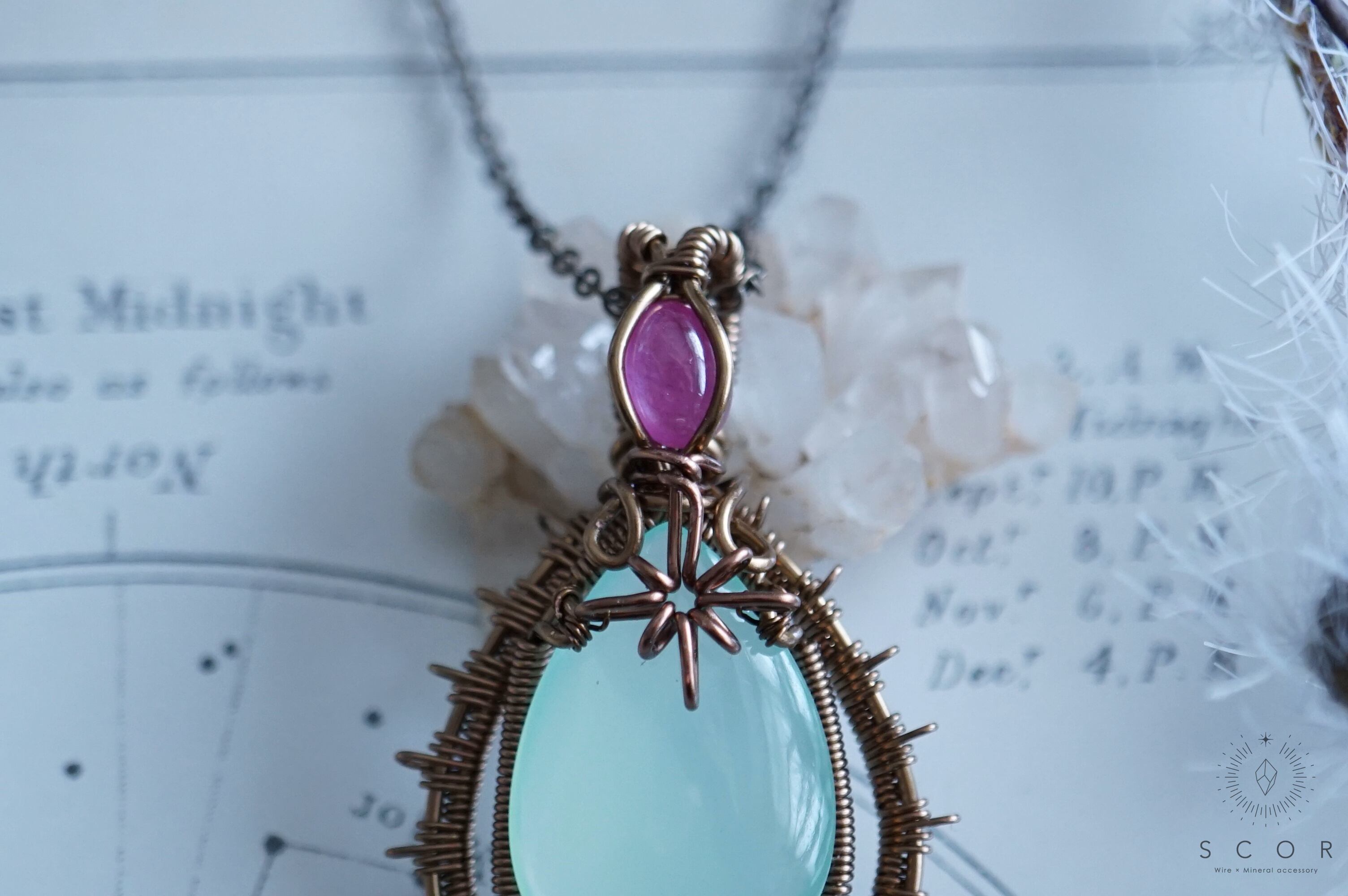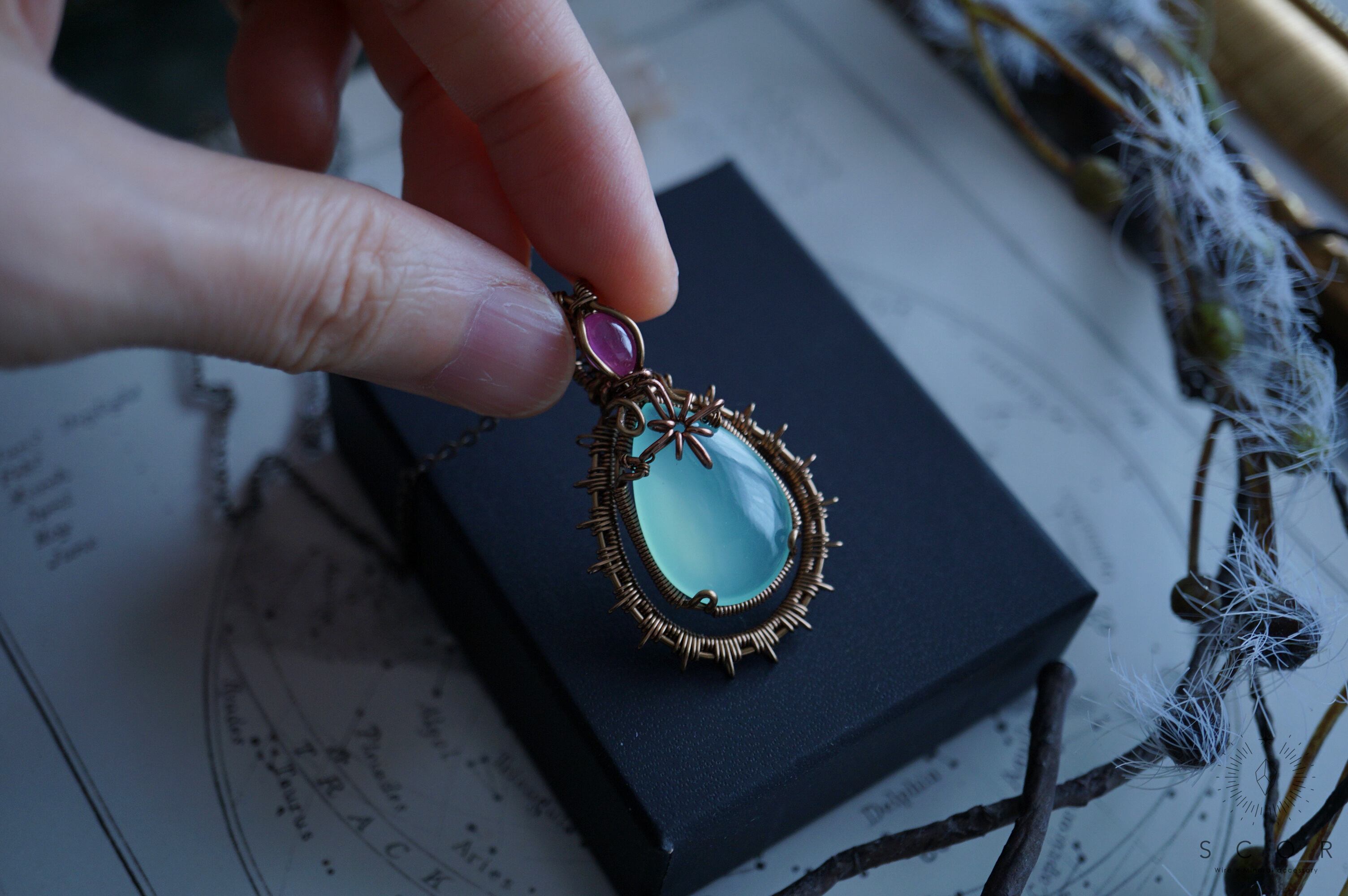 カルセドニーに重ねた光芒型のワイヤーモチーフは、水の色をした架空の星に重なる一等星をイメージ。