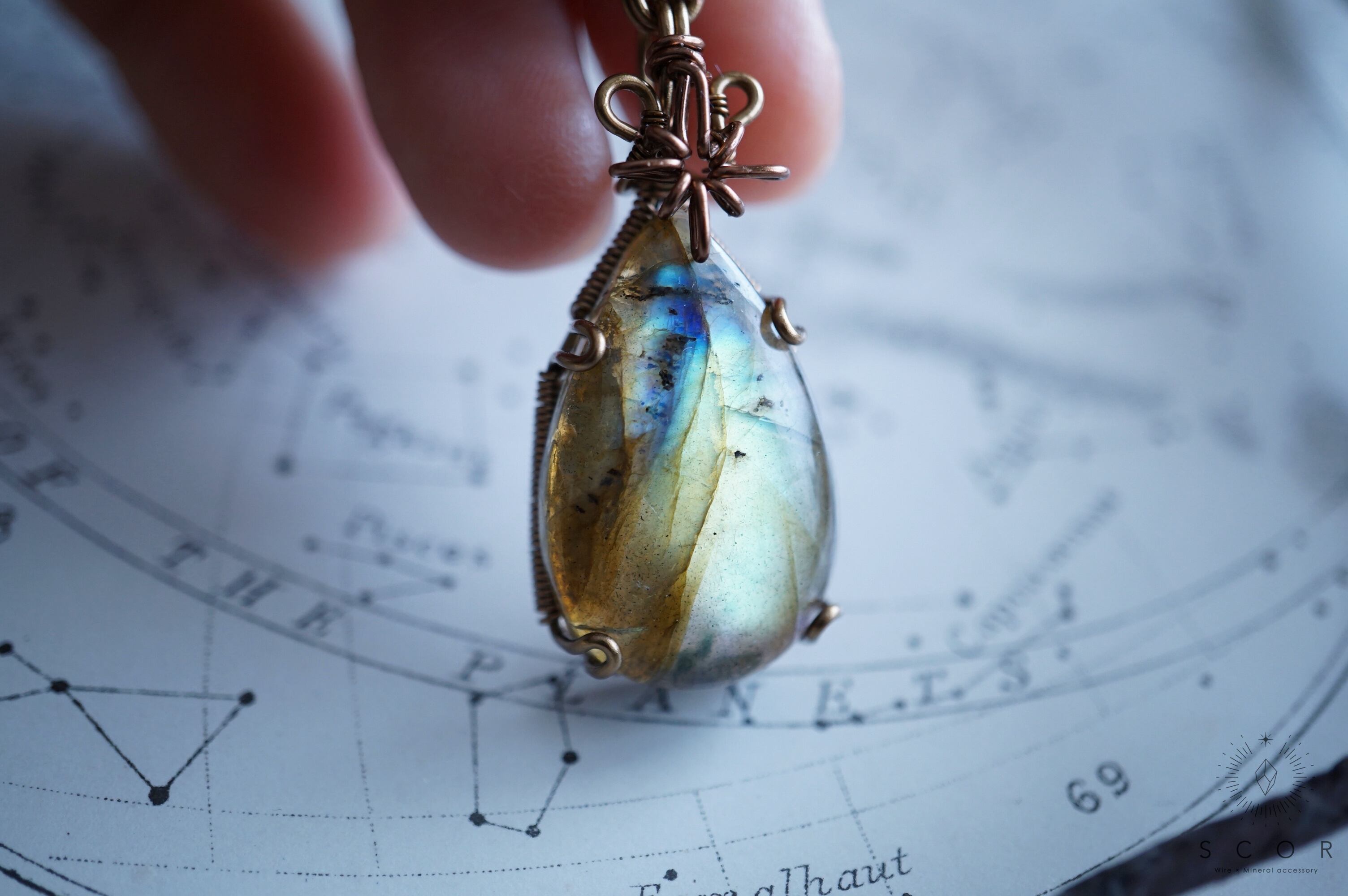 ラブラドライトは、ペアシェイプの艶やかなカボションを使用。