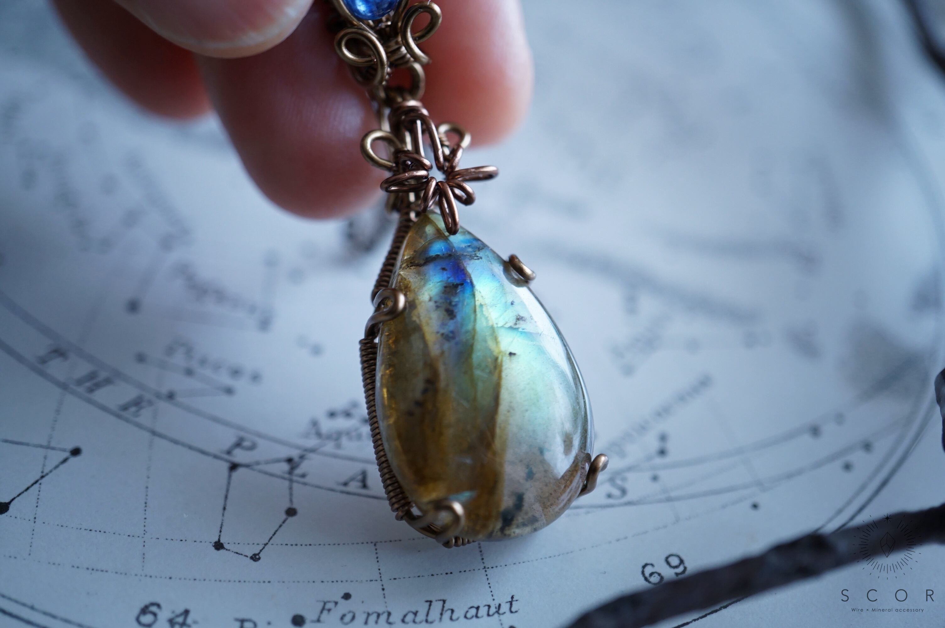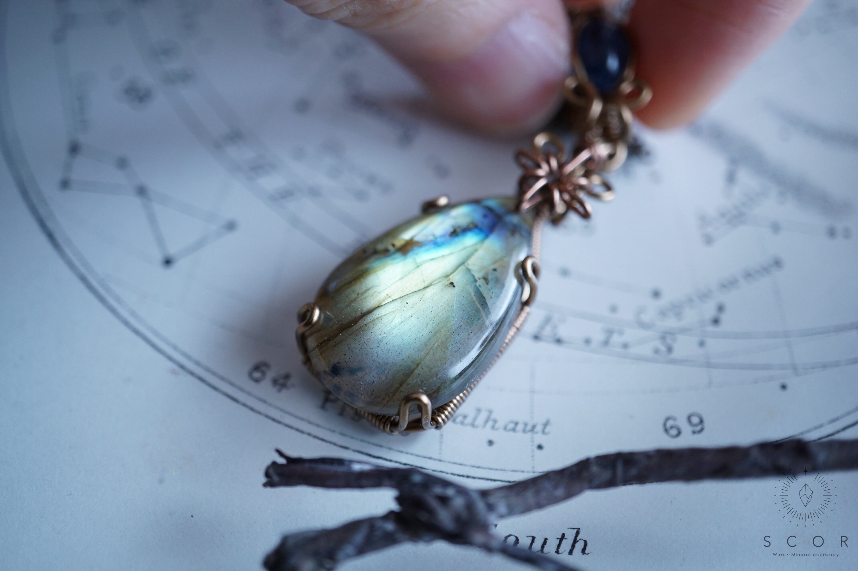 「衛星(カイヤナイト)の色が惑星(ラブラドライト)に映されている様子」をイメージし、ラブラドライトのブルーに合わせて選んだピースです。