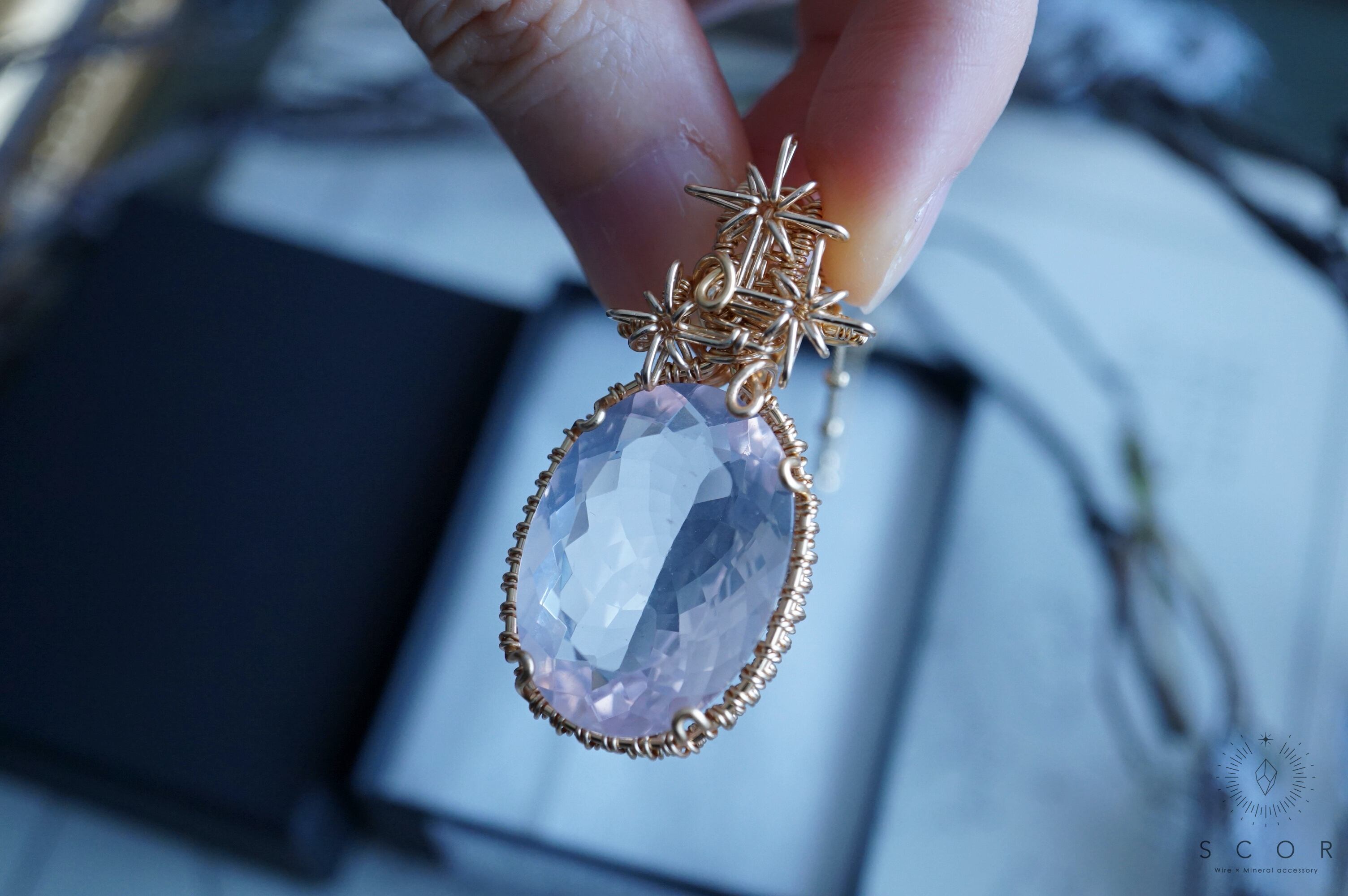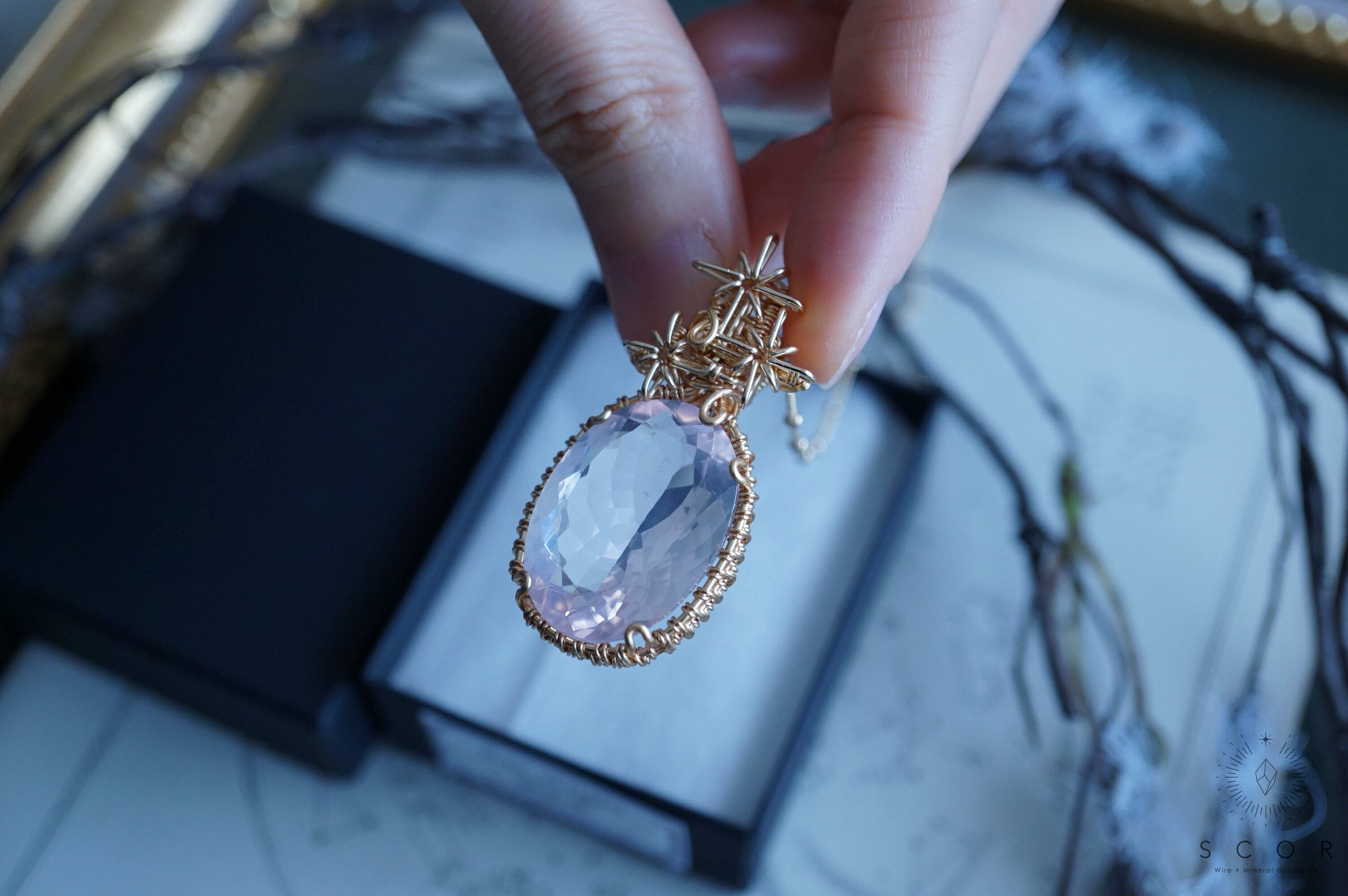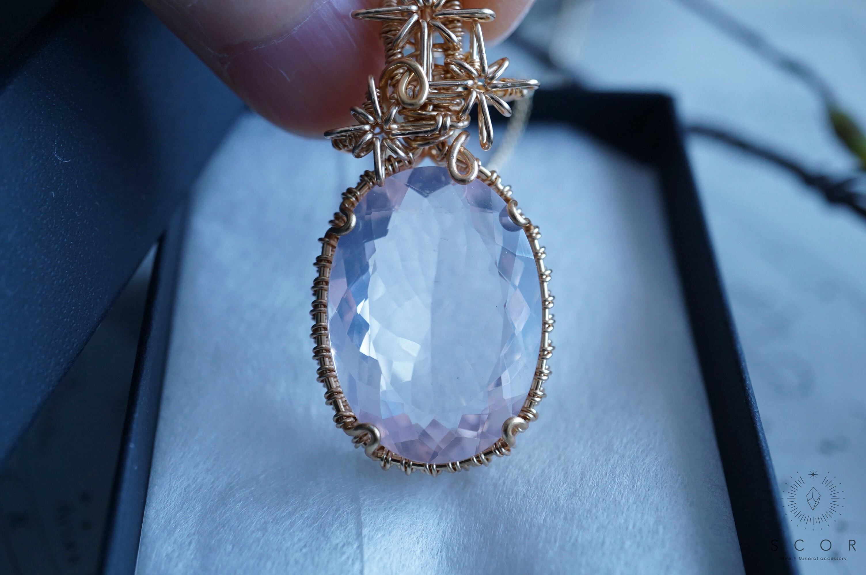 ローズクオーツは、たて25mm × よこ18mm(25.24ct)の特大サイズのファセットカットのピースを使用。