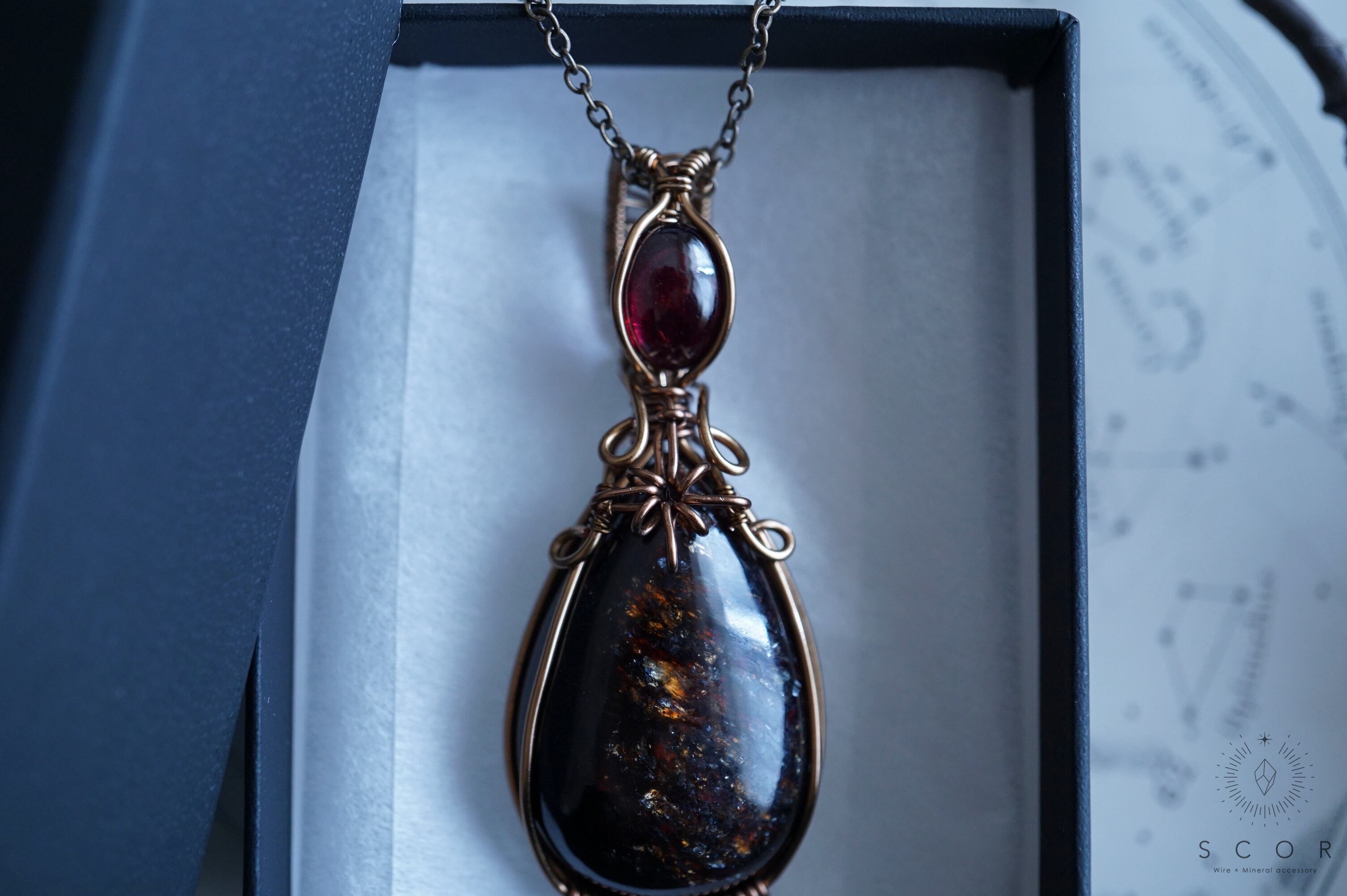 【動画あり】Two stars - 織物色の星・薔薇色の星 (pt364-br-gm) (バイオタイト・ロードライトガーネット ペンダントトップ)