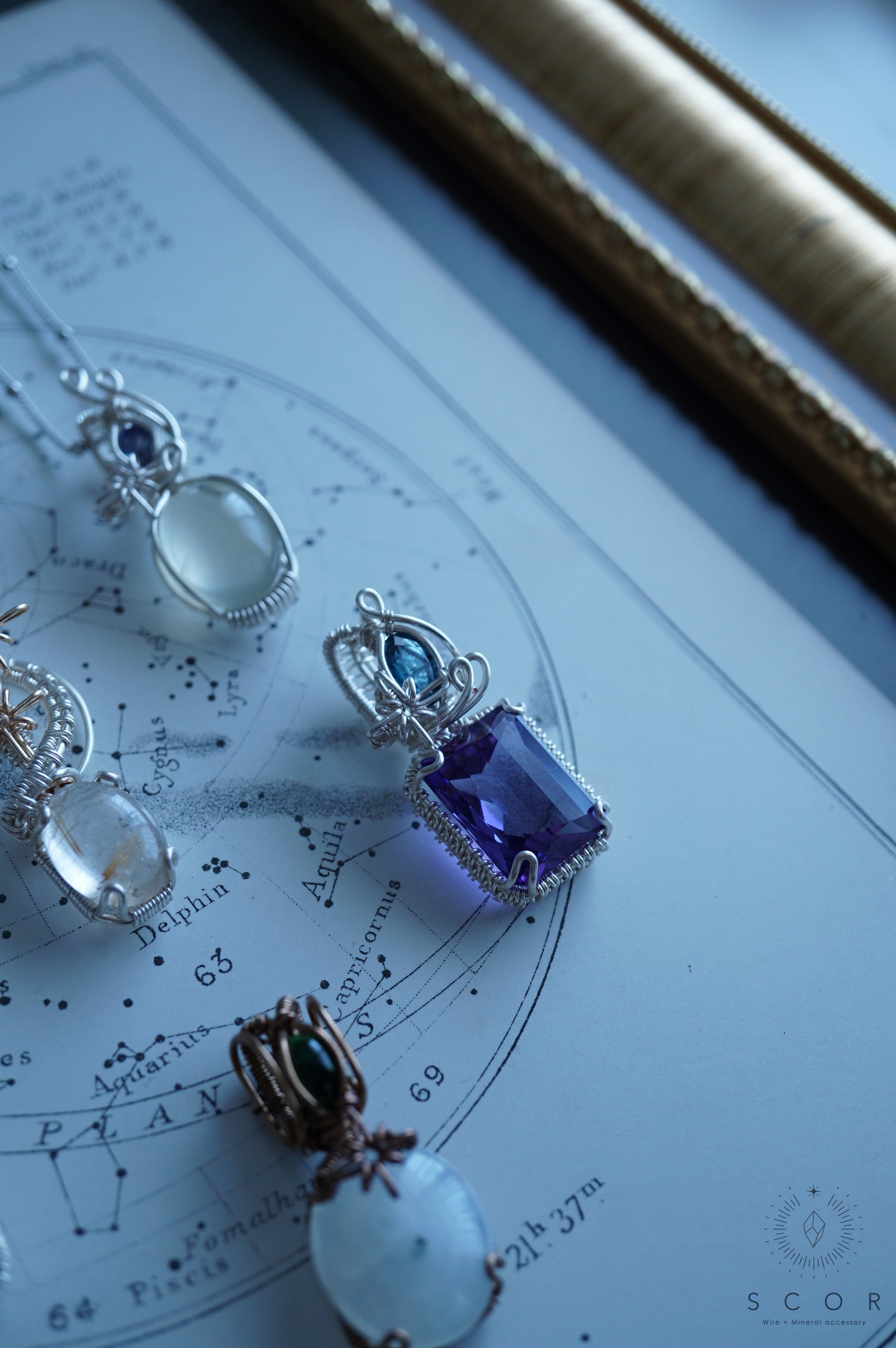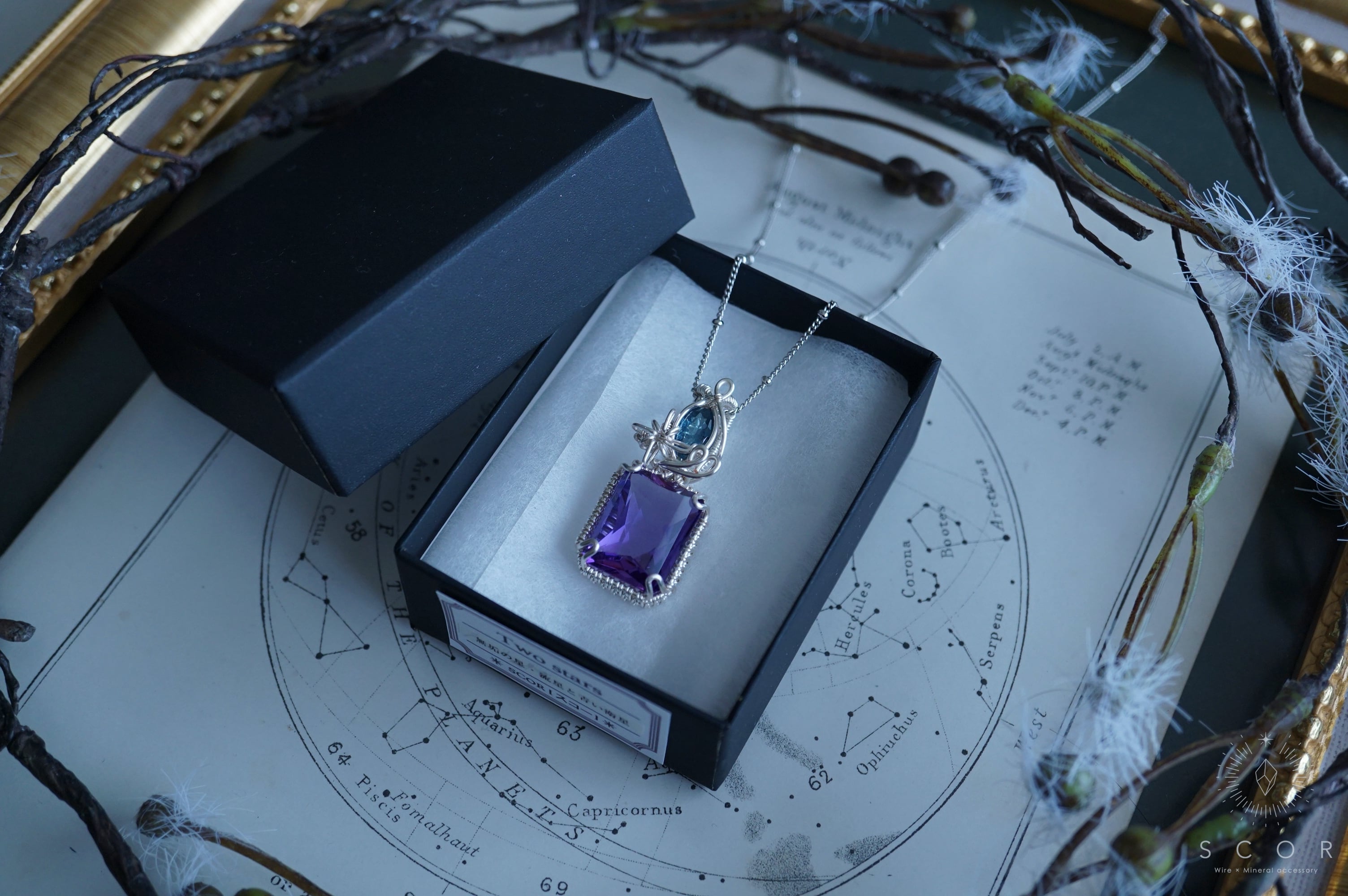 2つの石の間には、光芒型のワイヤーモチーフを配置し、くるりと弧を描くワイヤーの尾を添えて流星を表現。