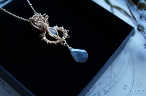 黒や濃い色の服と合わせると、2つの石の光沢色と、緻密なワイヤー装飾が際立ちます。