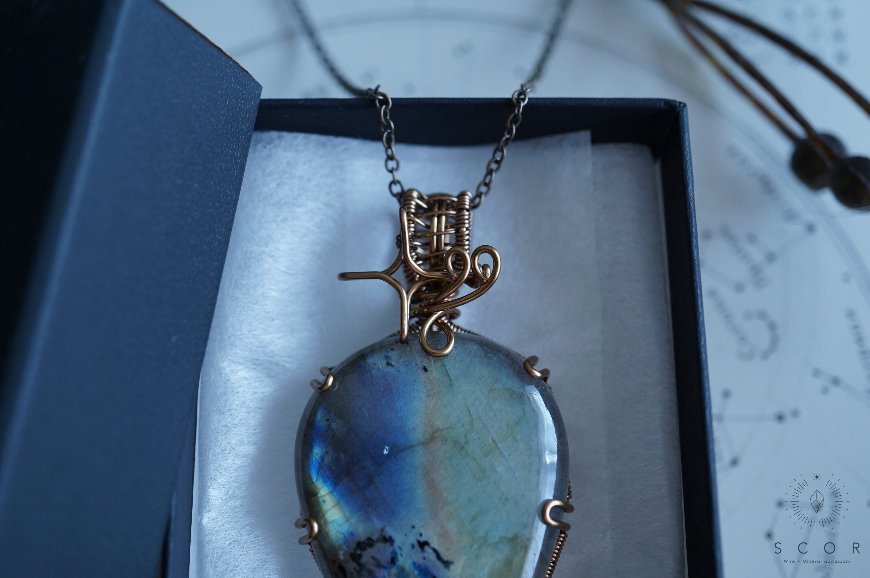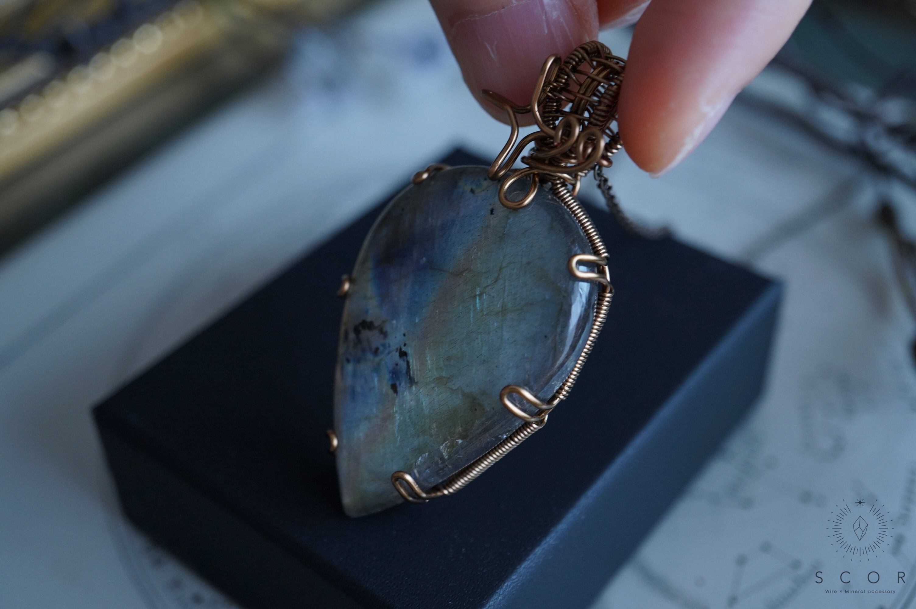 ラブラドライトの透明度が高いため、トップスの色が白や淡い場合は、光沢も淡く見え、黒や濃い色の服と合わせると、光沢色がより鮮やかに見えます。