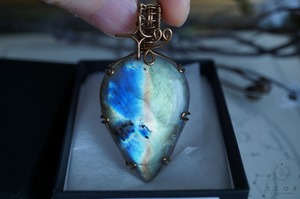 ラブラドライトは、たて42ミリ × よこ28ミリの特大サイズのペアシェイプカボションを使用。