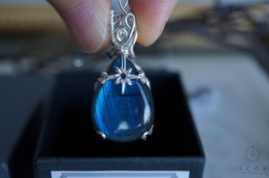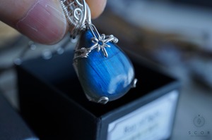 ラブラドライトの上部には、光芒型のワイヤーモチーフを配置。