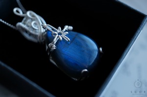 ラブラドライトは、ペアシェイプのカボションを使用。