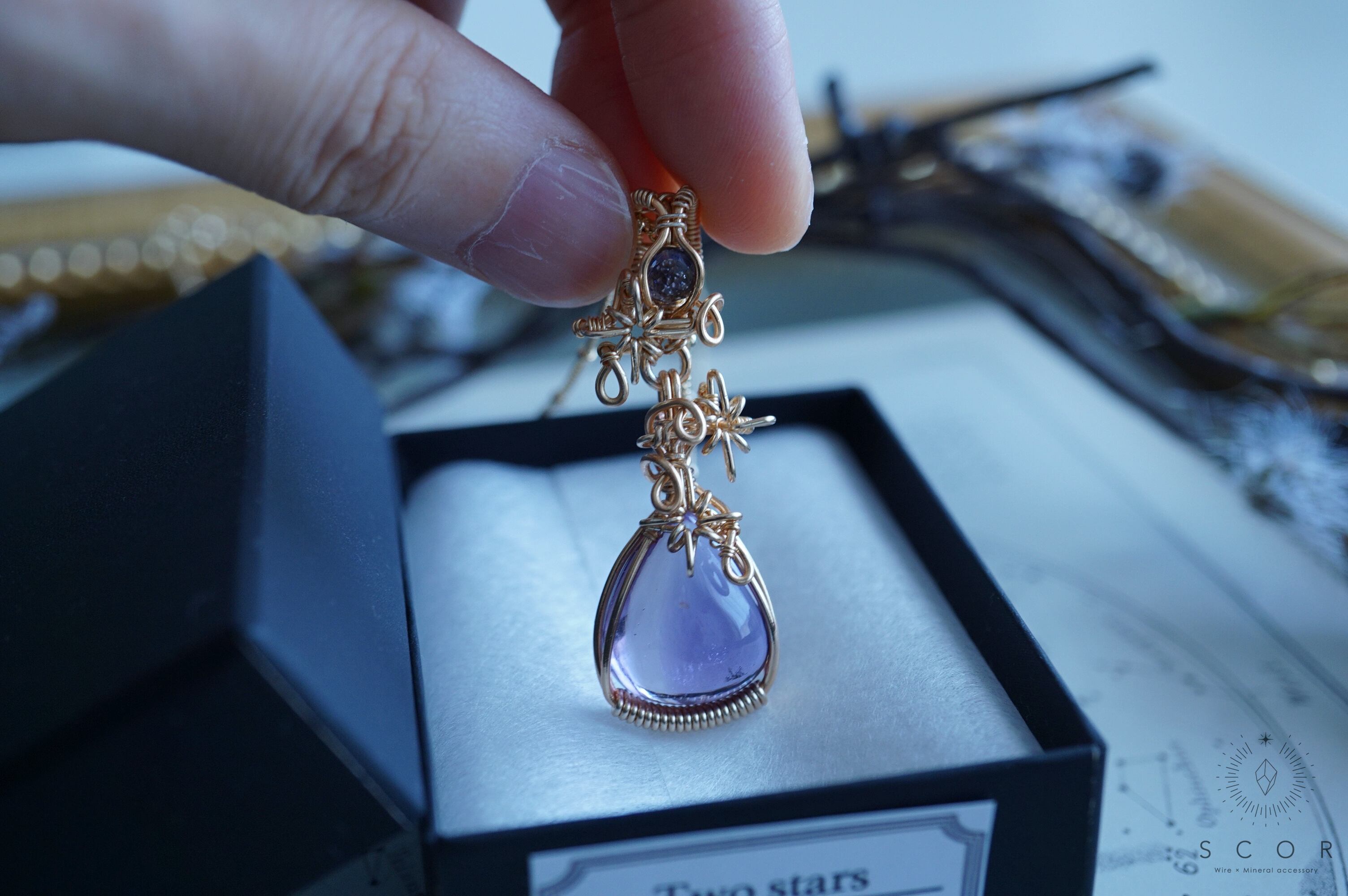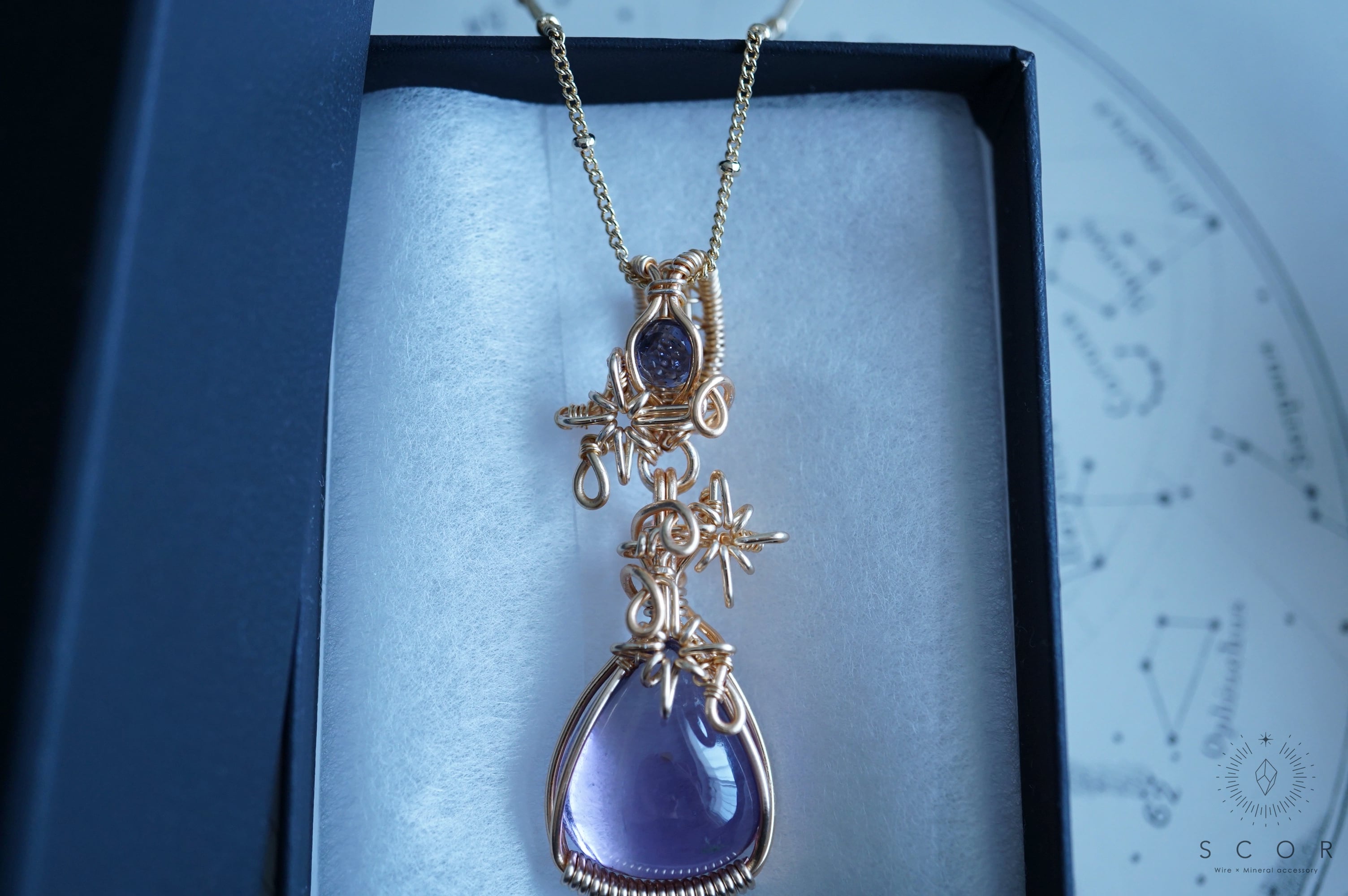 アメジストとアイオライトの間に添えた、光芒型や雫型のワイヤーモチーフは、滴るような星の煌めきを表現しています。