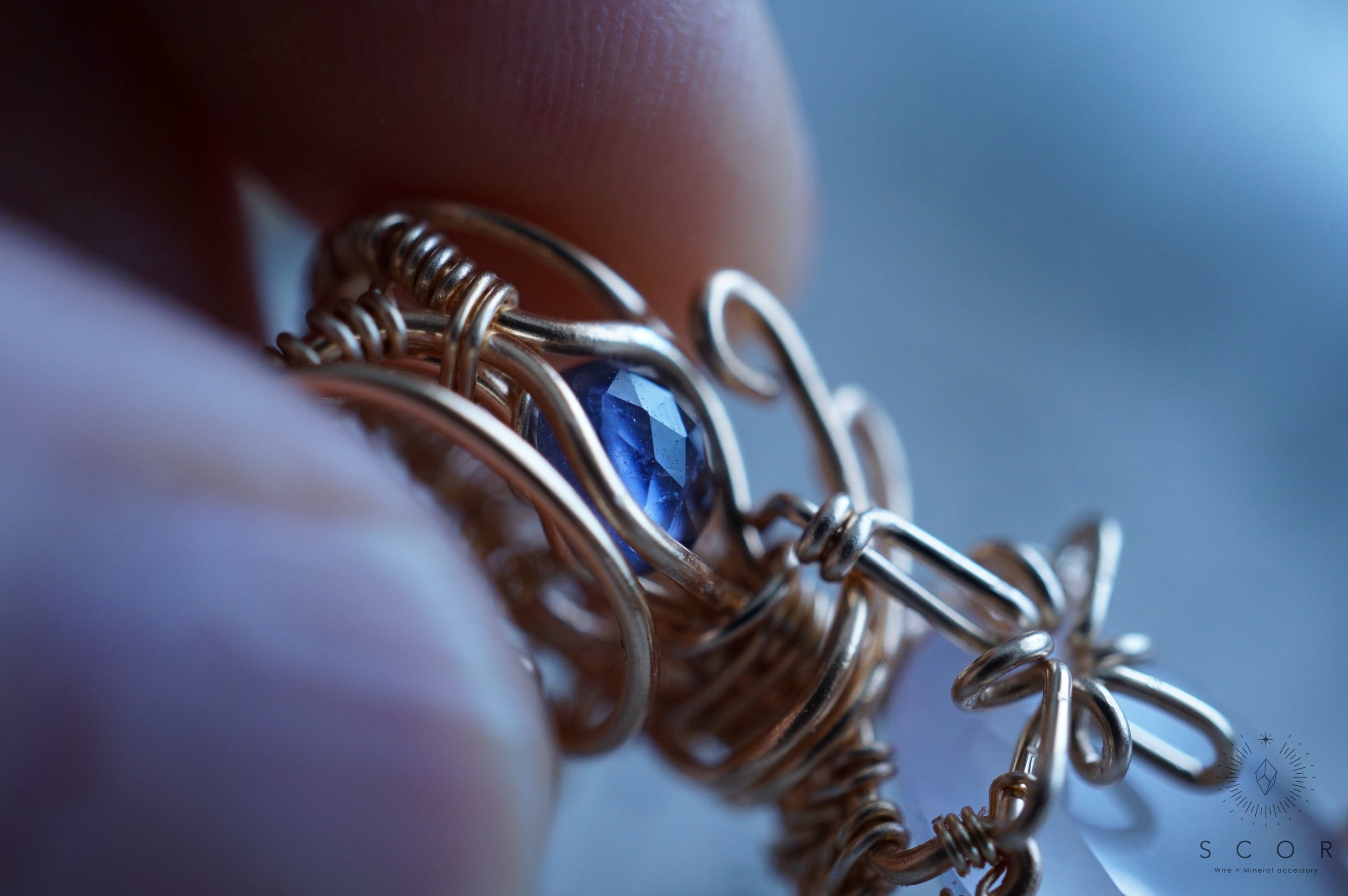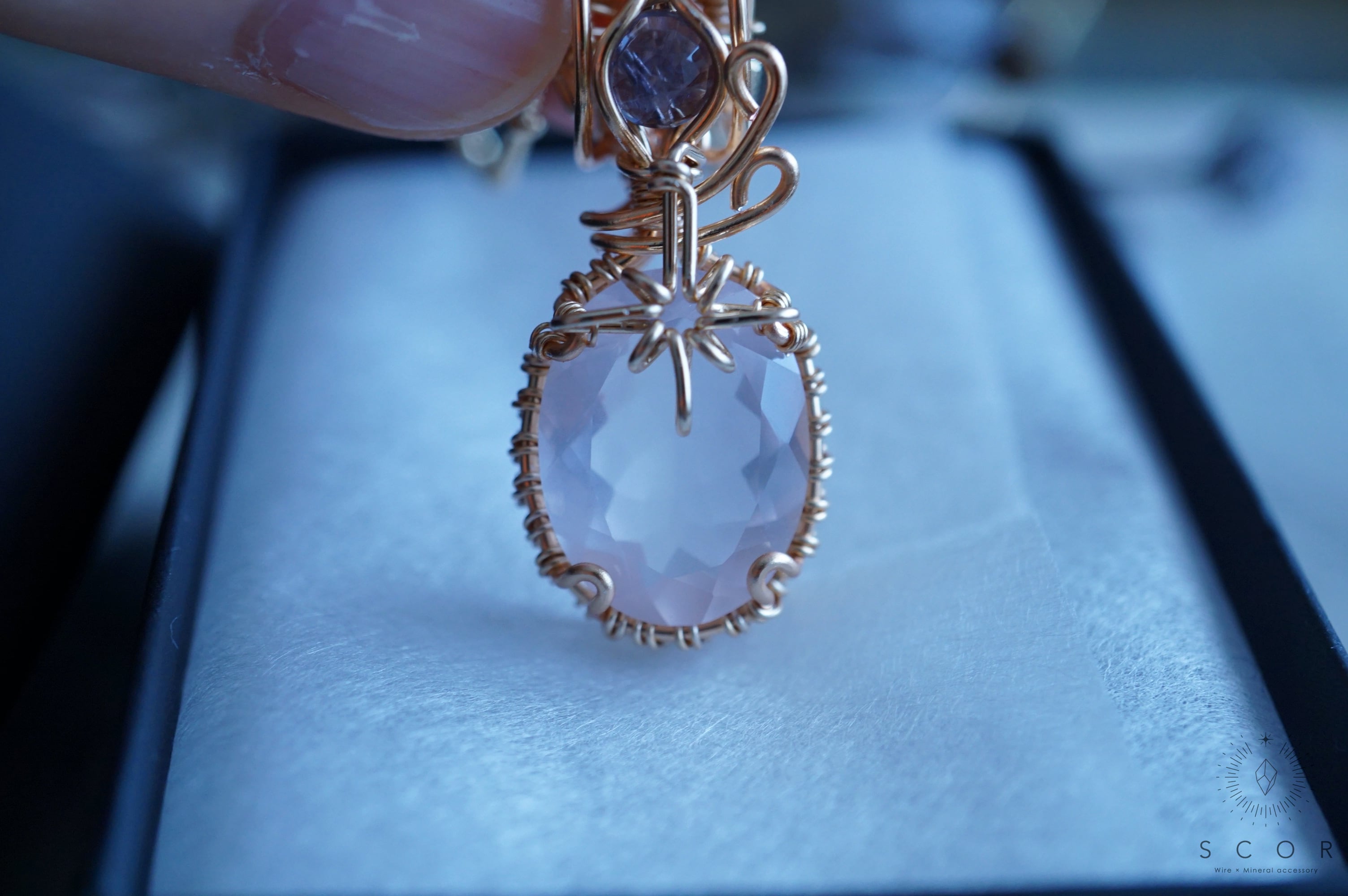 ローズクオーツの上部には、流星をイメージした光芒型のワイヤーモチーフを配置。
